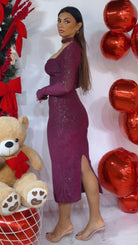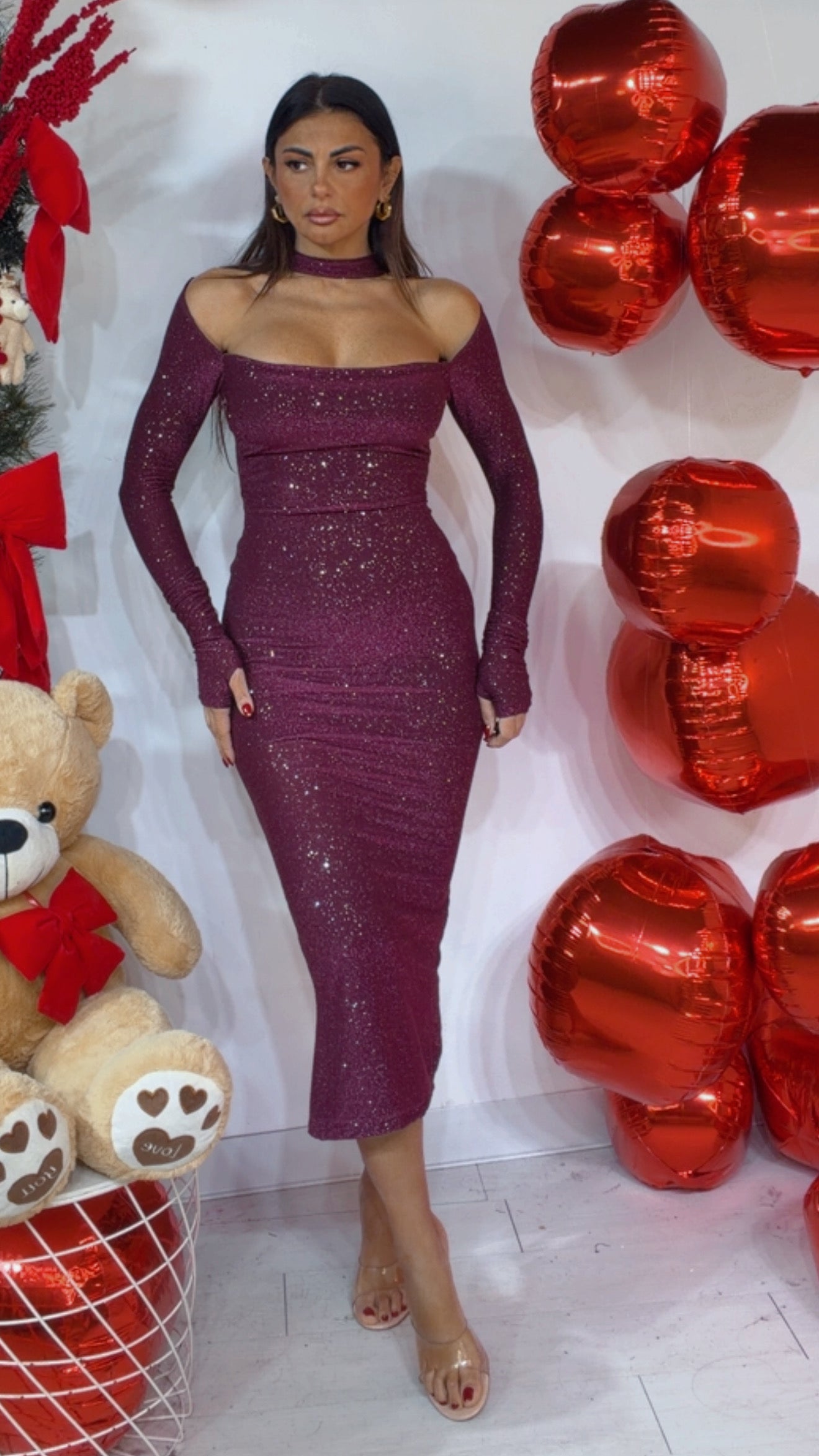 Abito con ‘Colletto’, scollo a ‘Barca’, effetto ‘Guanto’, ‘Spacco’ centrale sul retro. Leggermente in ‘Trasparenza’, ‘Glitterato’.