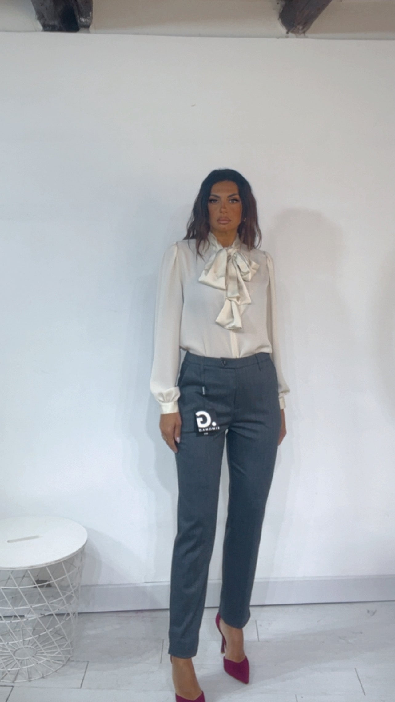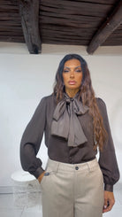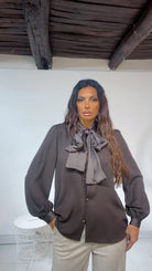 Camicia ‘Simona G’ con ‘Fiocco’ regolabile, spalline leggermente ‘Plissè’, manica leggermente a ‘Sbuffo’, chiusura bottoni ‘Gold’. In ‘Georgette’, Dettagli in ‘Raso’.