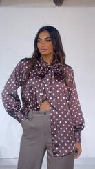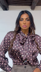 Camicia 'Simona G' in tessuto di raso luminoso con <pois> crema e rosa su fondo cioccolato.Presenta una <fusciacca> al collo,da annodare a fiocco o lasciare morbida,e piccoli bottoni sul davanti.Modello semplice da una vestibilità regolare e da una lunghezza leggermente lunga.