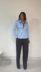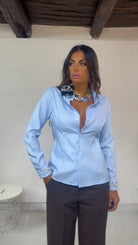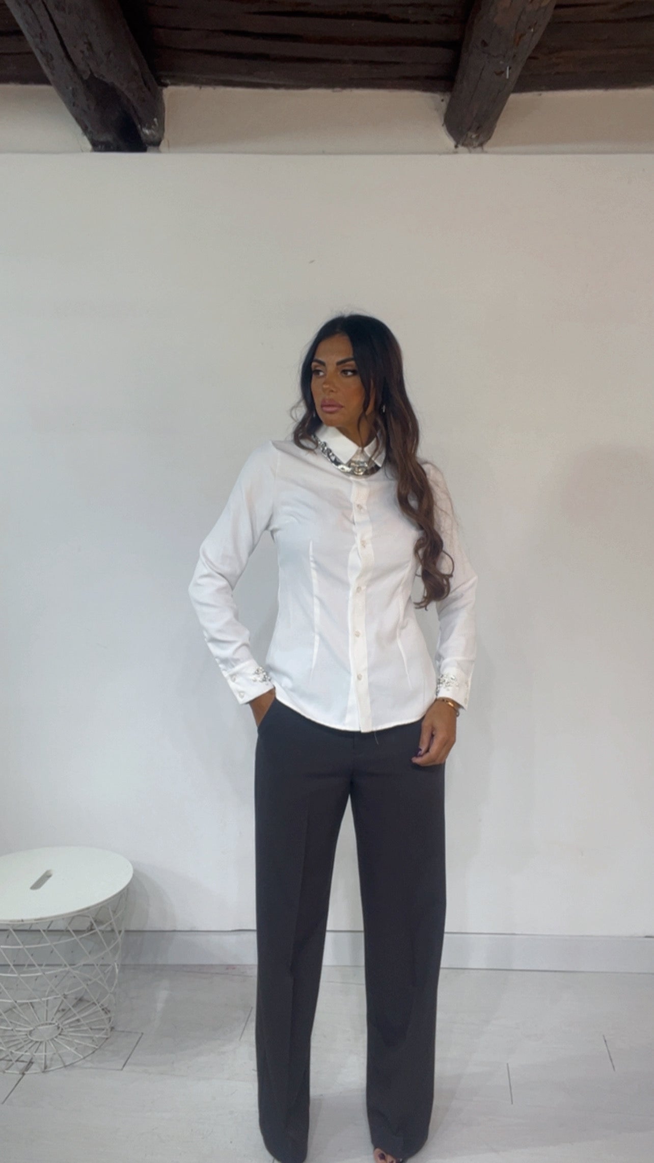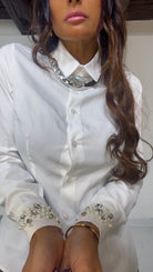 Camicia ‘Simona G’ con ‘Riprese’, polso con applicazione di ‘Perle e Pietre Chiare’. Modello ‘Oxford’, ‘Avvitata’. In ‘Cotone’.