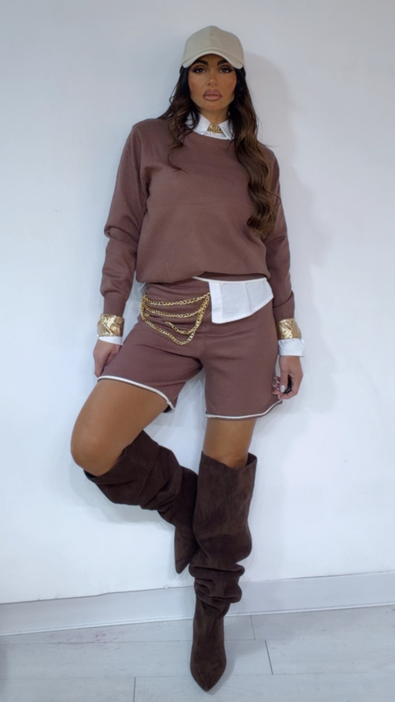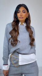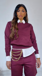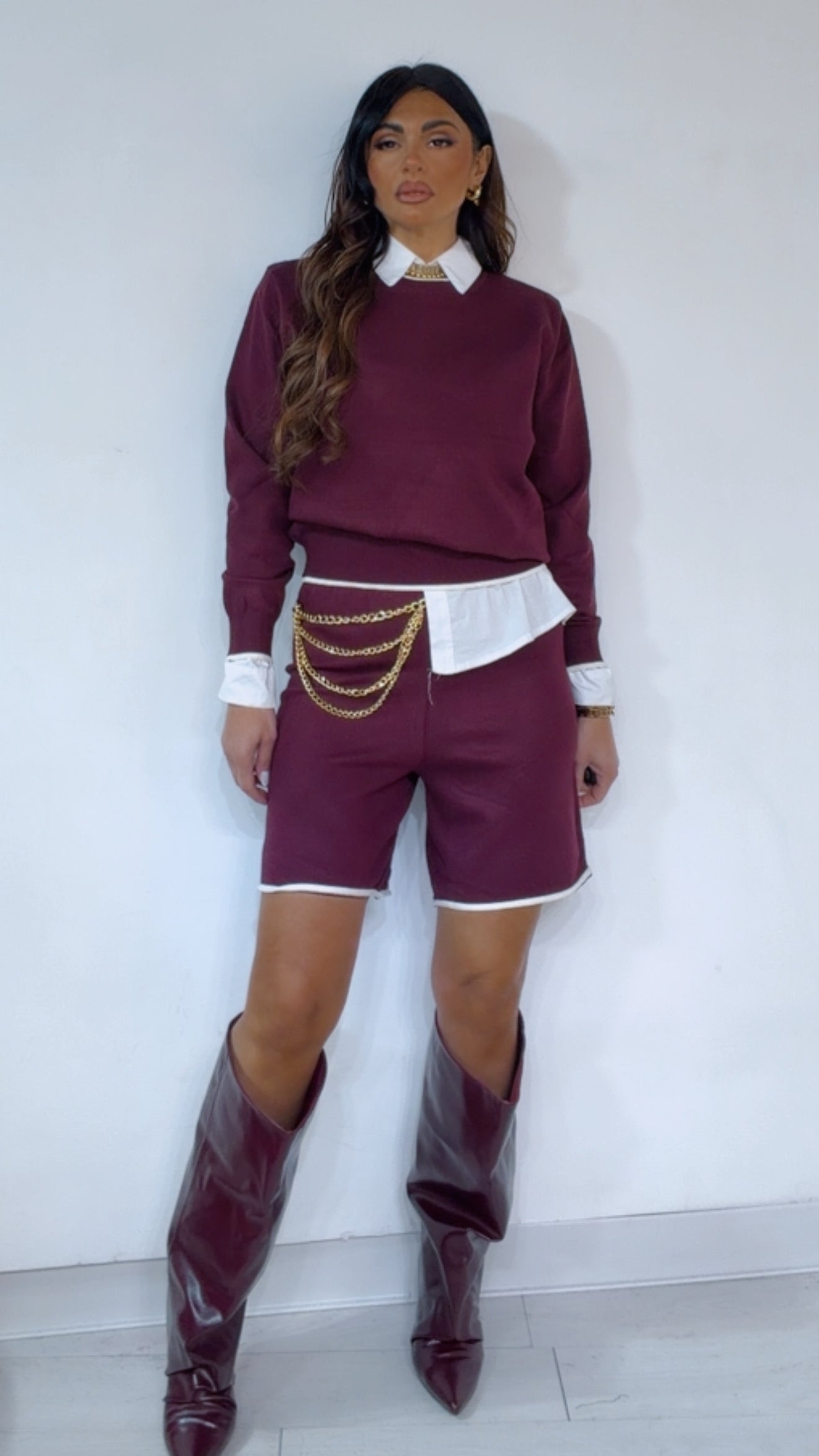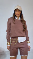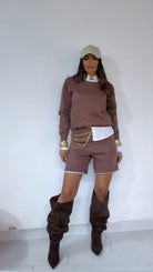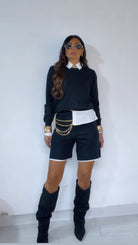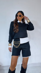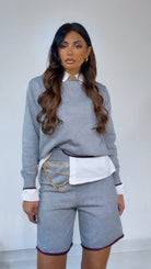 Coord Set in ‘Lanetta’ con ‘Bordino’ a ‘Contrasto’ composto da: Maglioncino ‘Girocollo’. Bermuda con ‘Elastico’ in vita.