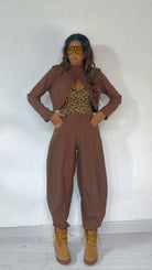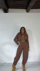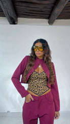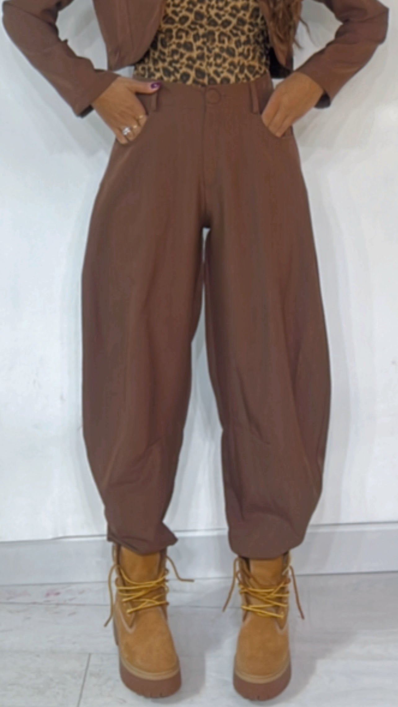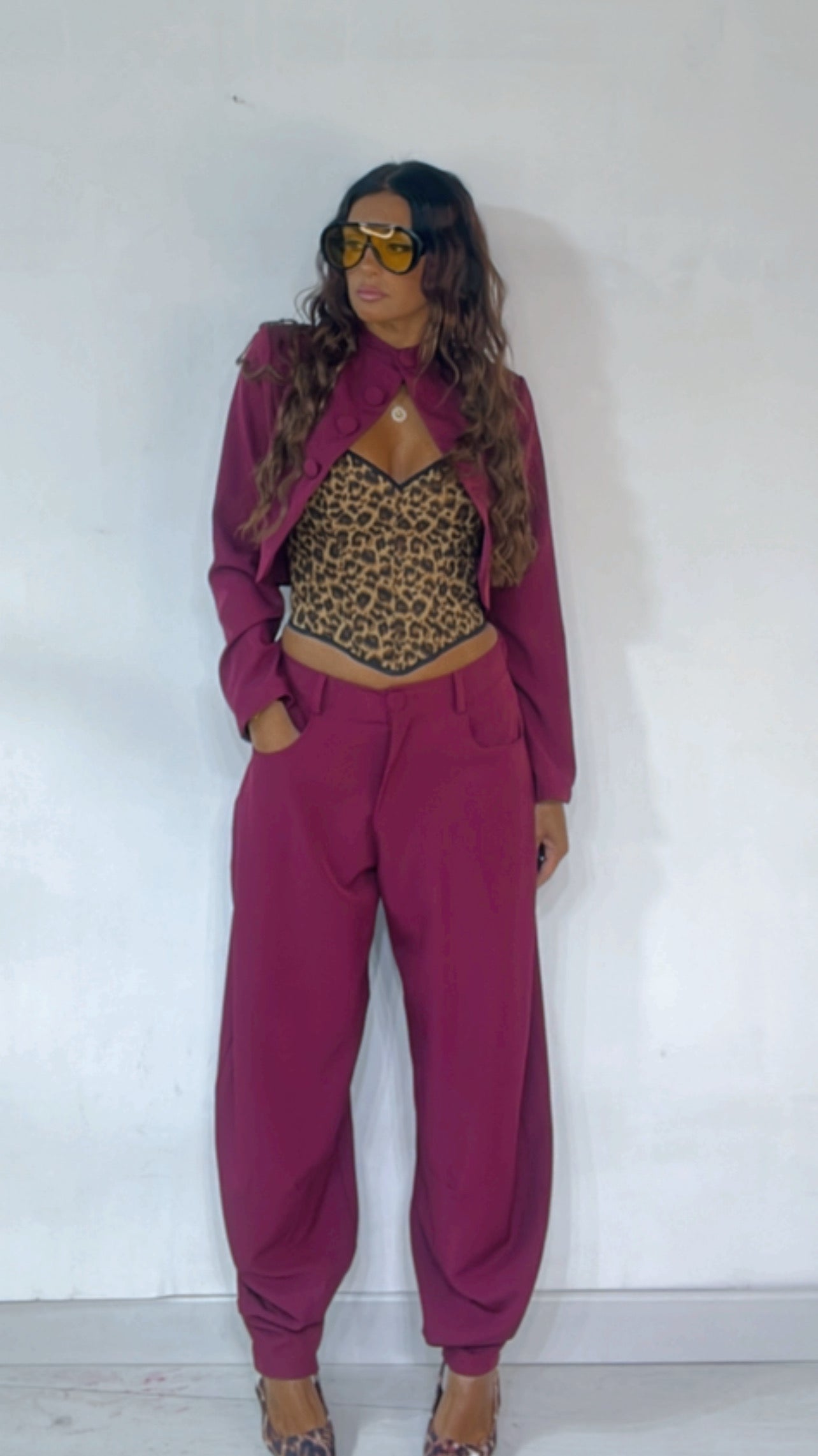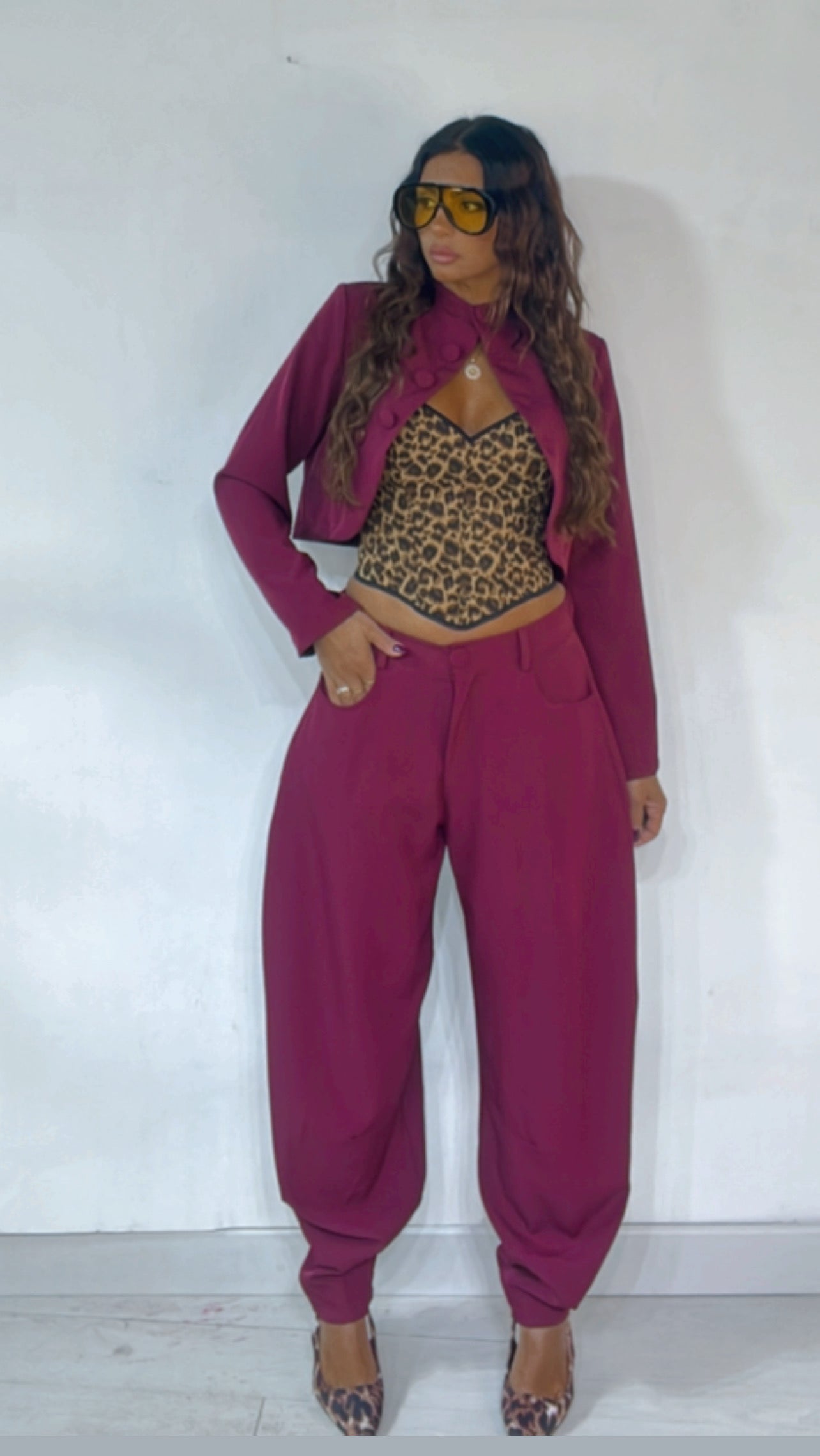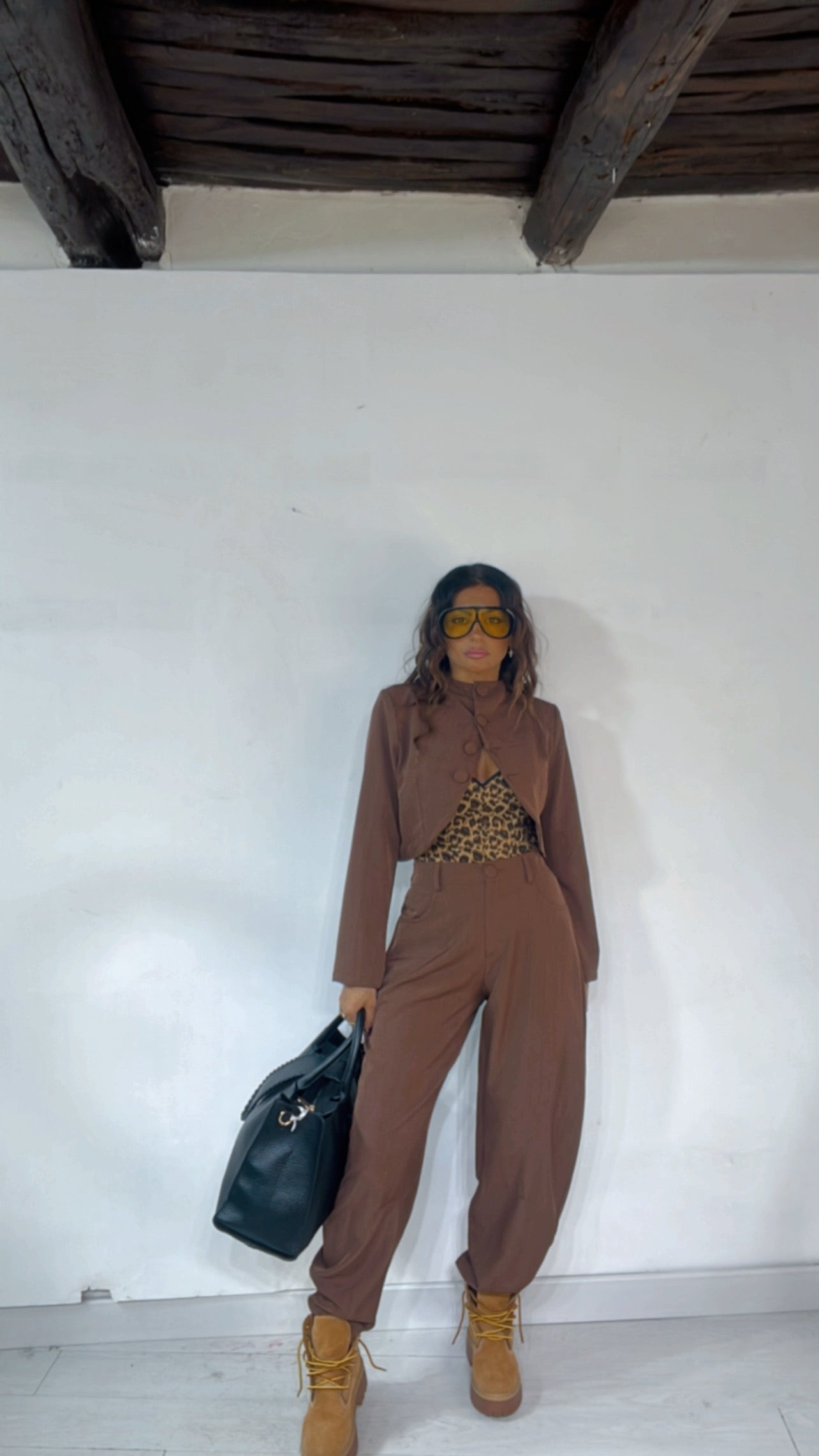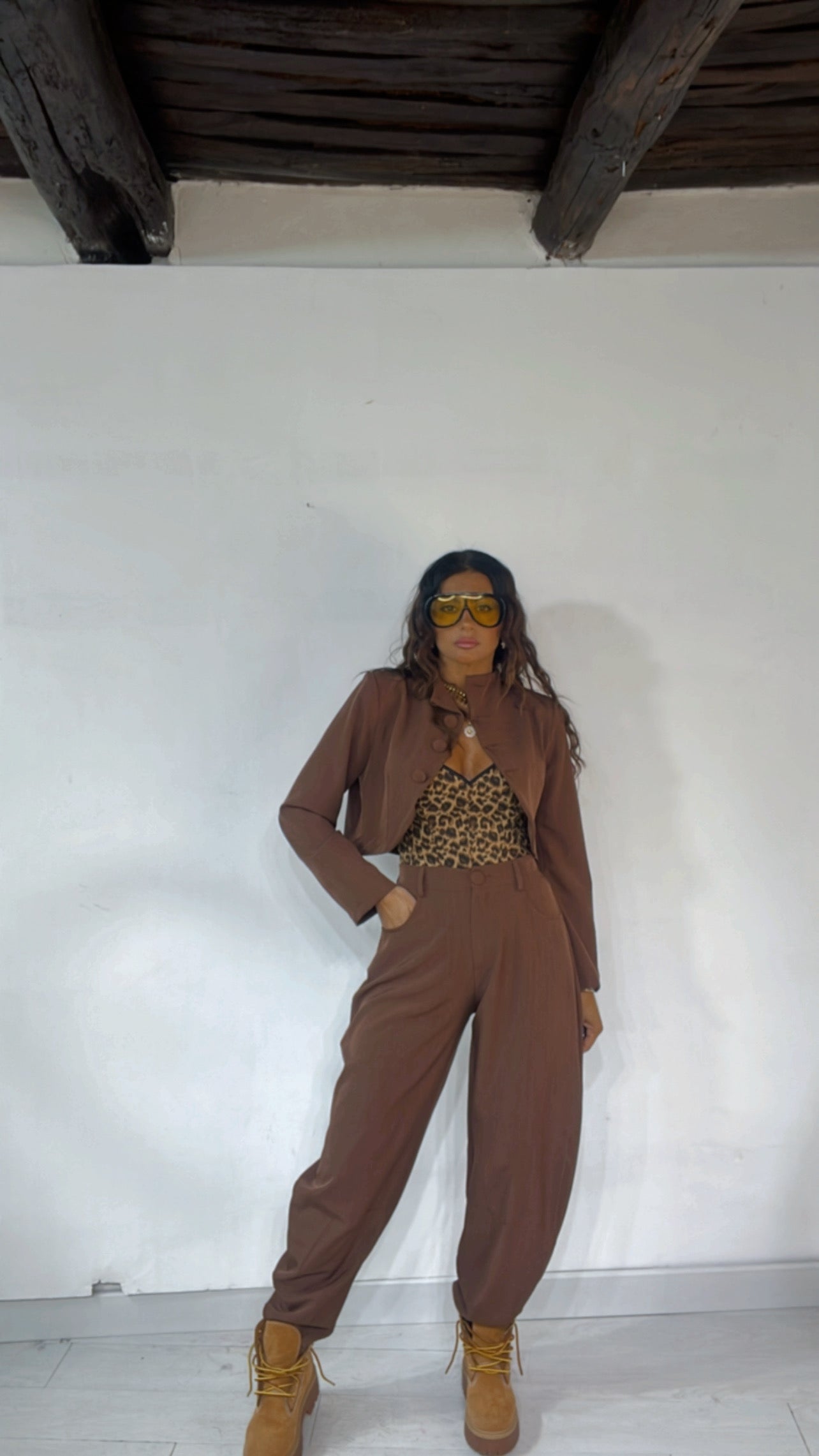 Tailleur composto da: Giacchino chiusura ‘Bottoni Foderati. Leggermente ‘Crop’. Pantalone vita alta con ‘Elastico’ sul retro. Modello ‘Balloon’.