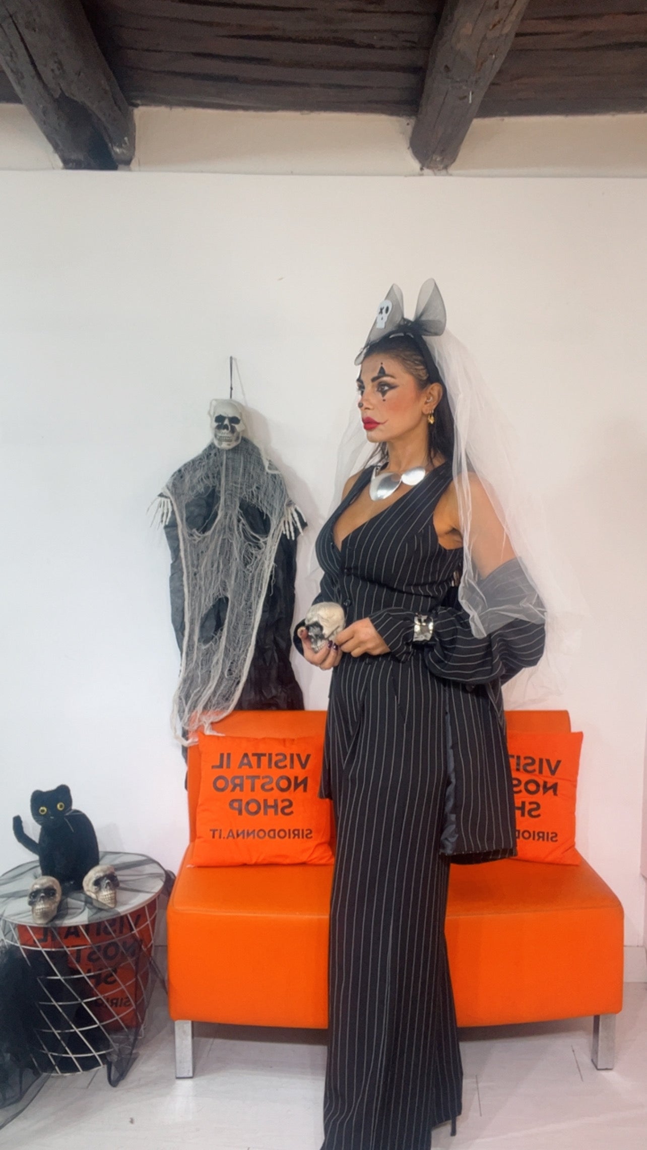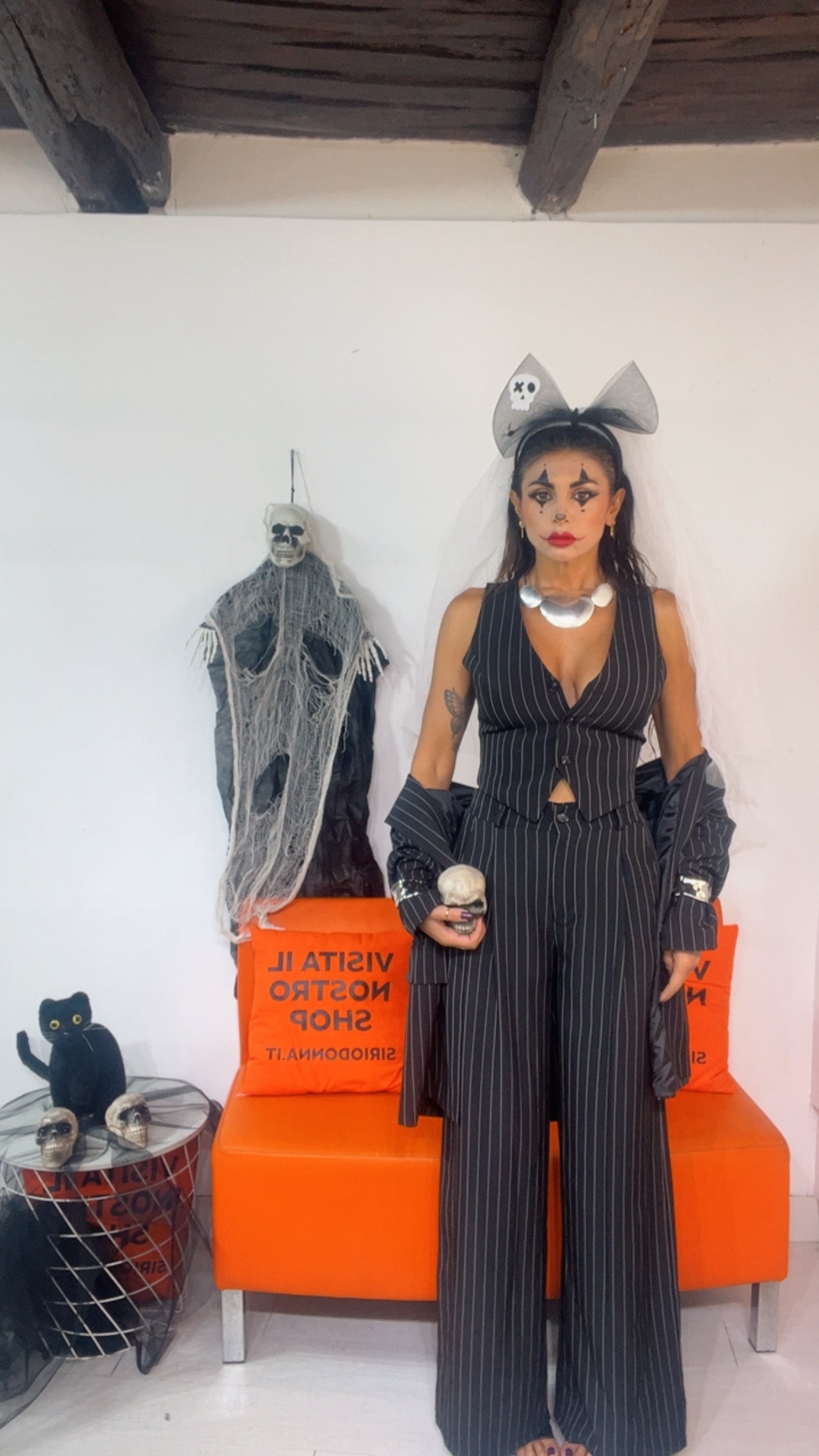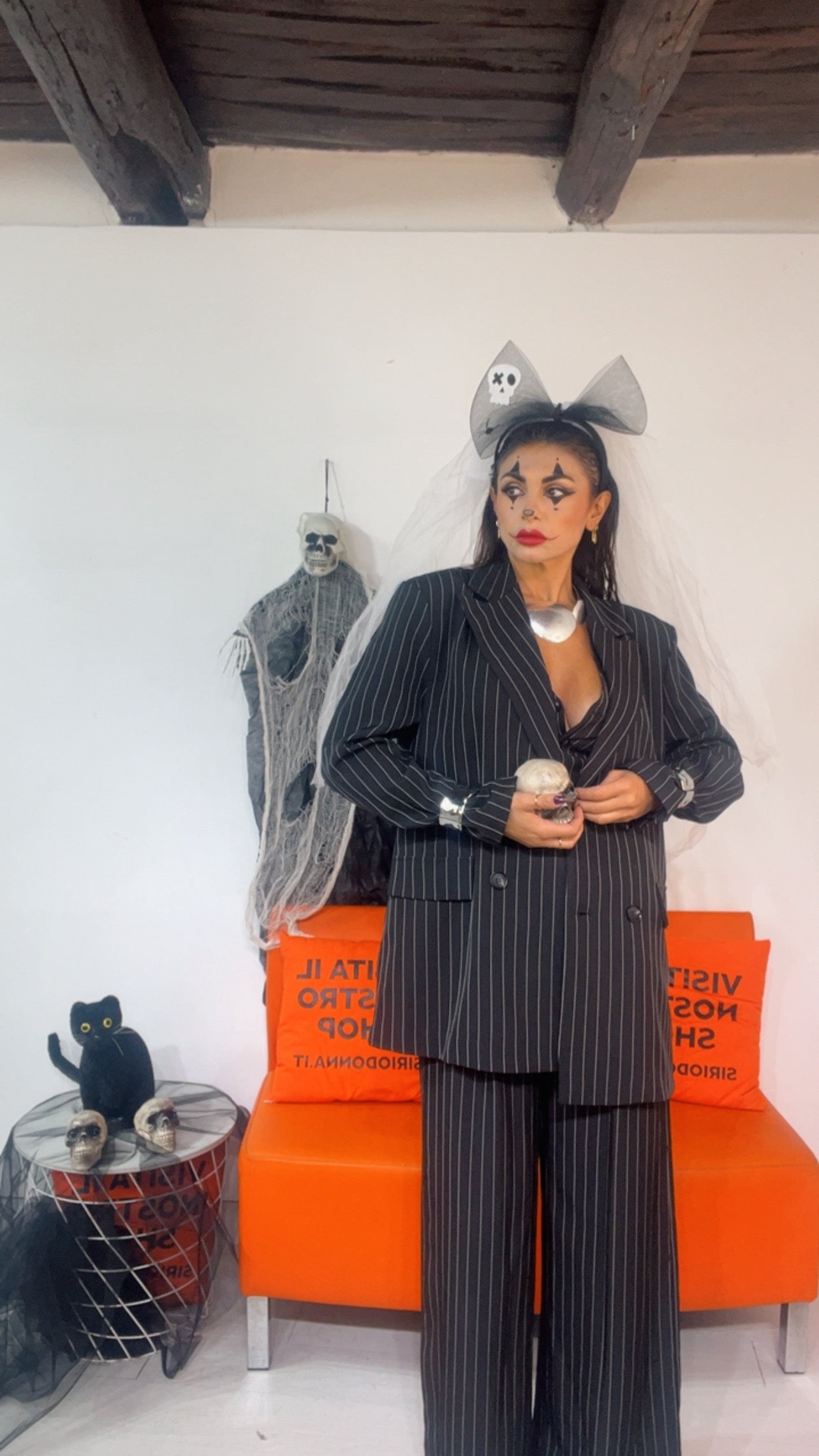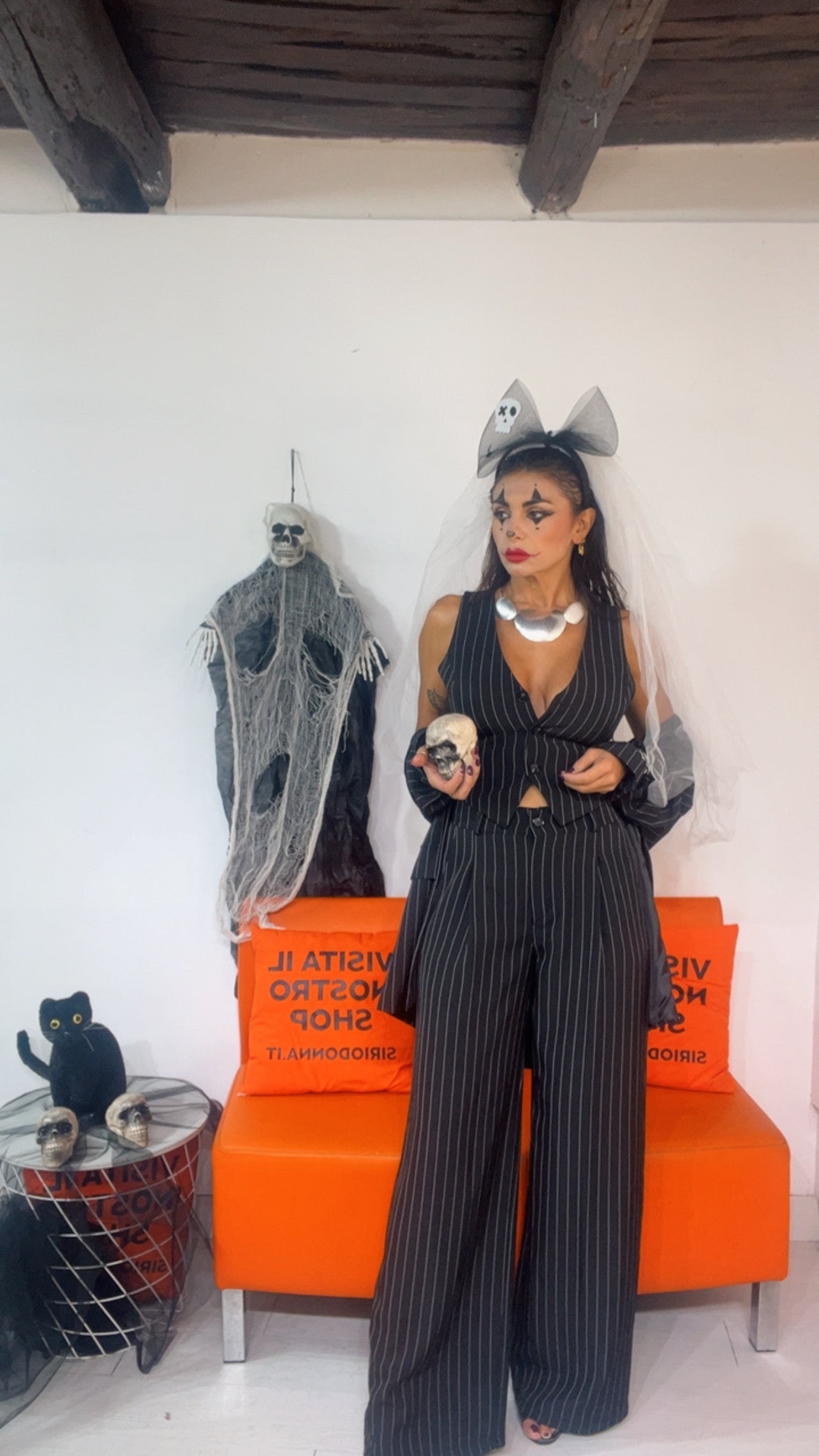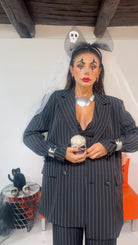 Tailleur tre pezzi composto da giacca,gilet e pantalone.Giacca modello over doppio petto;gilet coordinato con bottoni frontali e pantalone modello palazzo,vita alta dalla linea amplia e fluida.