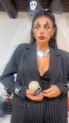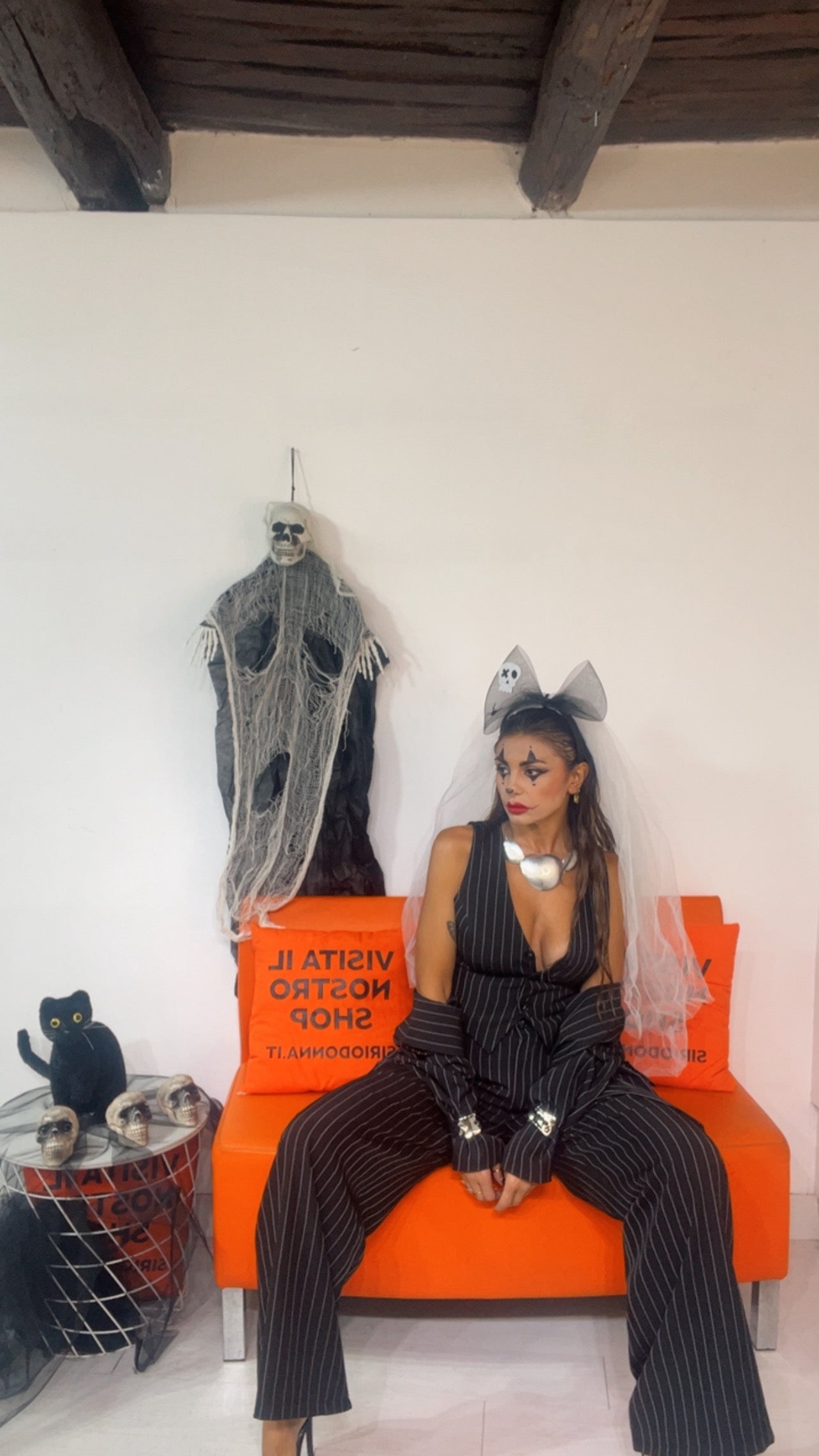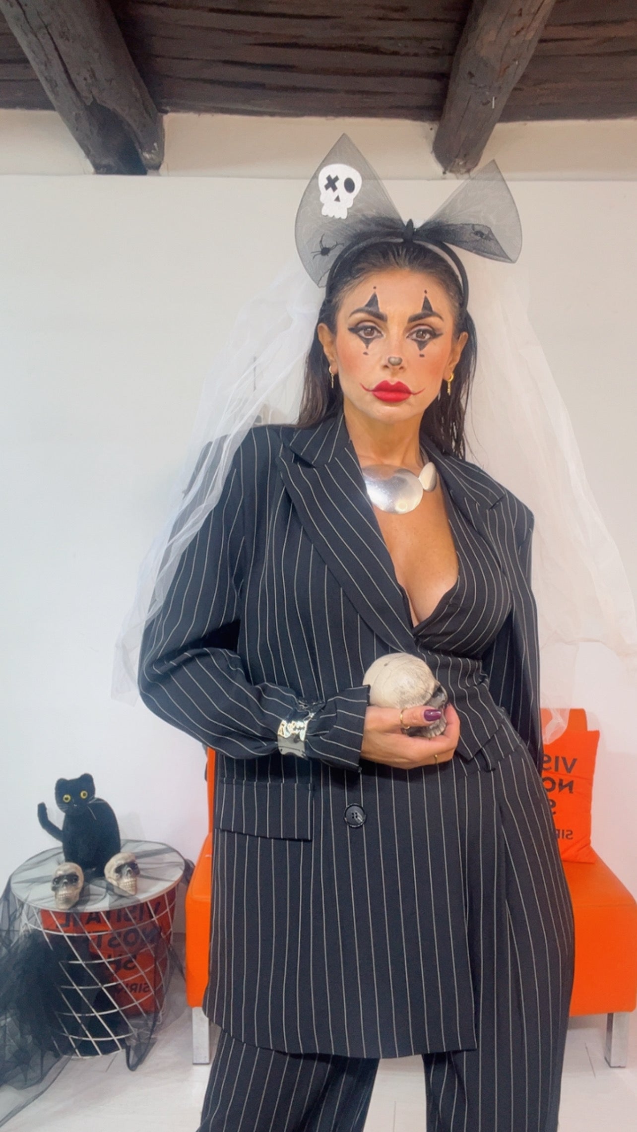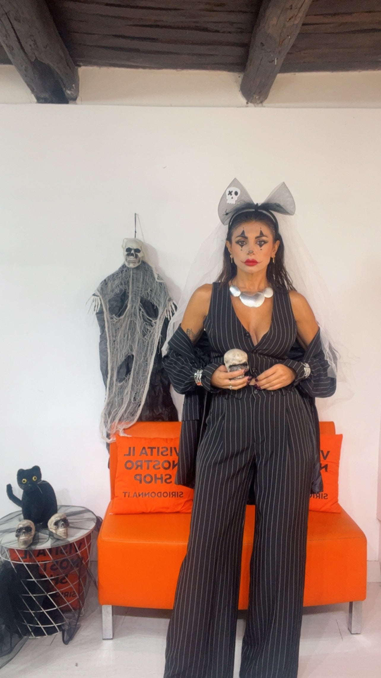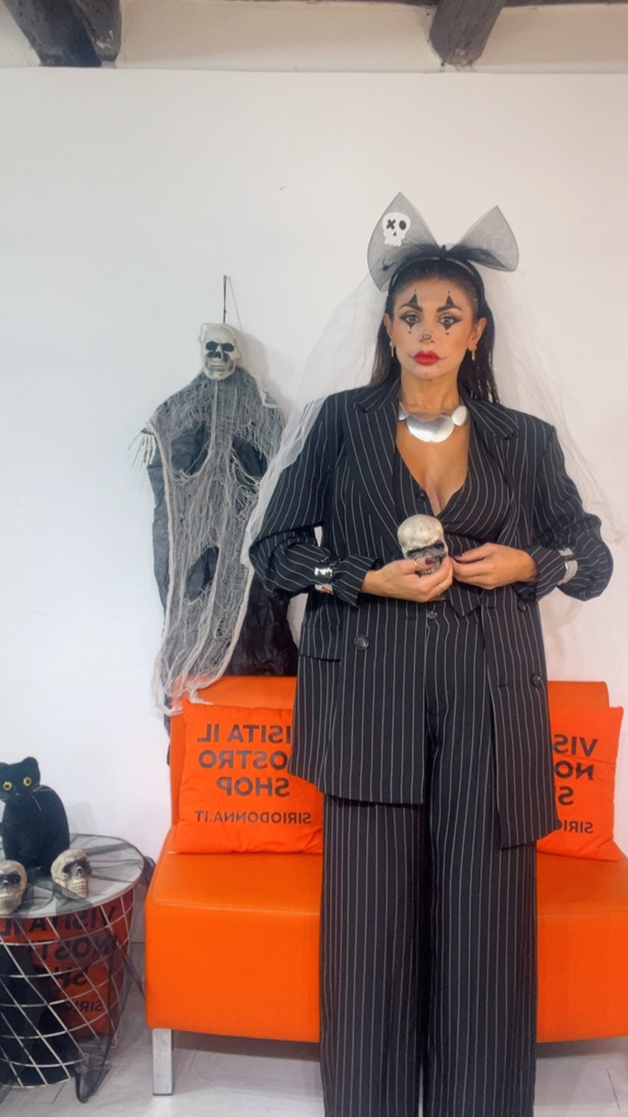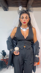 Tailleur tre pezzi composto da giacca,gilet e pantalone.Giacca modello over doppio petto;gilet coordinato con bottoni frontali e pantalone modello palazzo,vita alta dalla linea amplia e fluida.