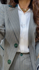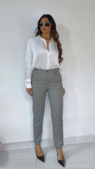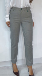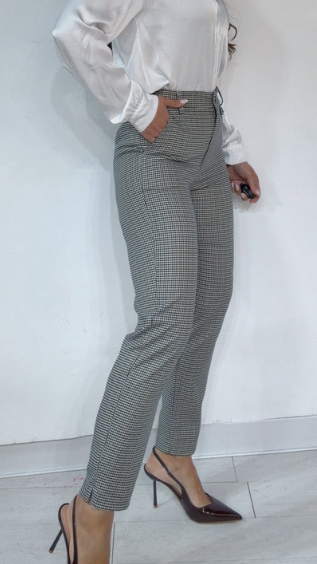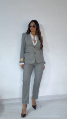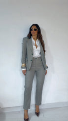 Tailleur ‘Simona G’-‘Fit Slim’ fantasia ‘Quadrettini’, in ‘Lanetta Pettinata’ composto da: Giacca con ‘Spalline’ e ‘Pettine’, ‘Inserti’ in ‘Raso’. MonoPetto. Pantalone vita alta, ‘Spacchetti’ laterali. Modello ‘Sigaretta’ alla ‘Caviglia’.