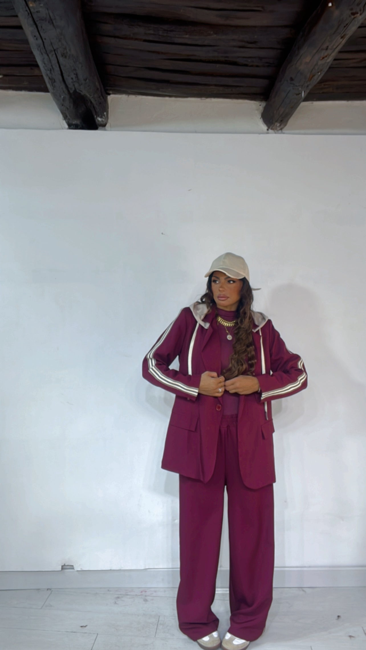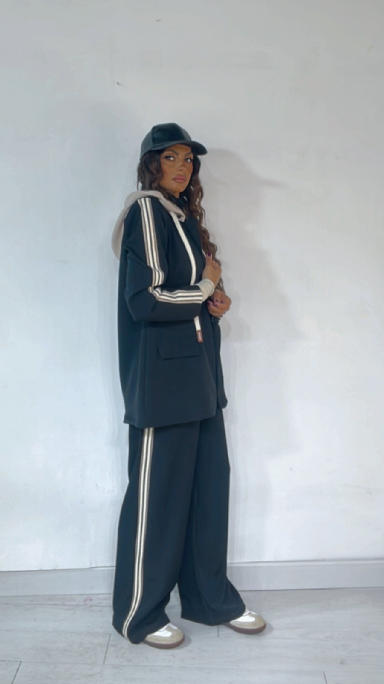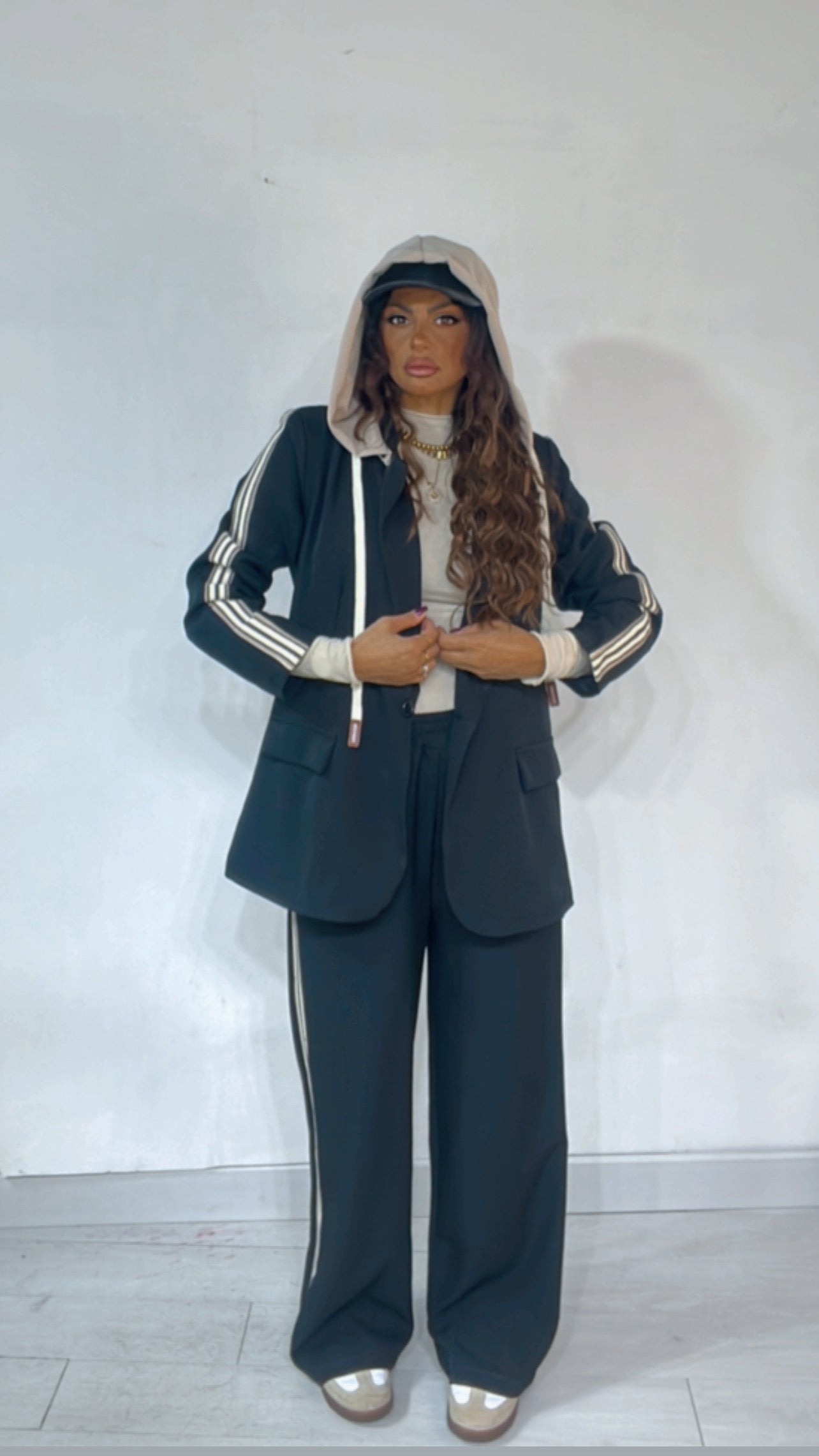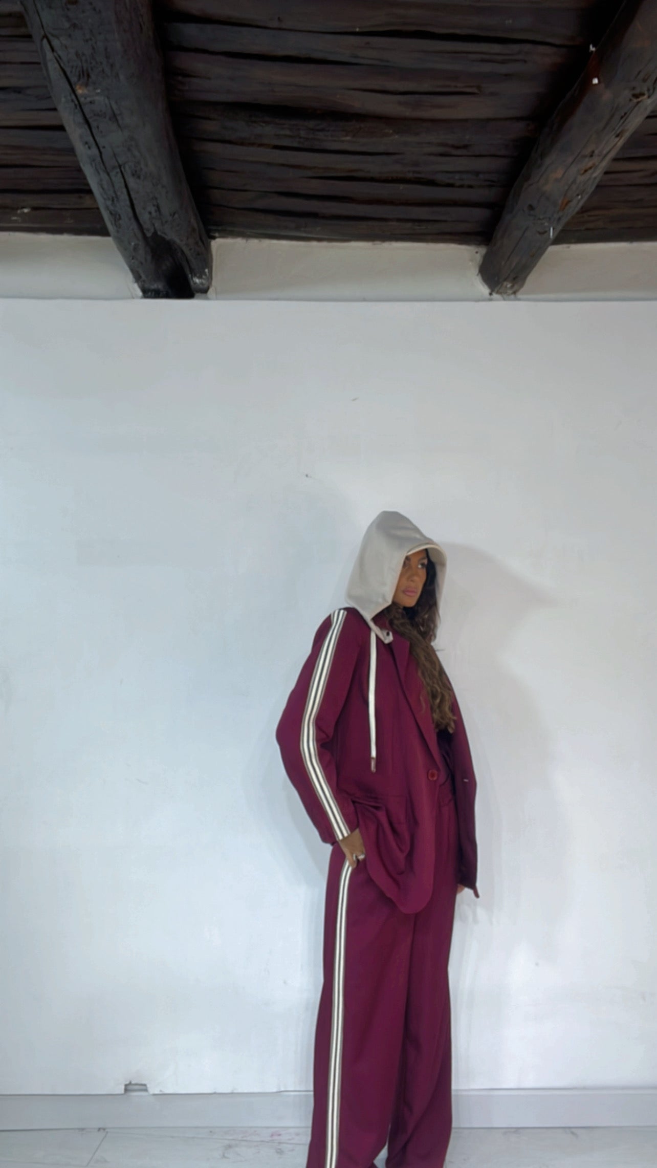 Tailleur in ‘Tessuto’ composto da: Giacca con ‘Spalline e Pettine’, con ‘Bande Laterali’ a contrasto, ‘Cappuccio Removibile’. Pantalone da indossare sia vita alta/vita bassa con ‘Elastico’, ‘Bande Laterali’ a contrasto. Modello a ‘Palazzo’.