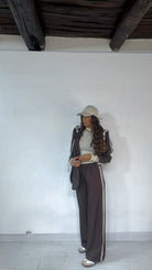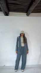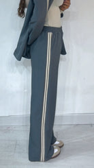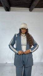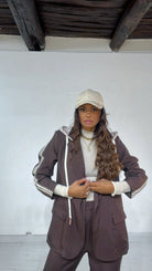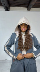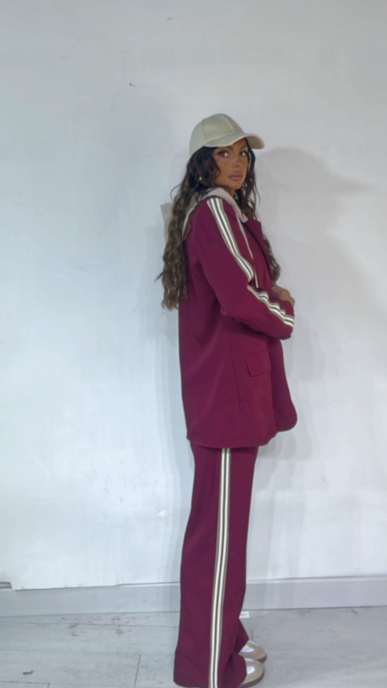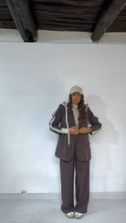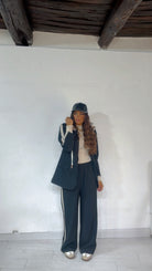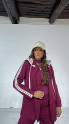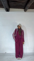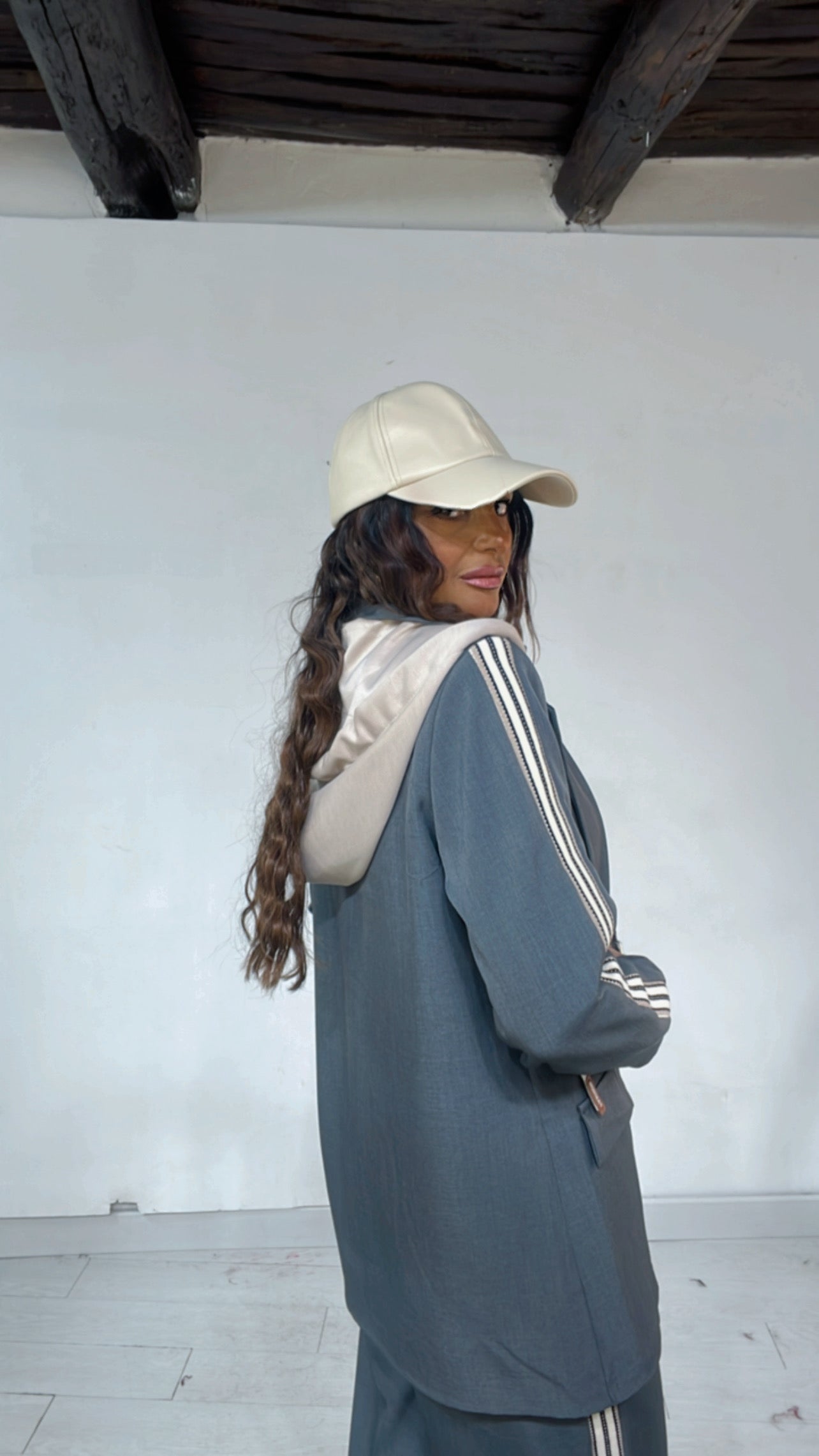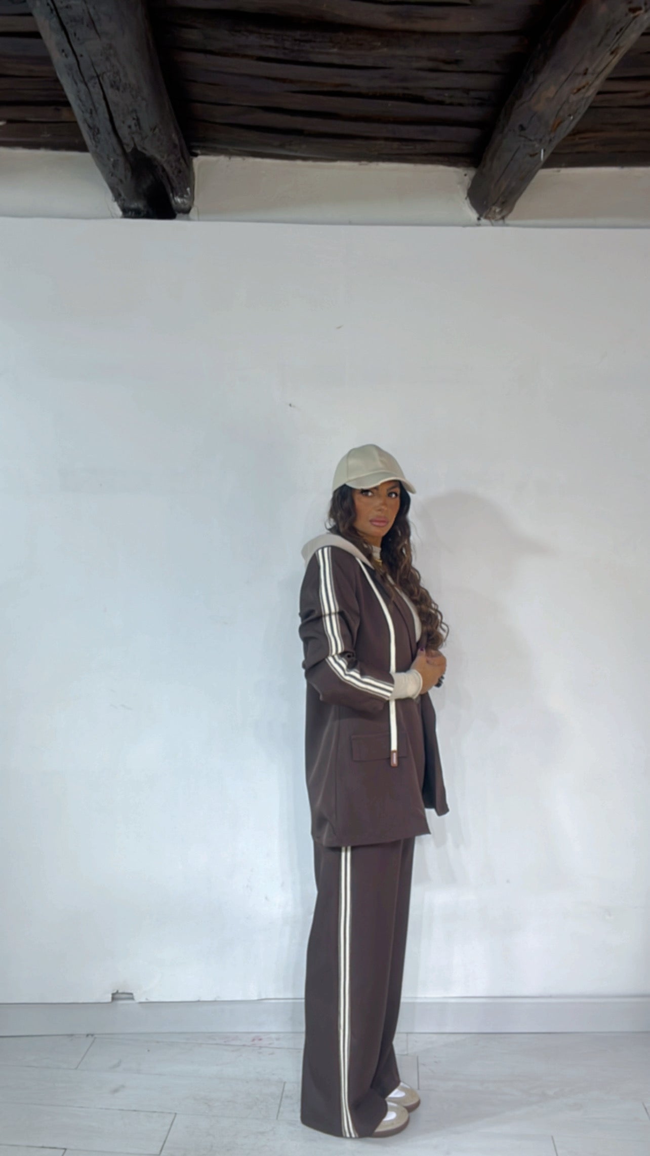 Tailleur in ‘Tessuto’ composto da: Giacca con ‘Spalline e Pettine’, con ‘Bande Laterali’ a contrasto, ‘Cappuccio Removibile’. Pantalone da indossare sia vita alta/vita bassa con ‘Elastico’, ‘Bande Laterali’ a contrasto. Modello a ‘Palazzo’.