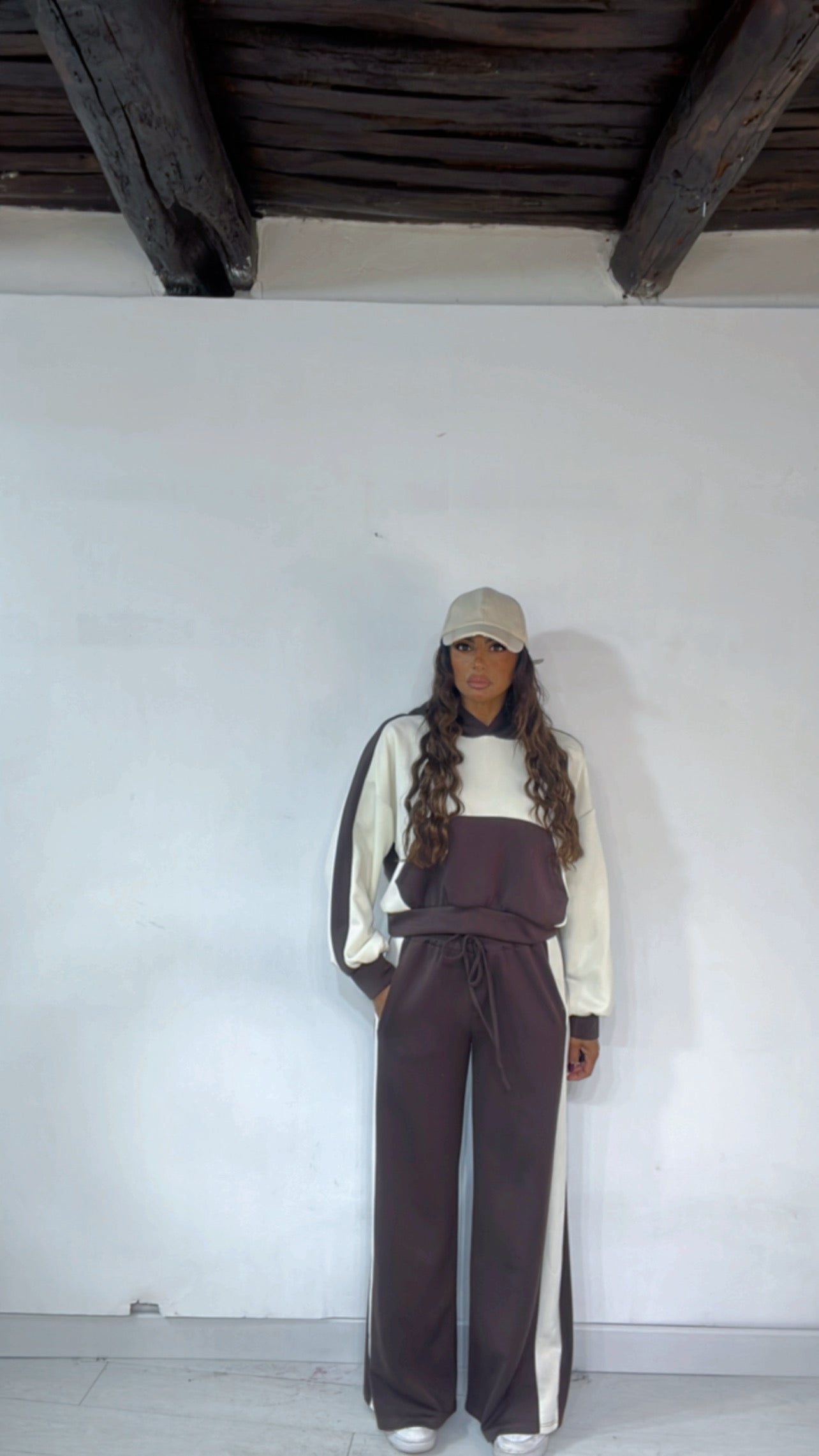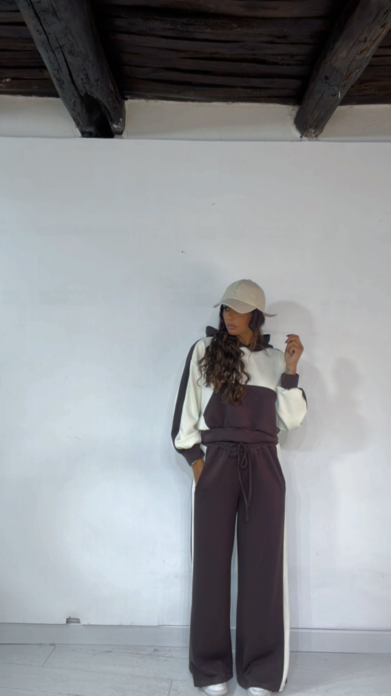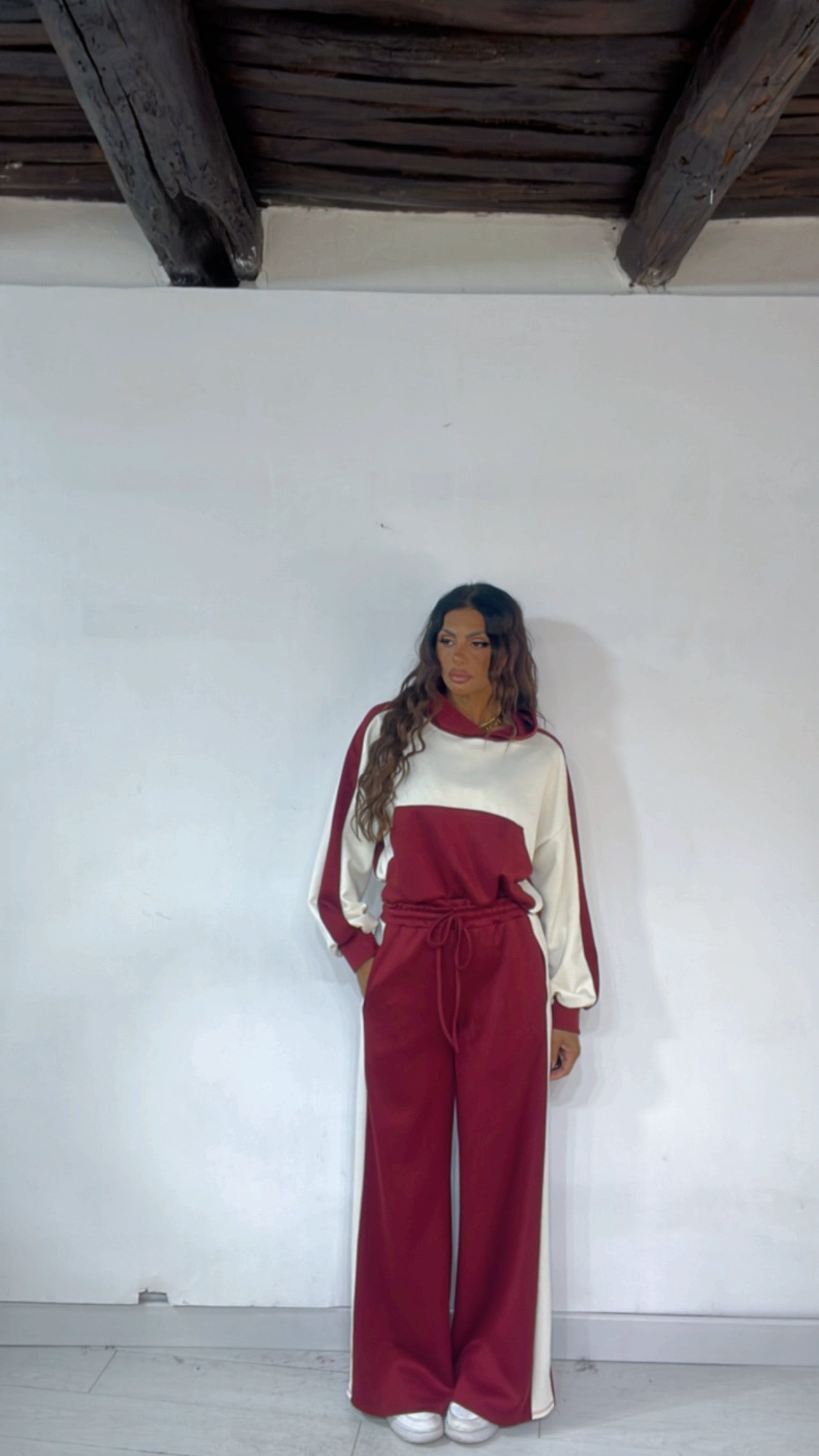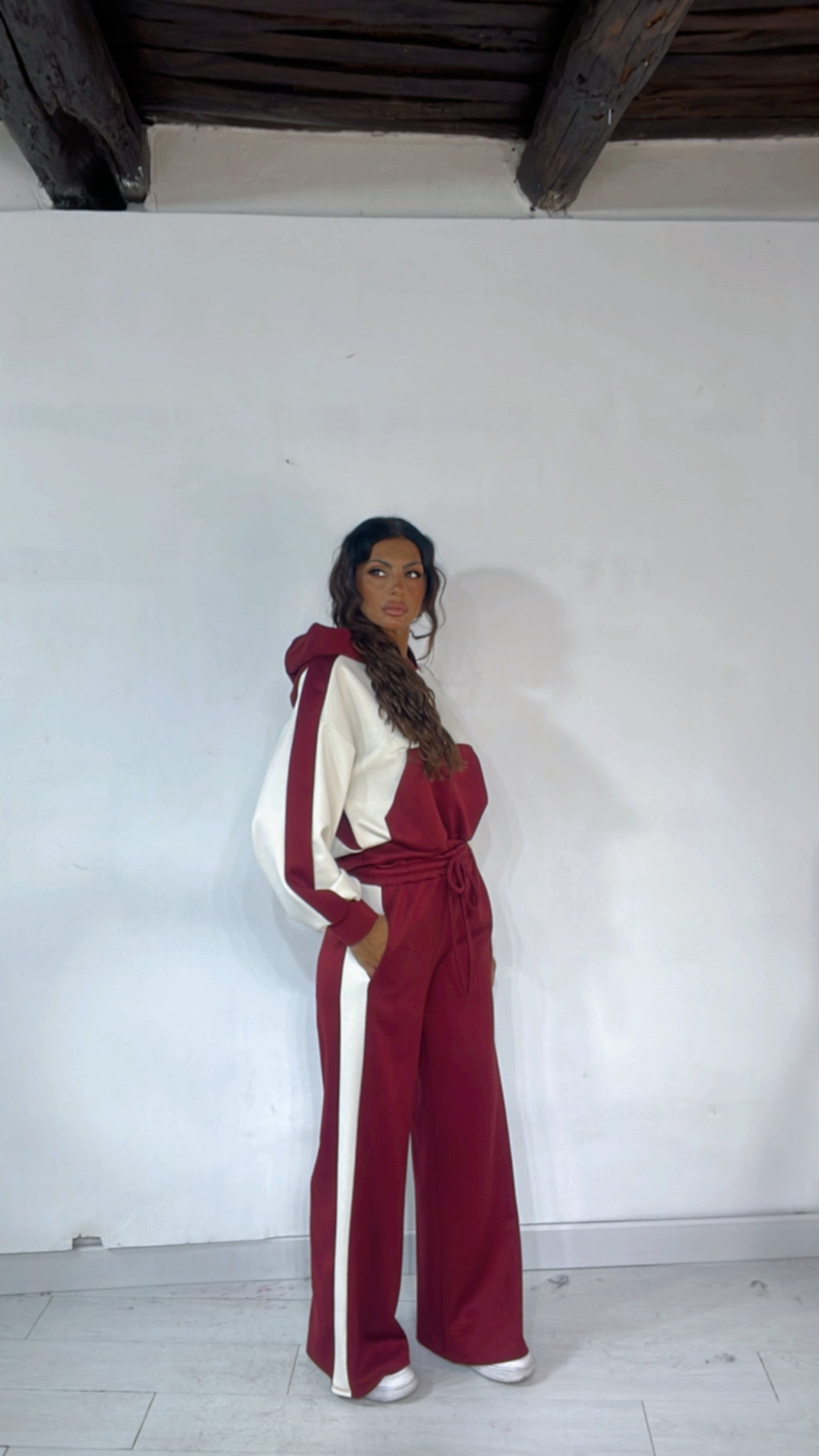 Tuta in ‘Viscosa’ interno non ‘Felpato’ composta da: Felpa con ‘Tasconi’ e ‘Cappuccio’. Leggermente ‘Crop’. Pantalone con ‘Elastico e Laccetti’, ‘Banda Laterale’ a contrasto. Modello a ‘Palazzo’.