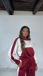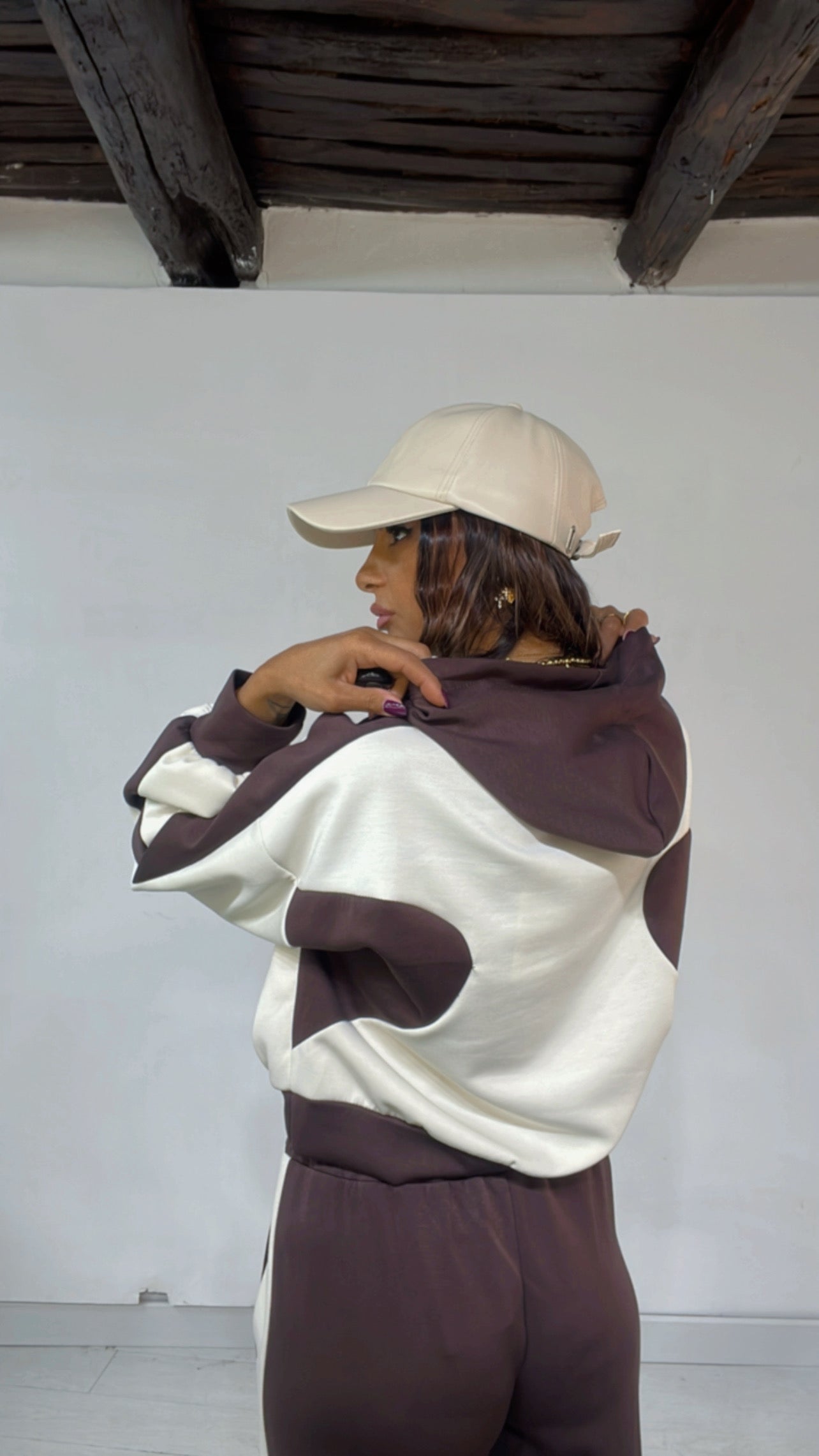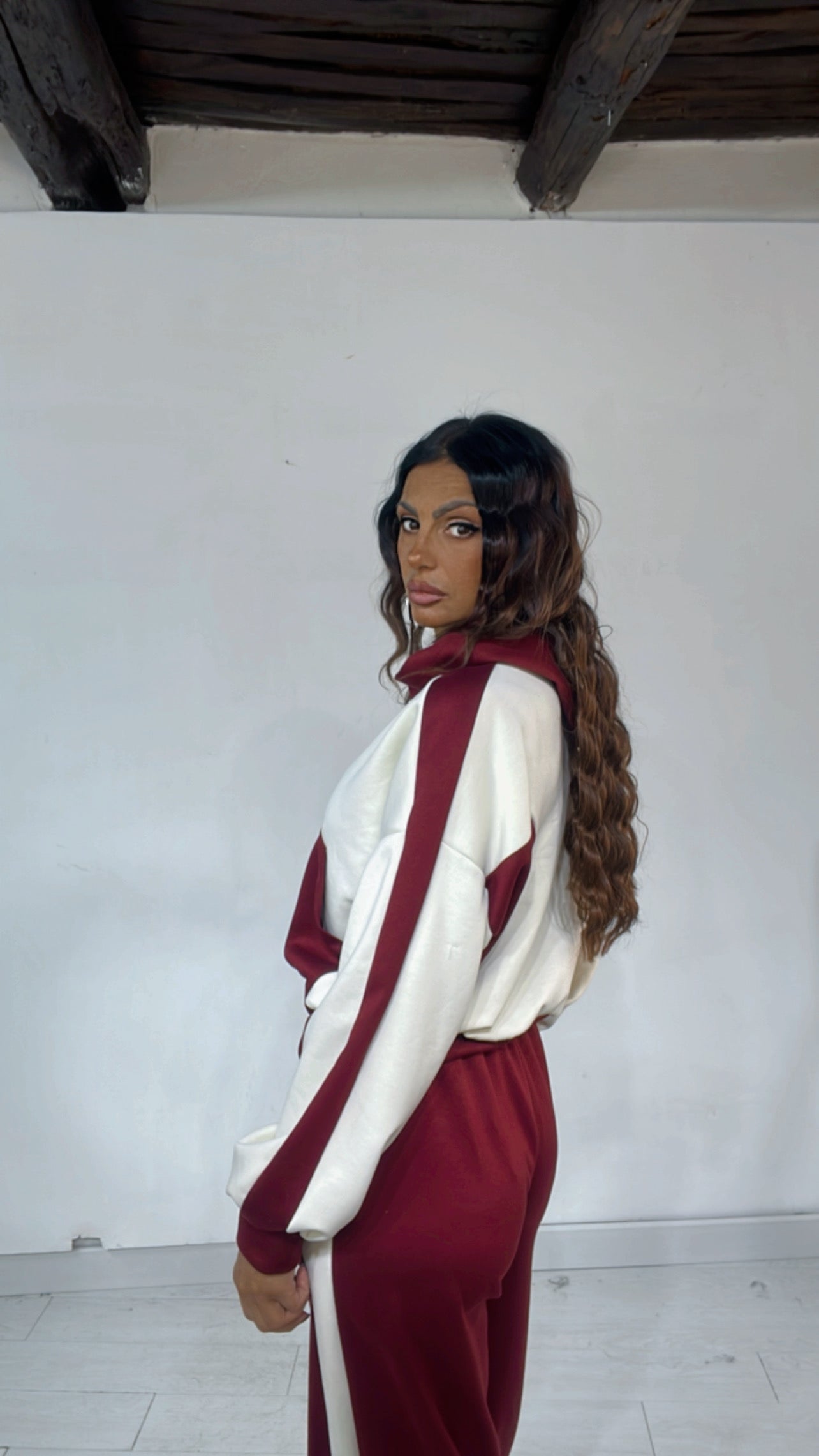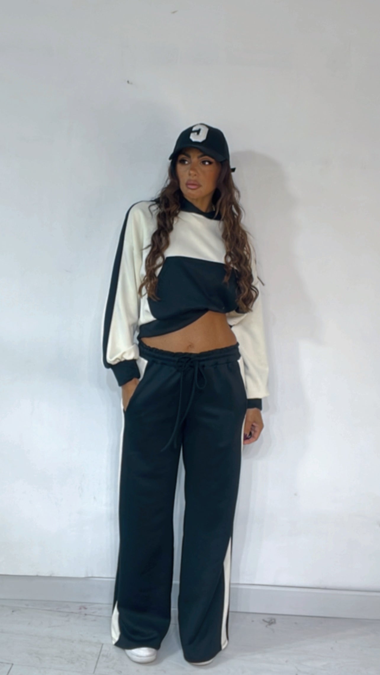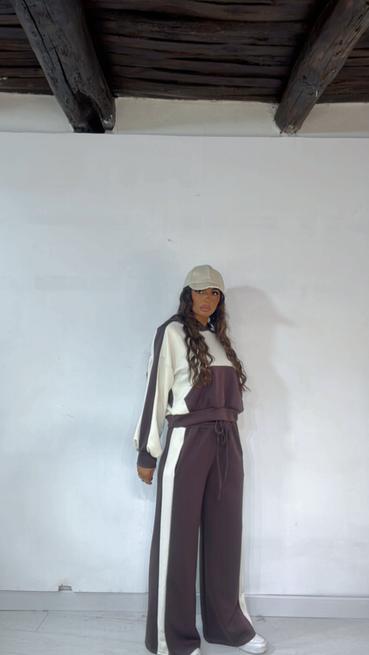 Tuta in ‘Viscosa’ interno non ‘Felpato’ composta da: Felpa con ‘Tasconi’ e ‘Cappuccio’. Leggermente ‘Crop’. Pantalone con ‘Elastico e Laccetti’, ‘Banda Laterale’ a contrasto. Modello a ‘Palazzo’.