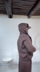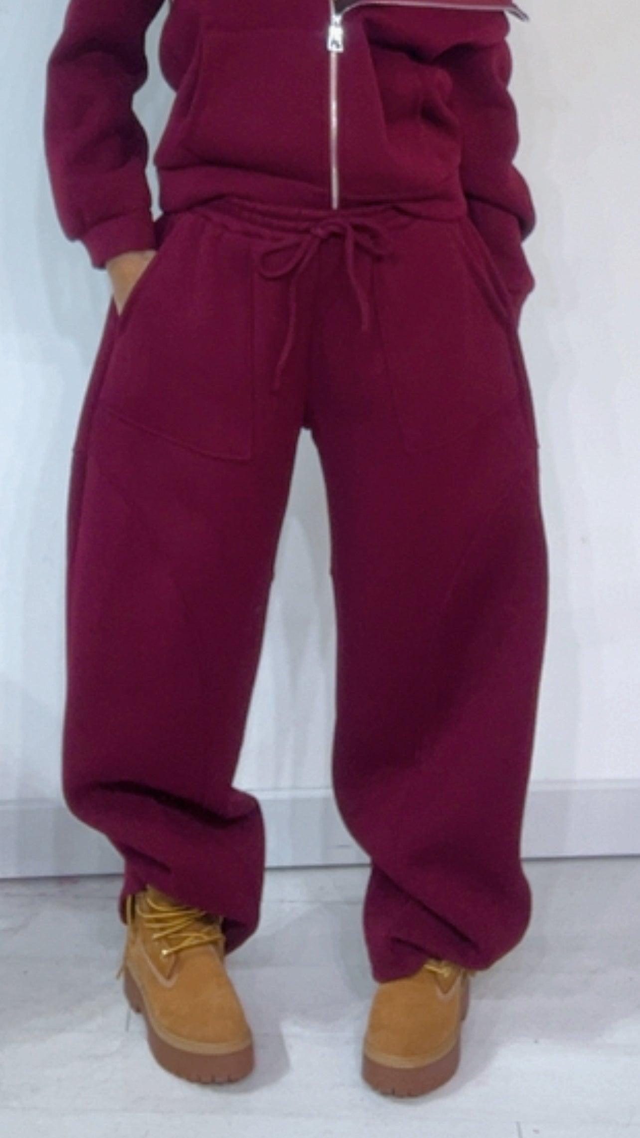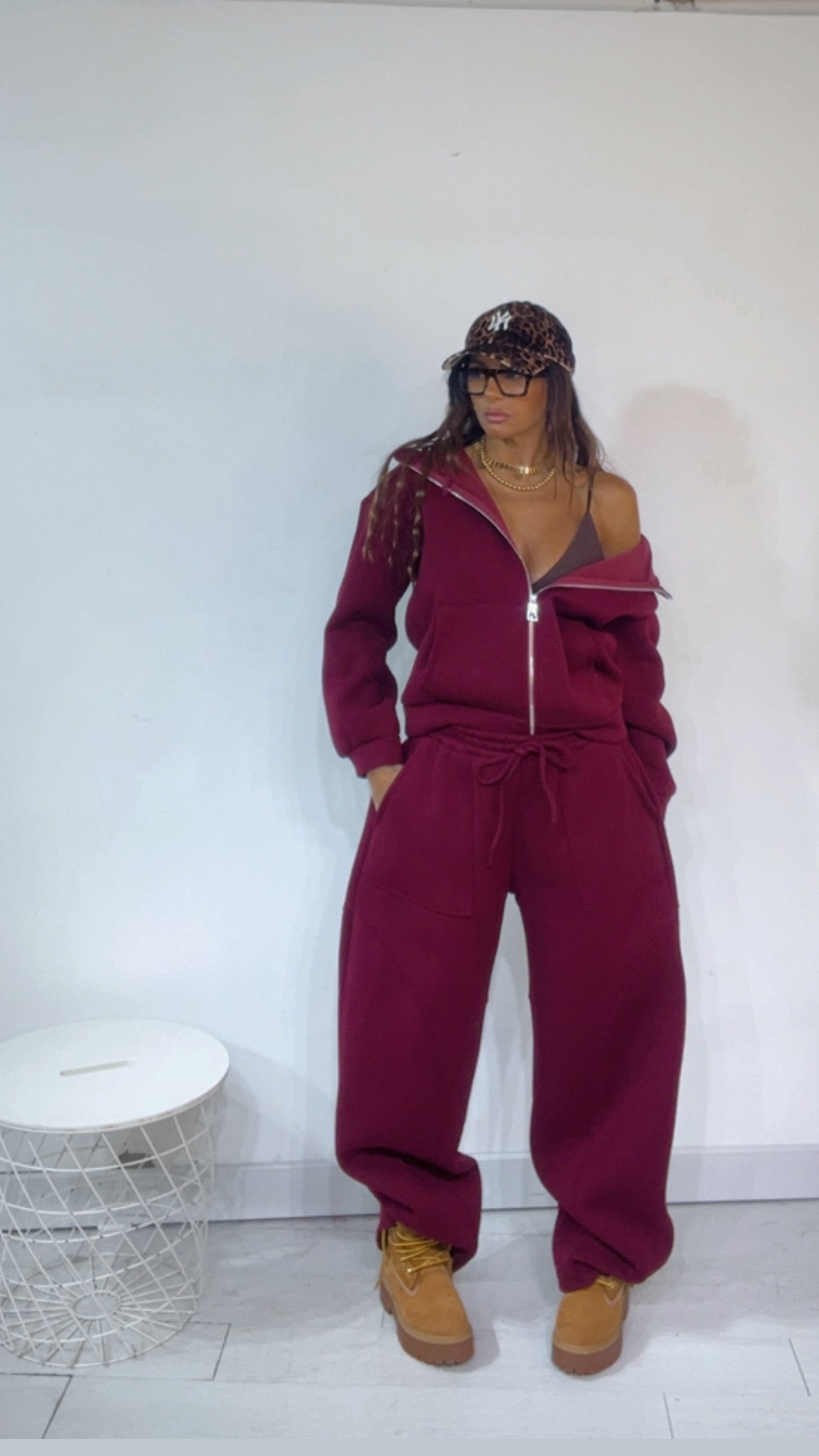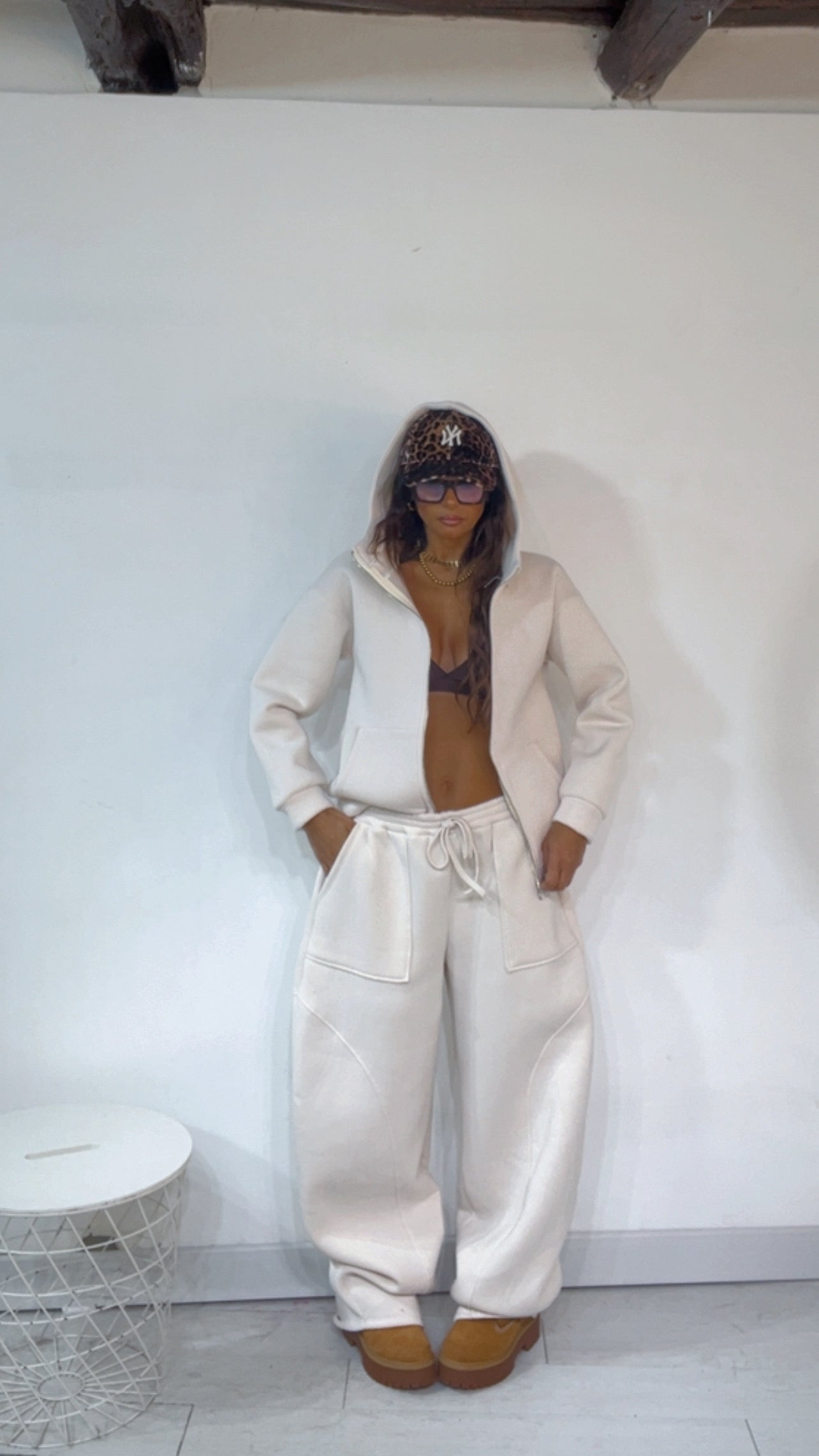 Tuta interno ‘Felpato’. Modello ‘Over’ composto da: Felpa con ‘Cappuccio e Zip’. Pantalone con ‘Elastico e Laccetti’. Modello ‘Baggy’.