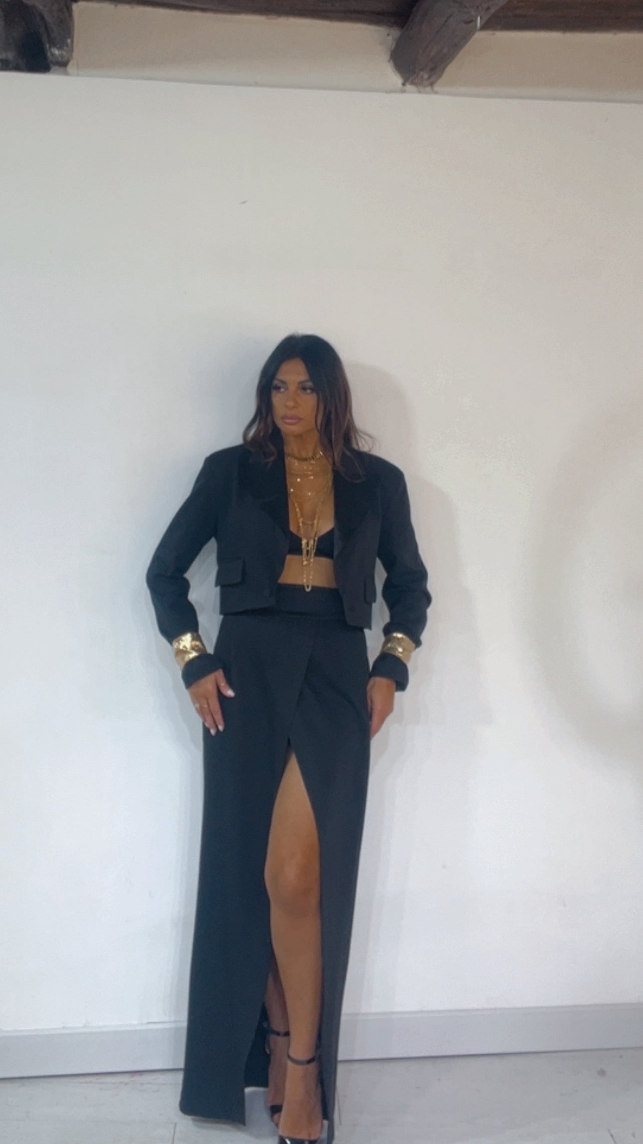 Giacca Crop ‘LUMINA’, con ‘Spalline e Pettine’. Rifiniture in ‘Raso’.