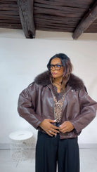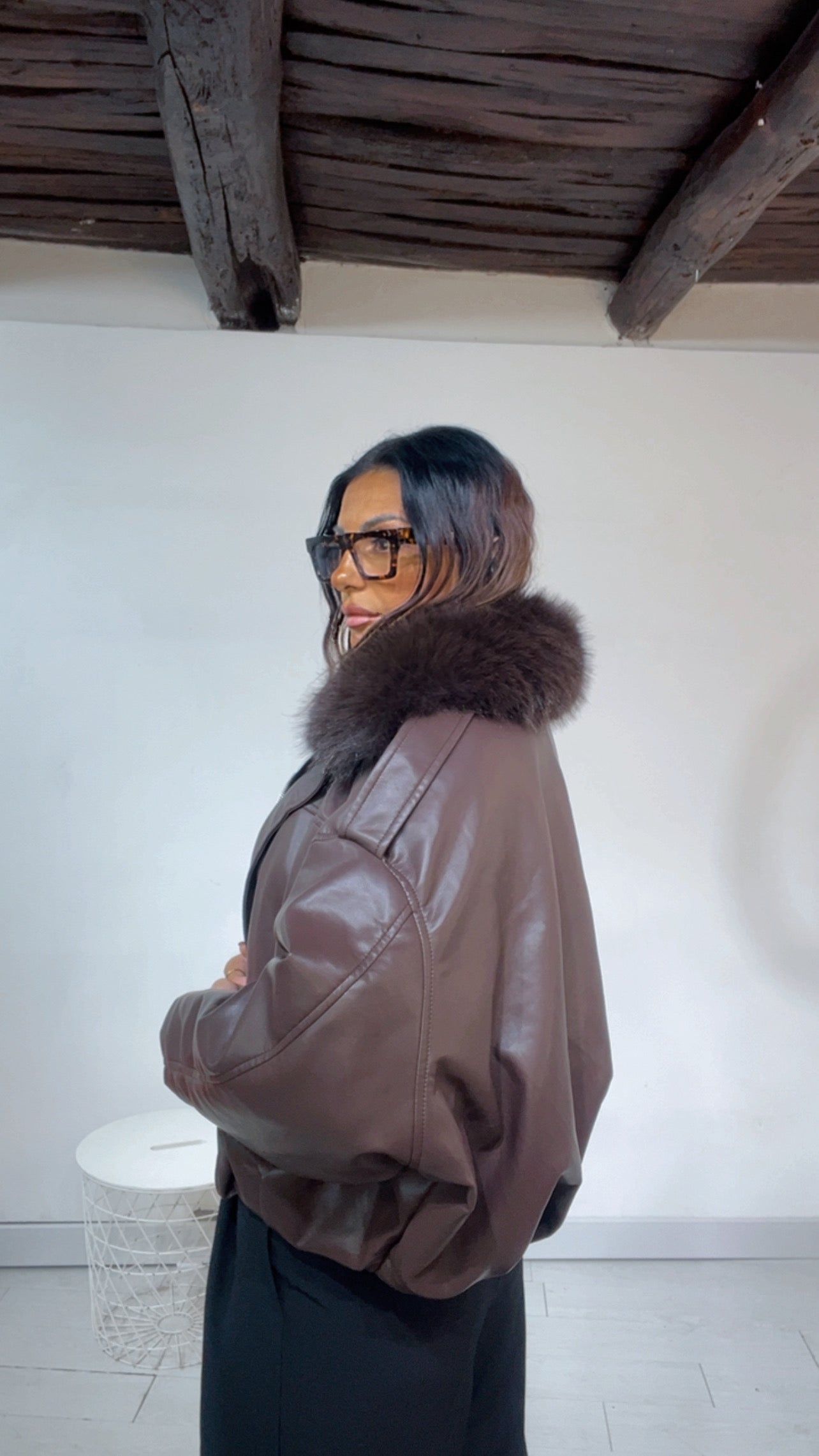 Bomber in EcoPelle,con effetto <sbuffo> e modello over.Interamente pellicciato all'interno e presenta un collo in EcoFur removibile.