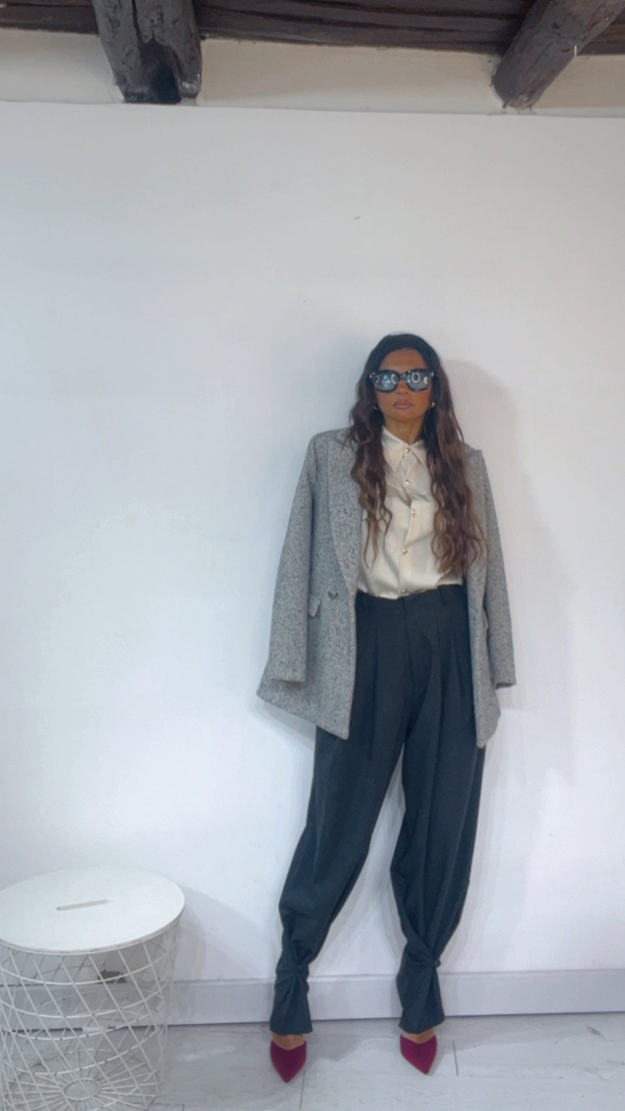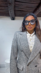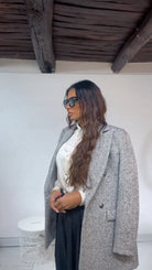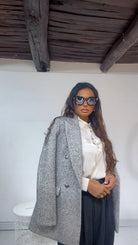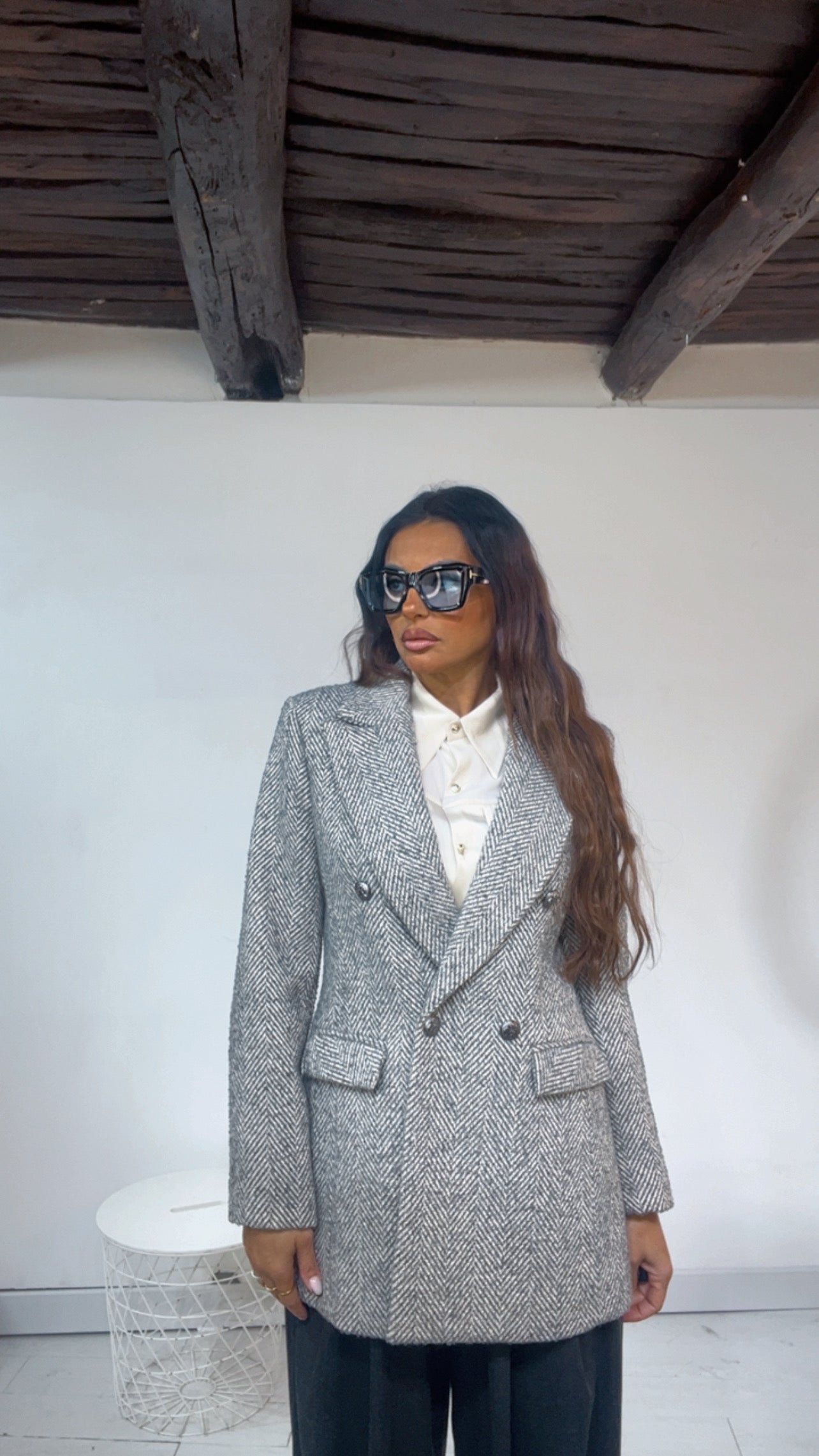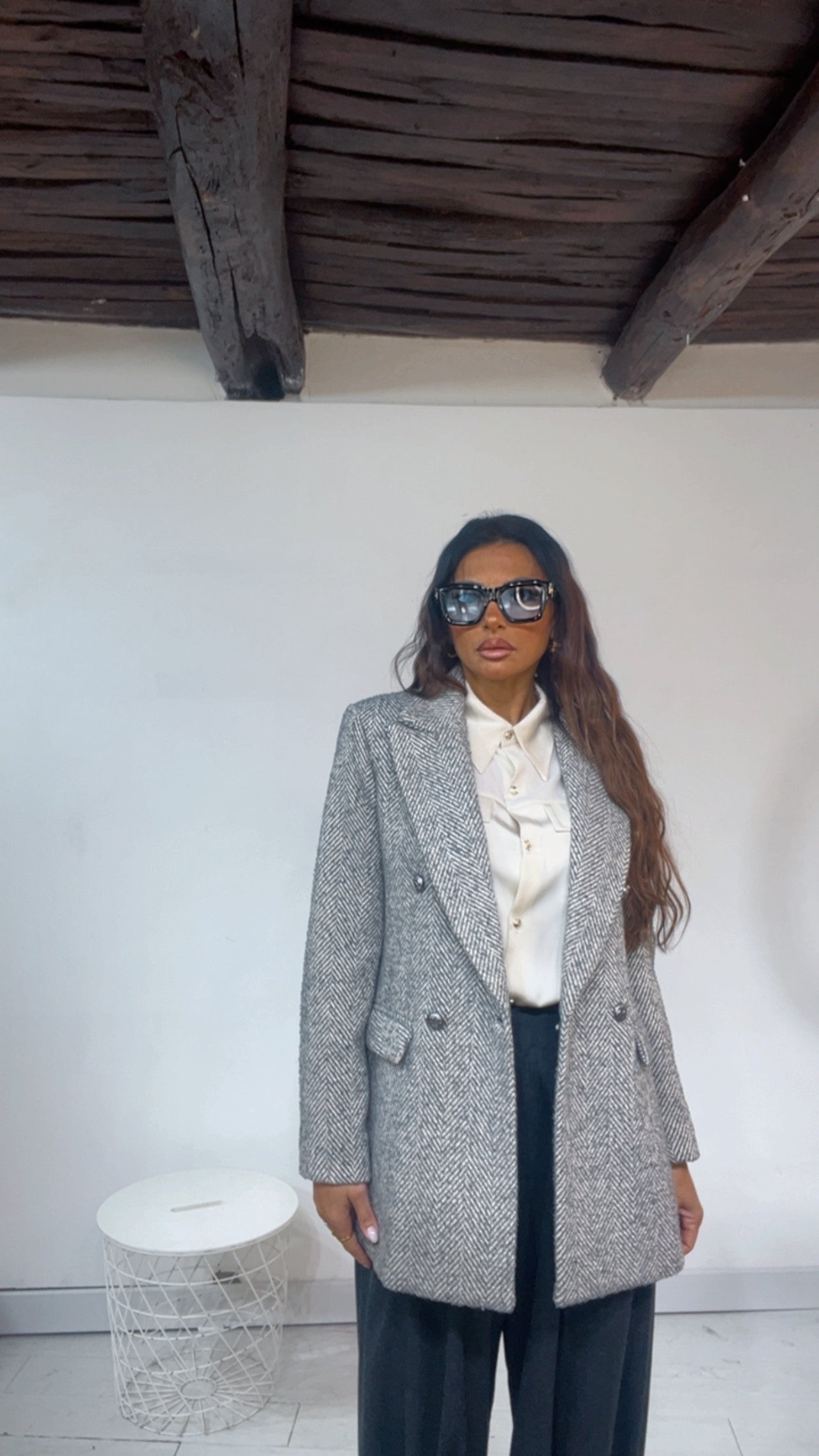 Cappottino ‘Simona G’ con ‘Spalline e Pettine’, ‘Bottoni Silver’. Modello ‘DoppioPetto’, ‘Balmain’. ‘Avvitato’. Trama ‘Spigata’.