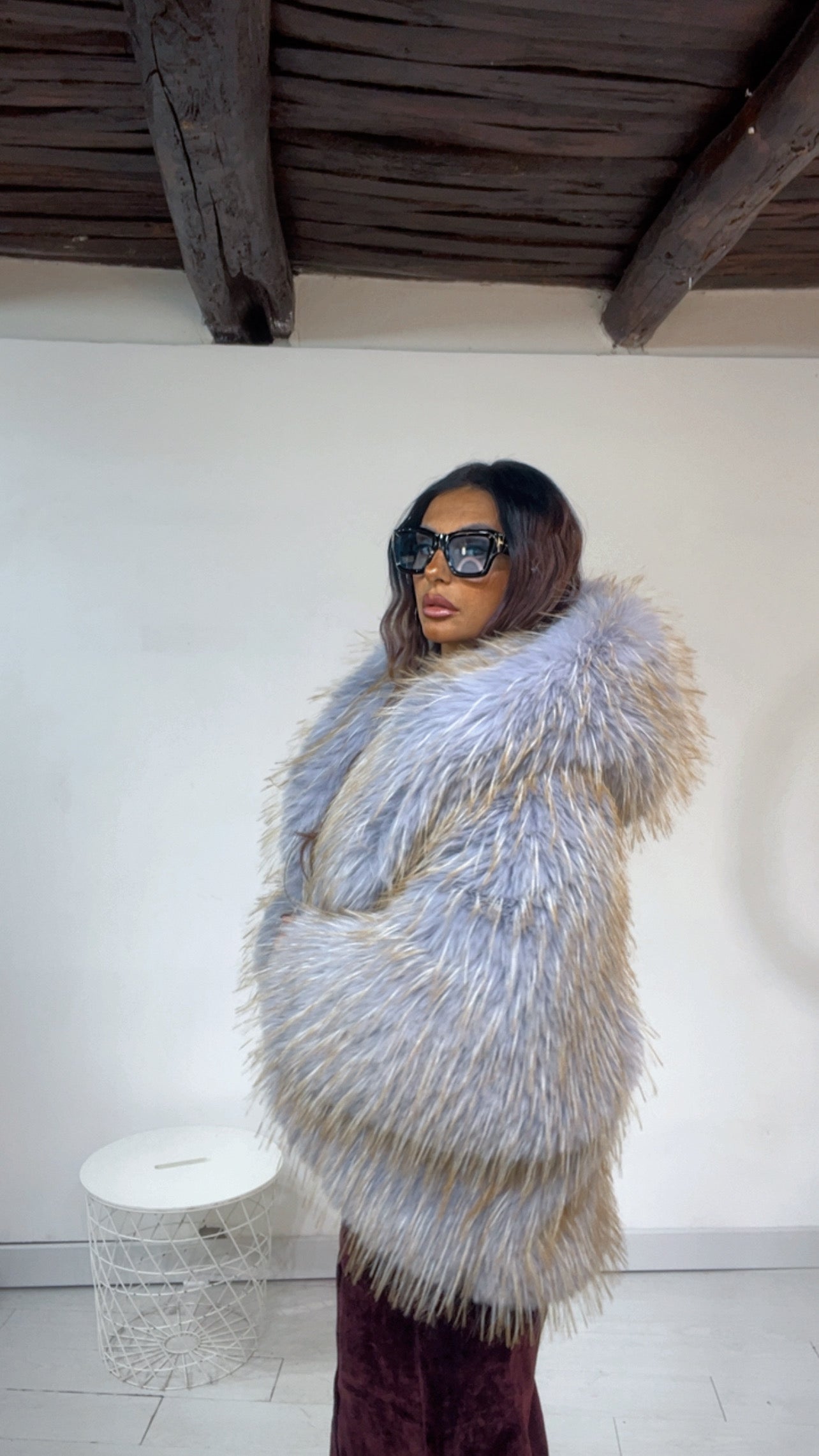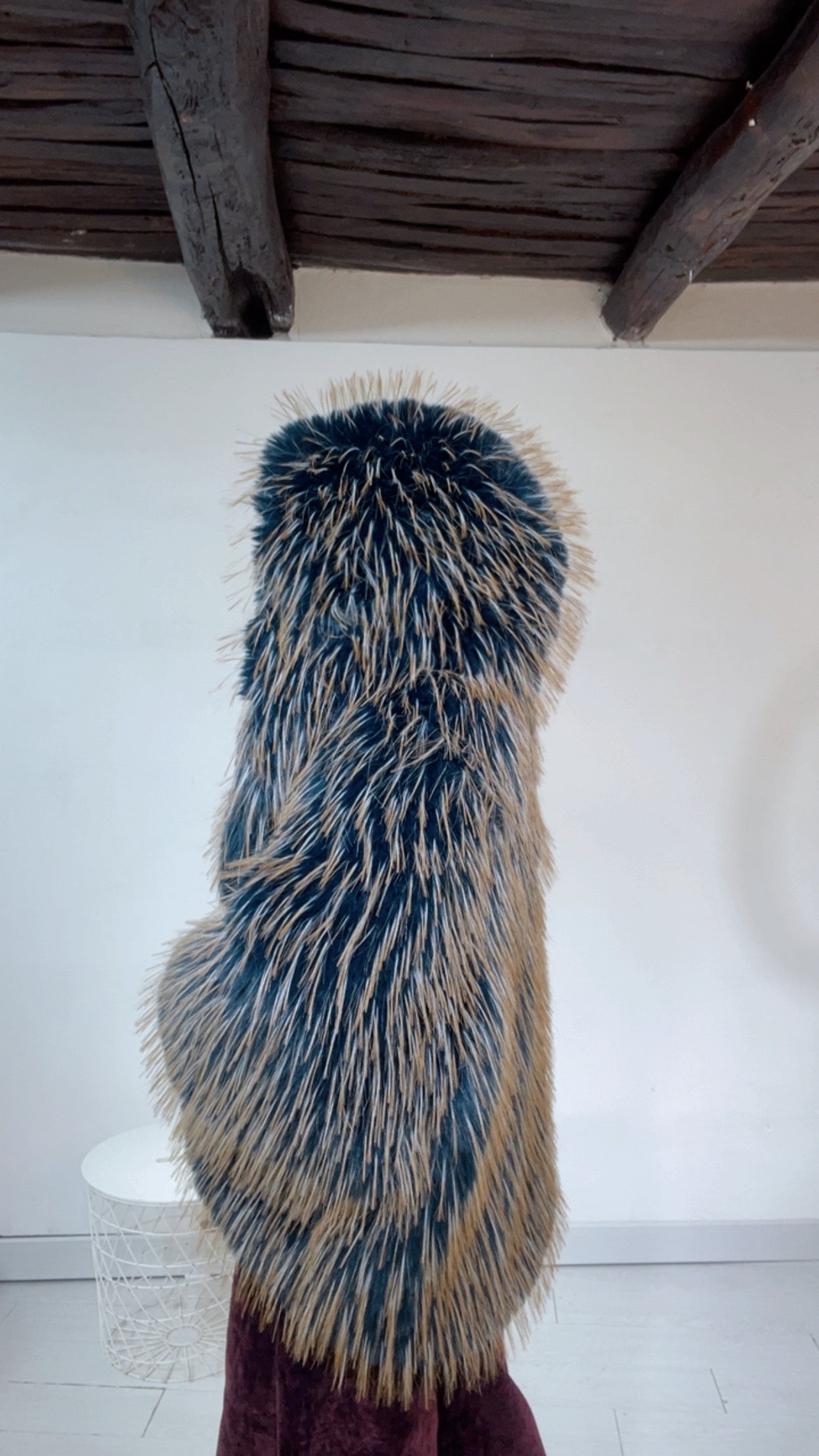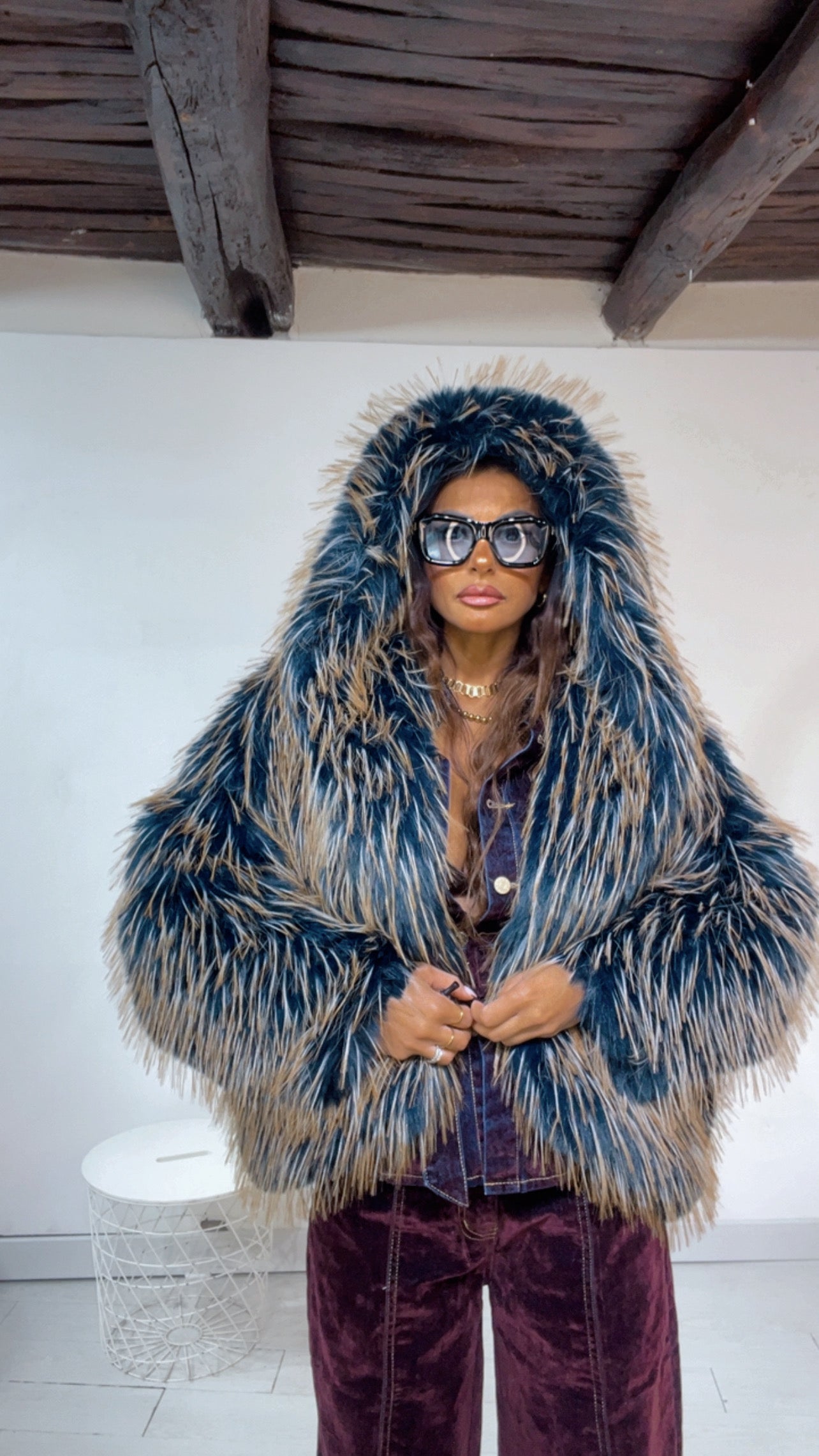 EcoPelliccia con ‘Cappuccio’, ‘Sfumature’ a contrasto, chiusura ‘Ciappetta’. Modello ‘Over’.