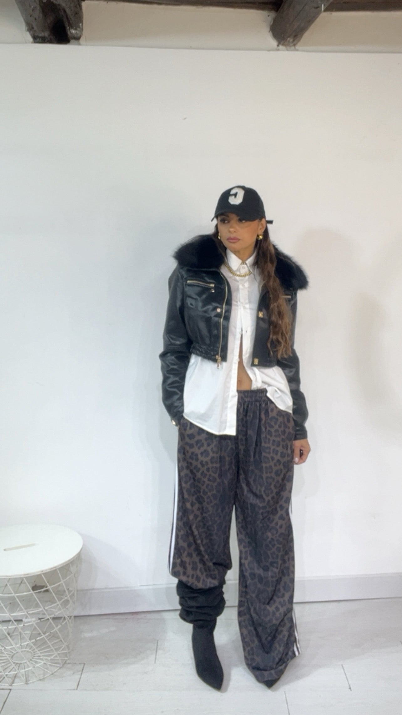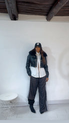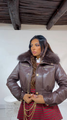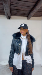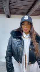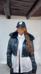 Giubbino Crop con ‘Colletto’ removibile, dettagli ‘Gold’. In ‘EcoPelle’, interno ‘Impellicciato’.