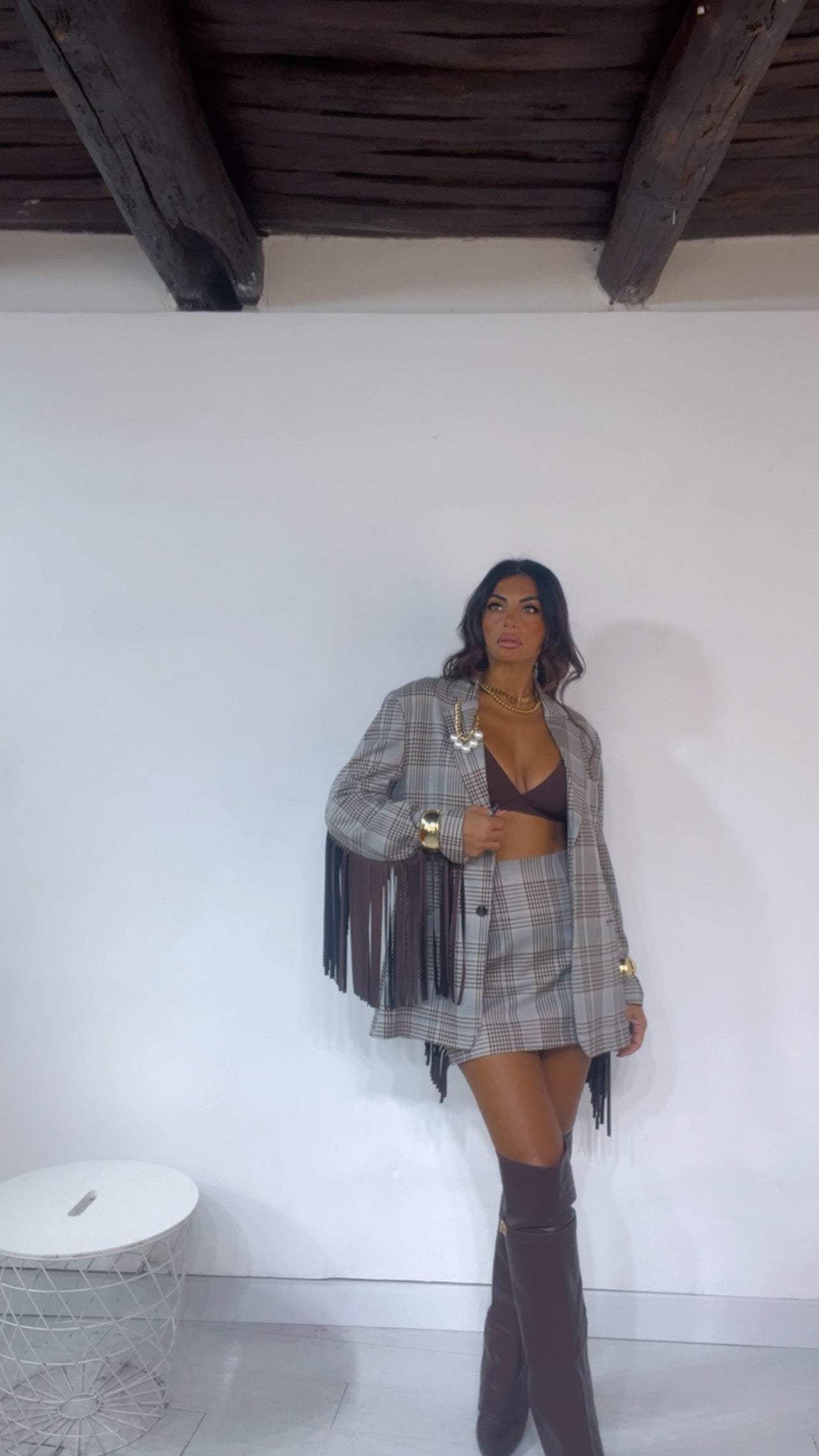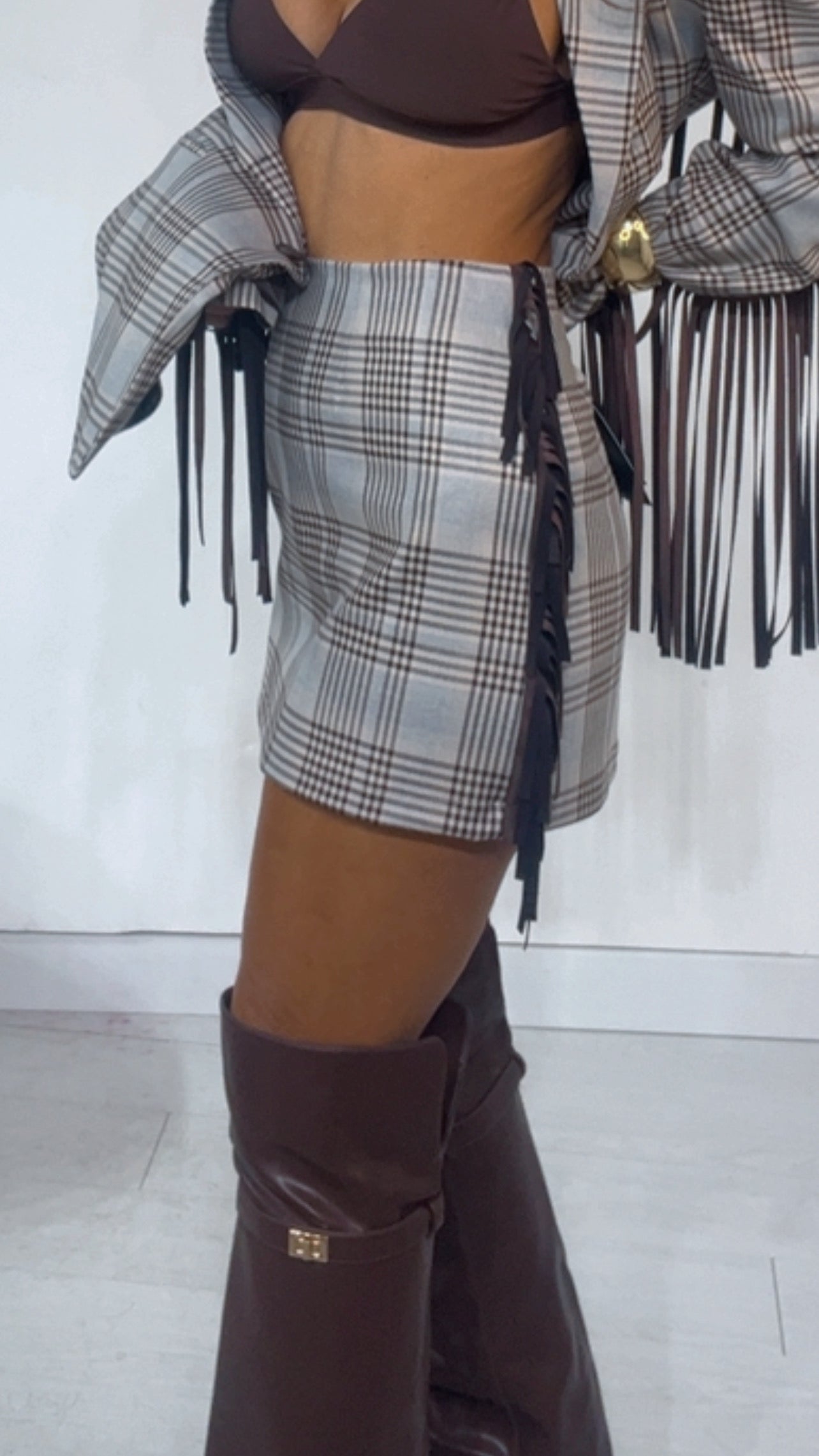 MiniGonna ‘Simona G’ fantasia ‘Quadri’, con applicazione di ‘Frange’, chiusura ‘Zip’ invisibile sul retro.