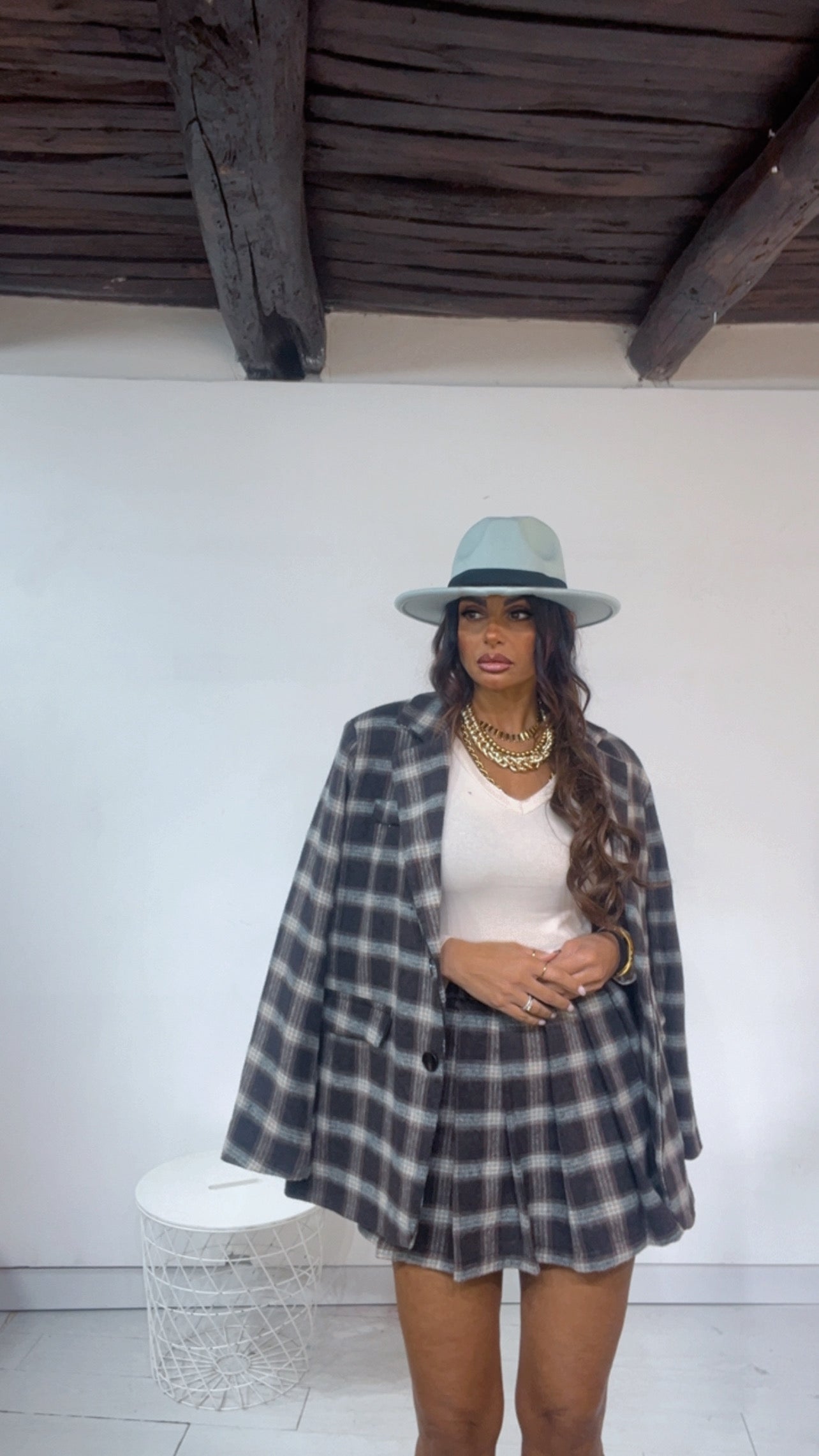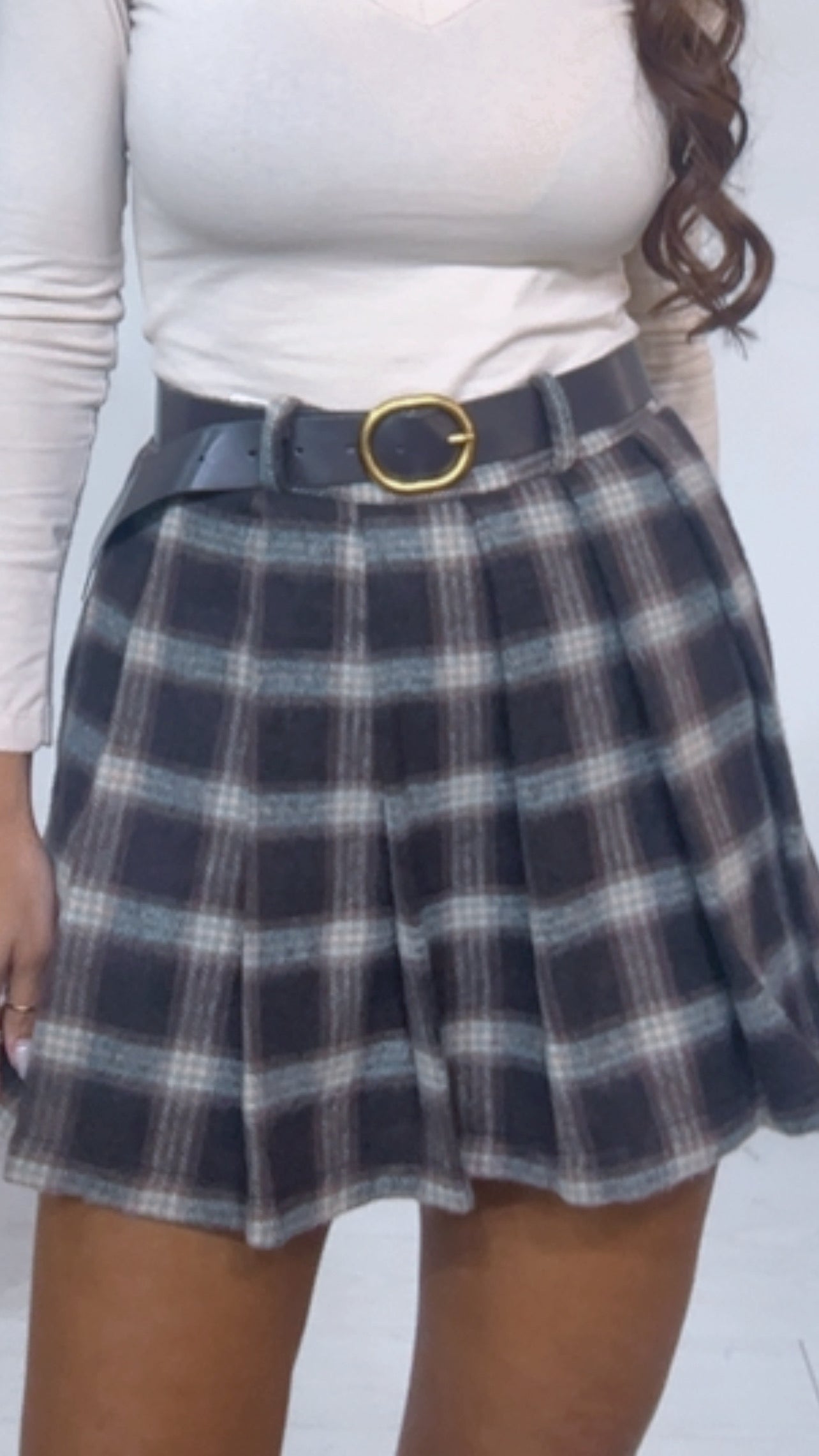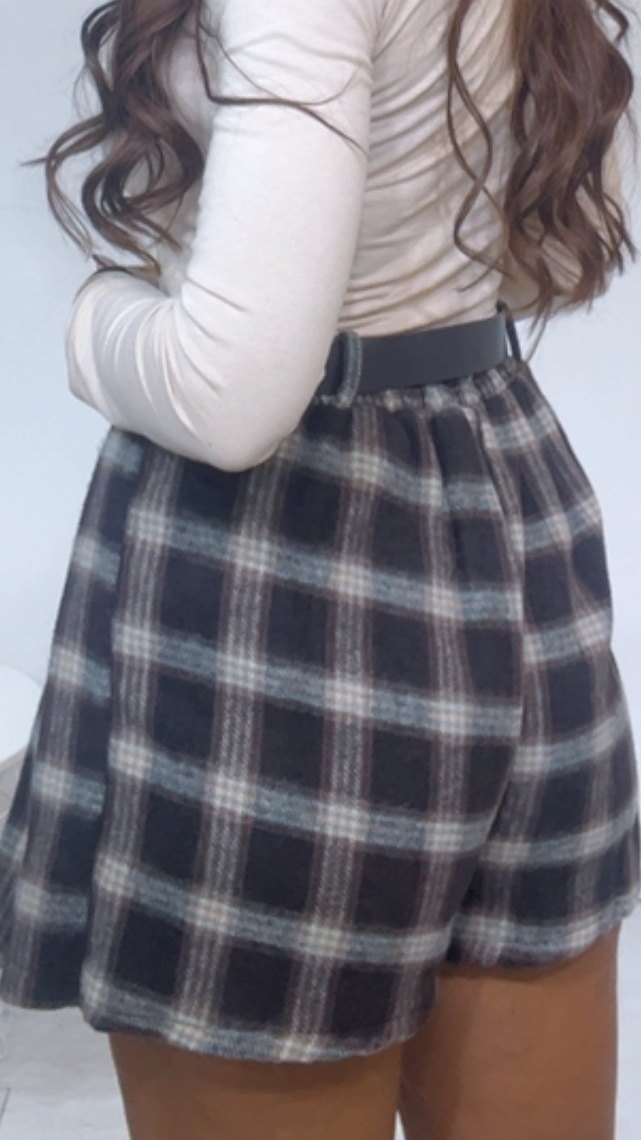 Shorts/Gonna fantasia ‘Tartan’, vita alta con ‘Elastico’, ‘Cintura in EcoPelle’ compresa, ‘Plissettata’ davanti. In ‘Lana’