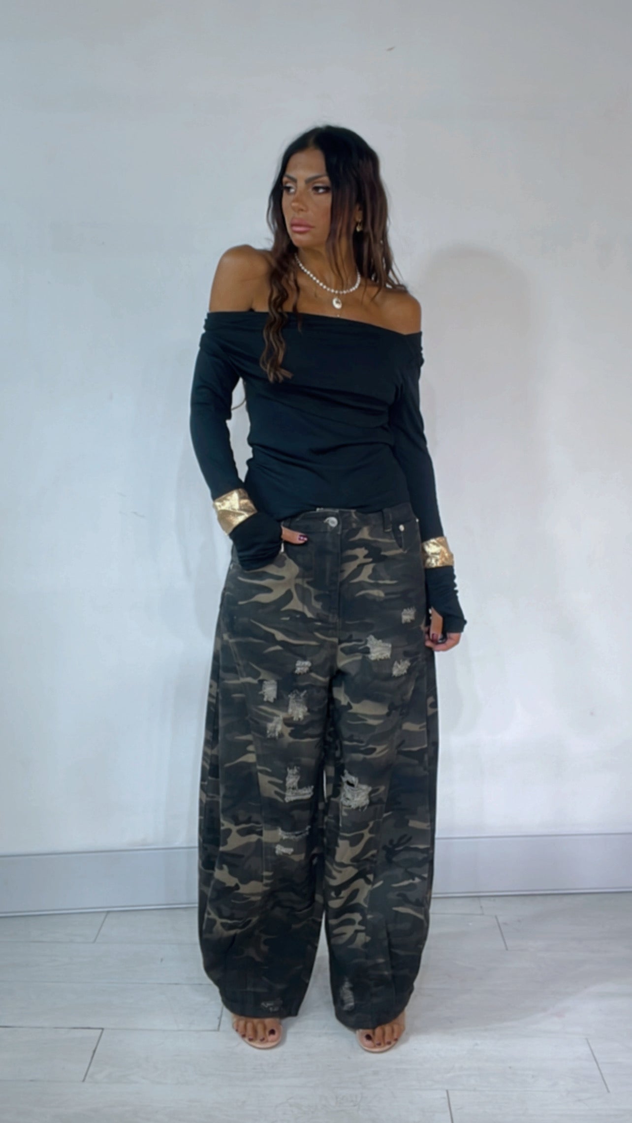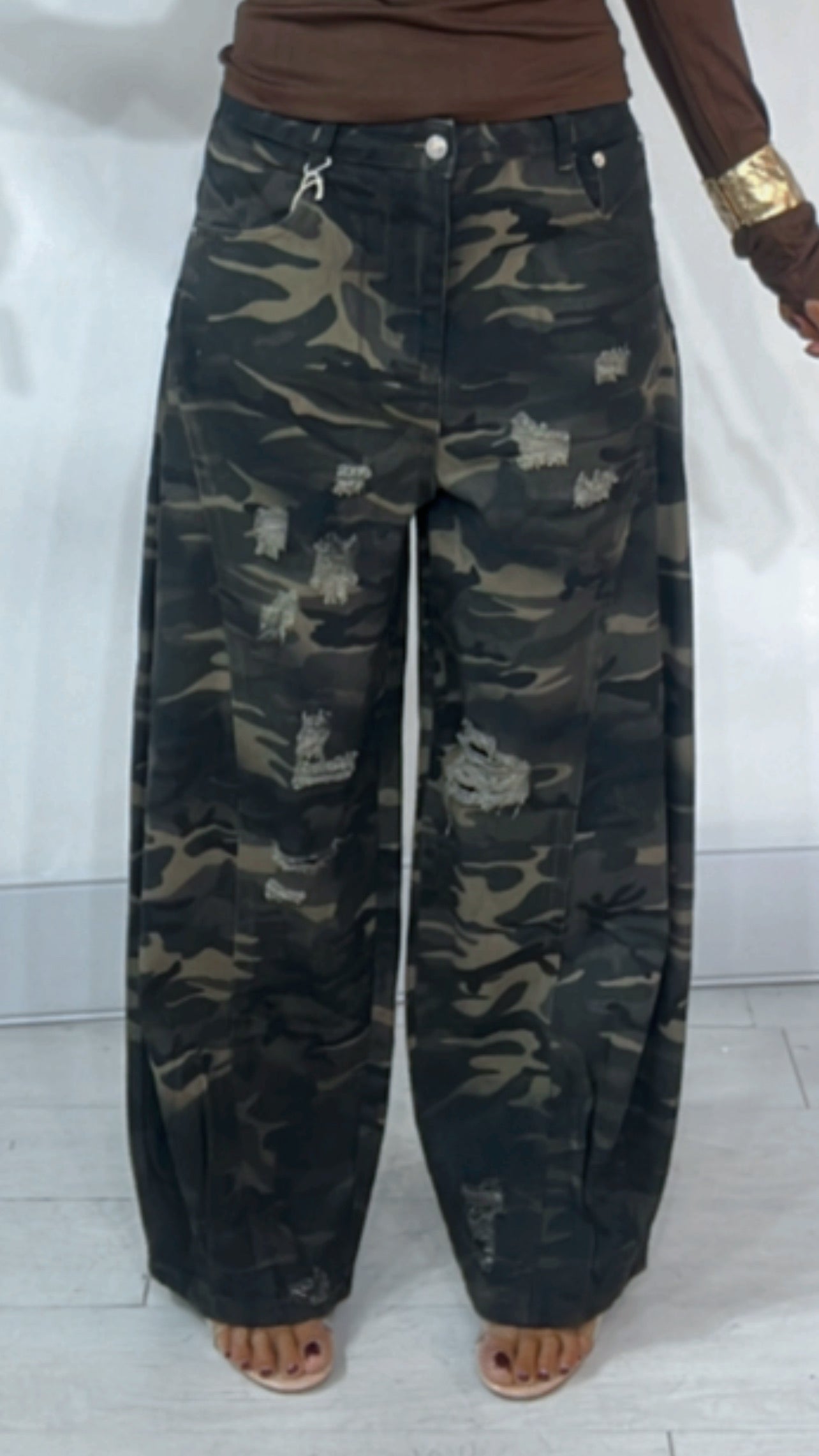 Jeans fantasia ‘Camouflage’. Leggermente ‘Strappato’. Modello ‘Baggy’. Trama non ‘Elastica’.