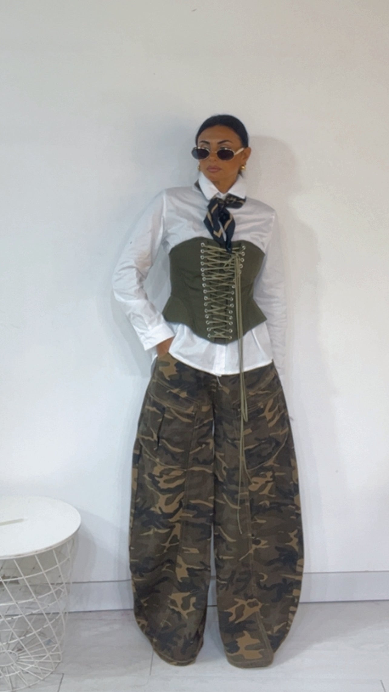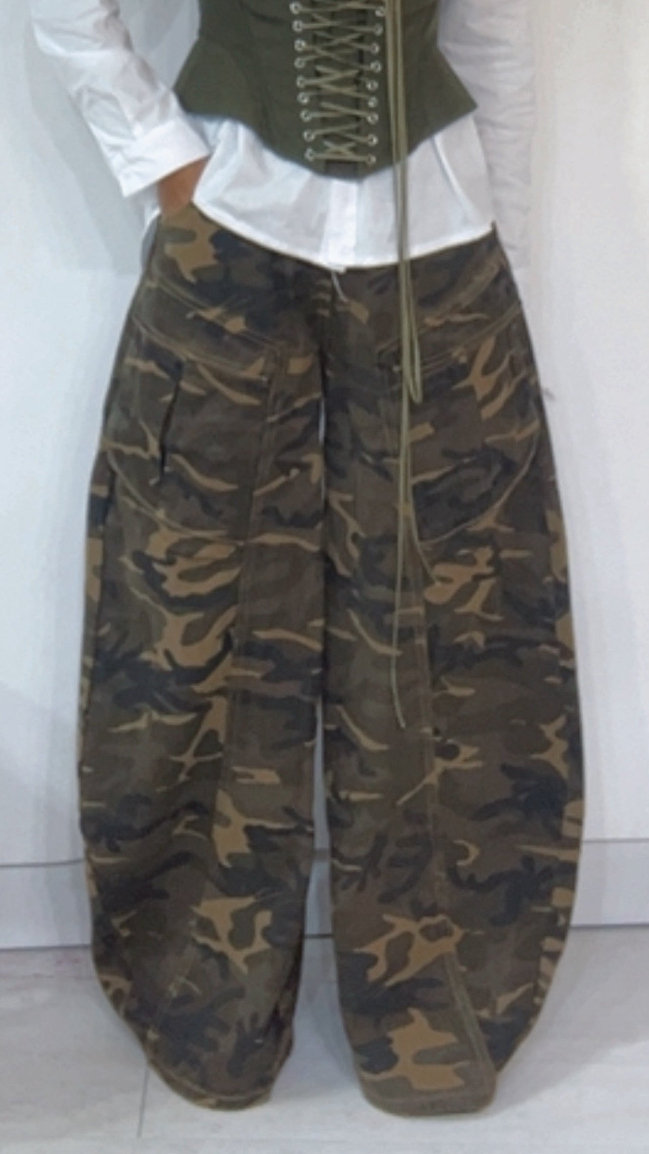 Jeans in fantasia militare,modello baggy con tasconi e cuciture sul davanti.