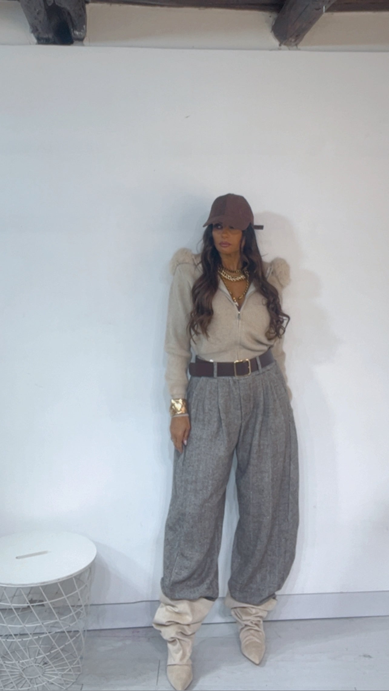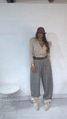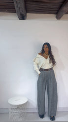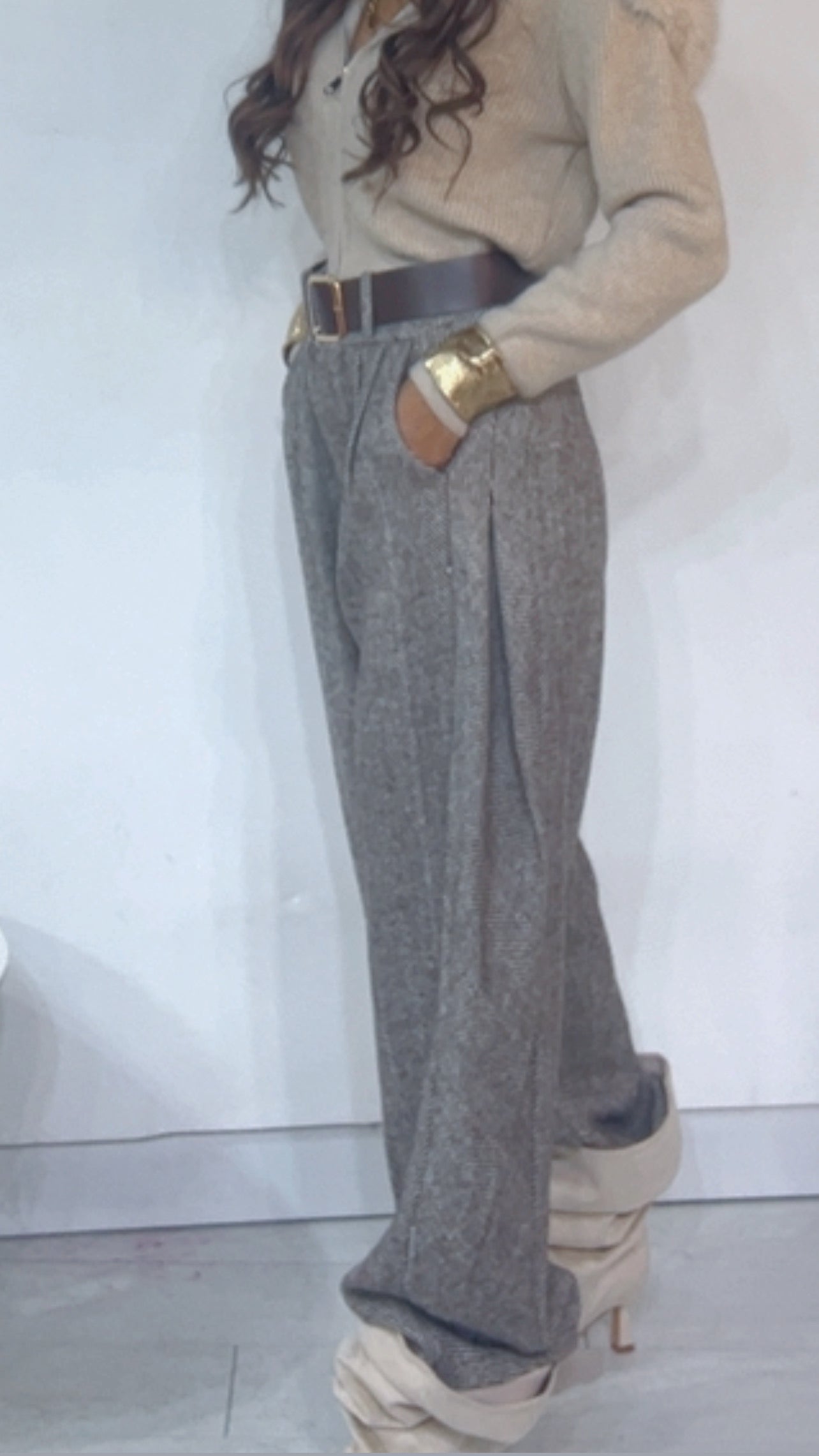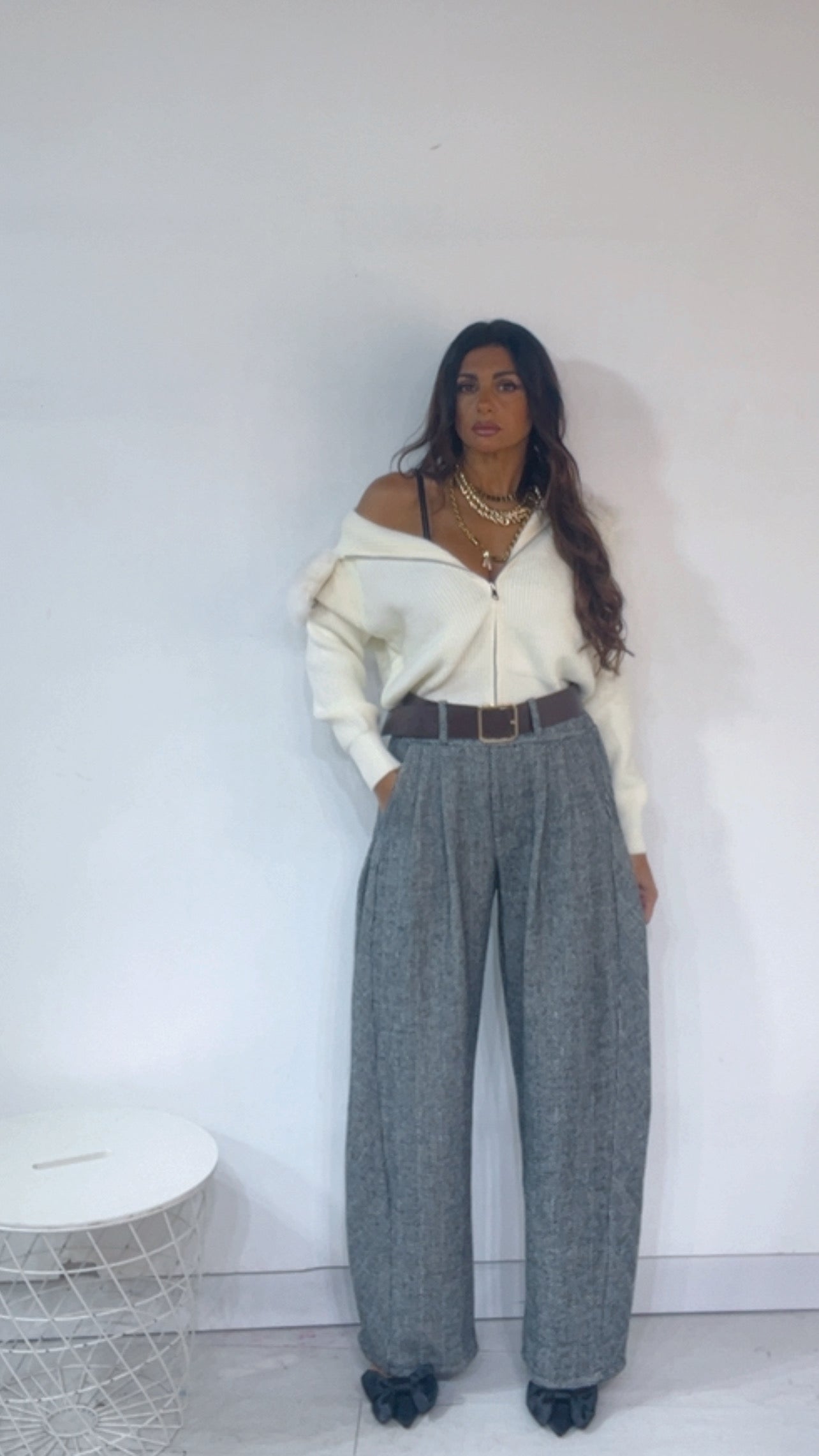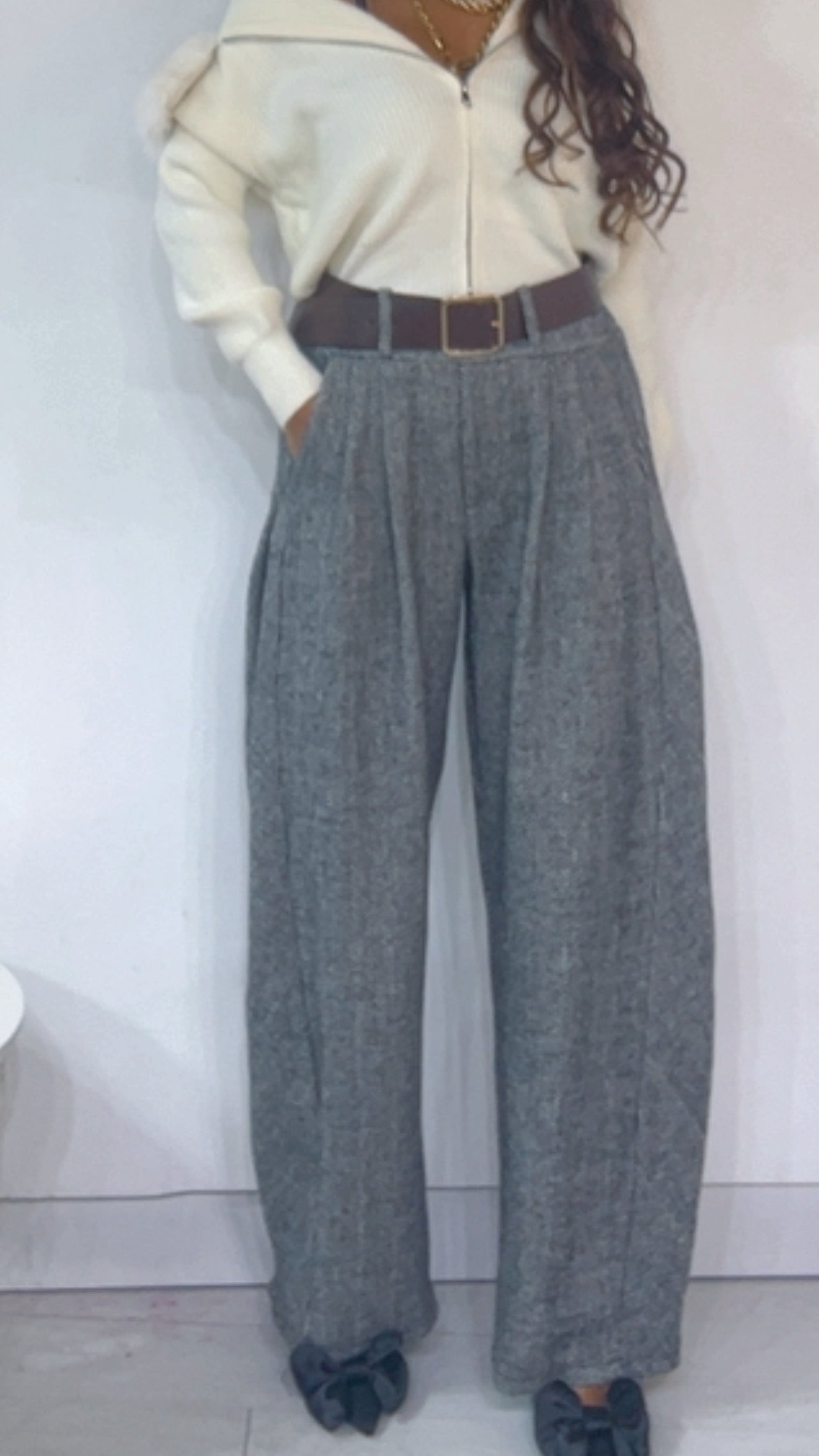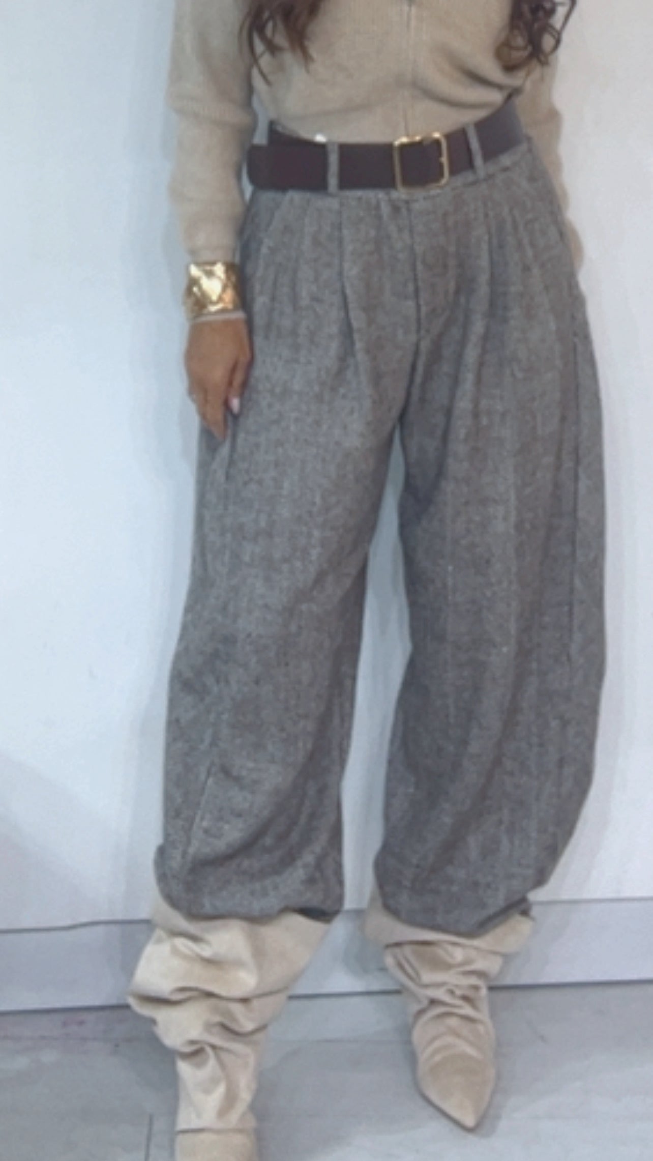 Pantalone vita alta, cintura in ‘EcoPelle’ compresa, con ‘Tasche’, elastico sul retro. Modello ‘Balloon’. In ‘Lana Spigata’.