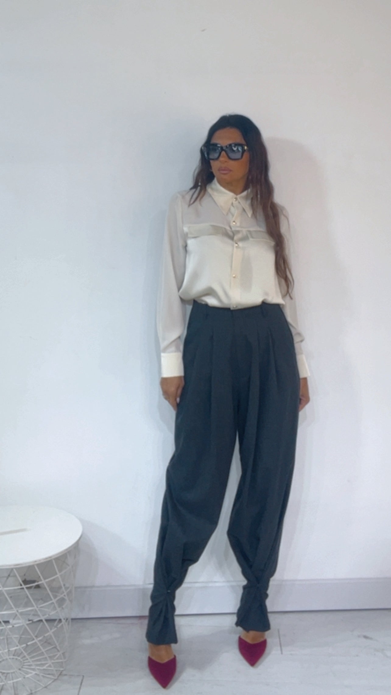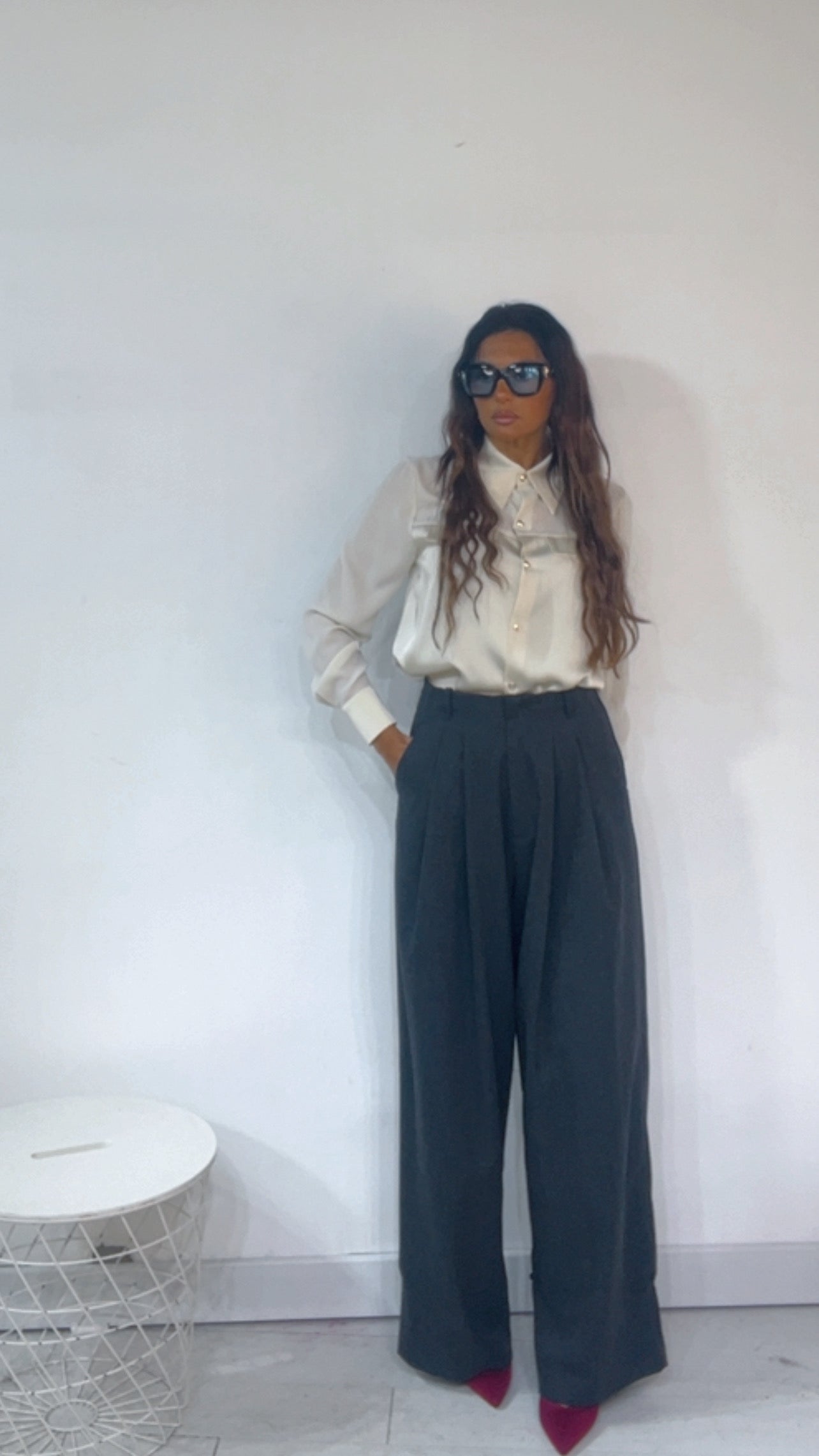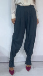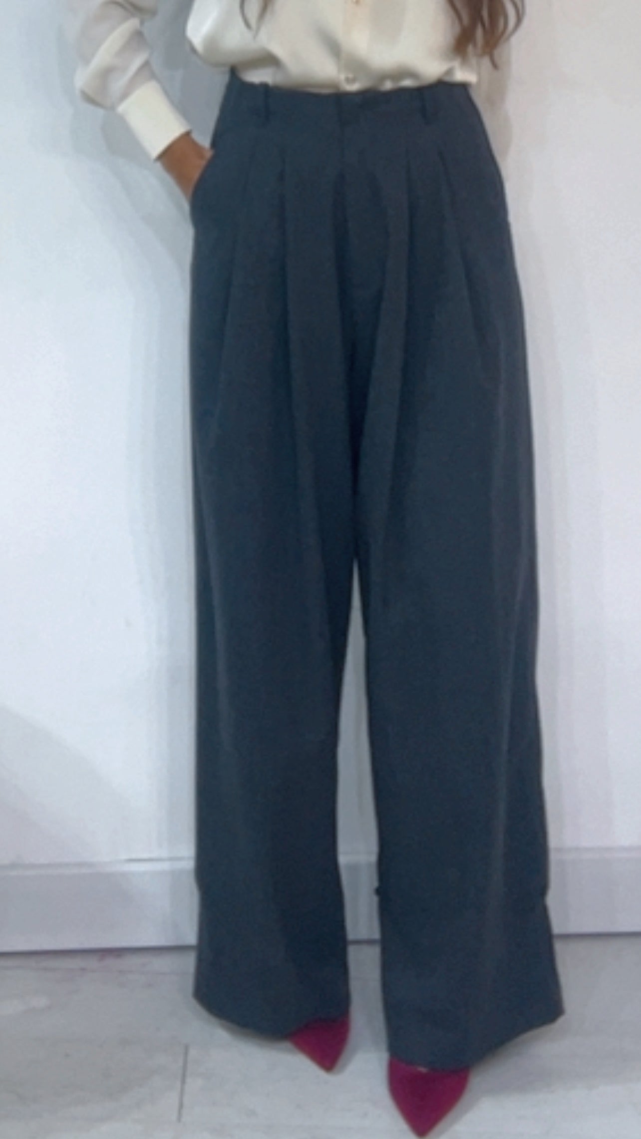 Pantalone ‘Simona G’ vita altissima, con ‘Pence’. Fantasia ‘Spigata’. Modello ‘Wide Leg’, ‘Palazzo’ con ‘Bottoncino Anteriore’ da poter regolare il ‘Fondo’. Tessuto ‘MonoLana’.