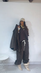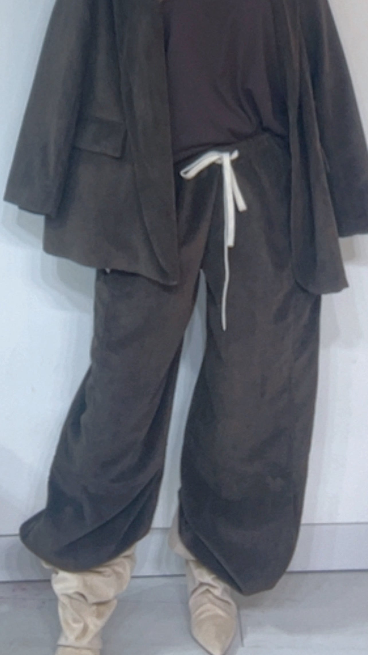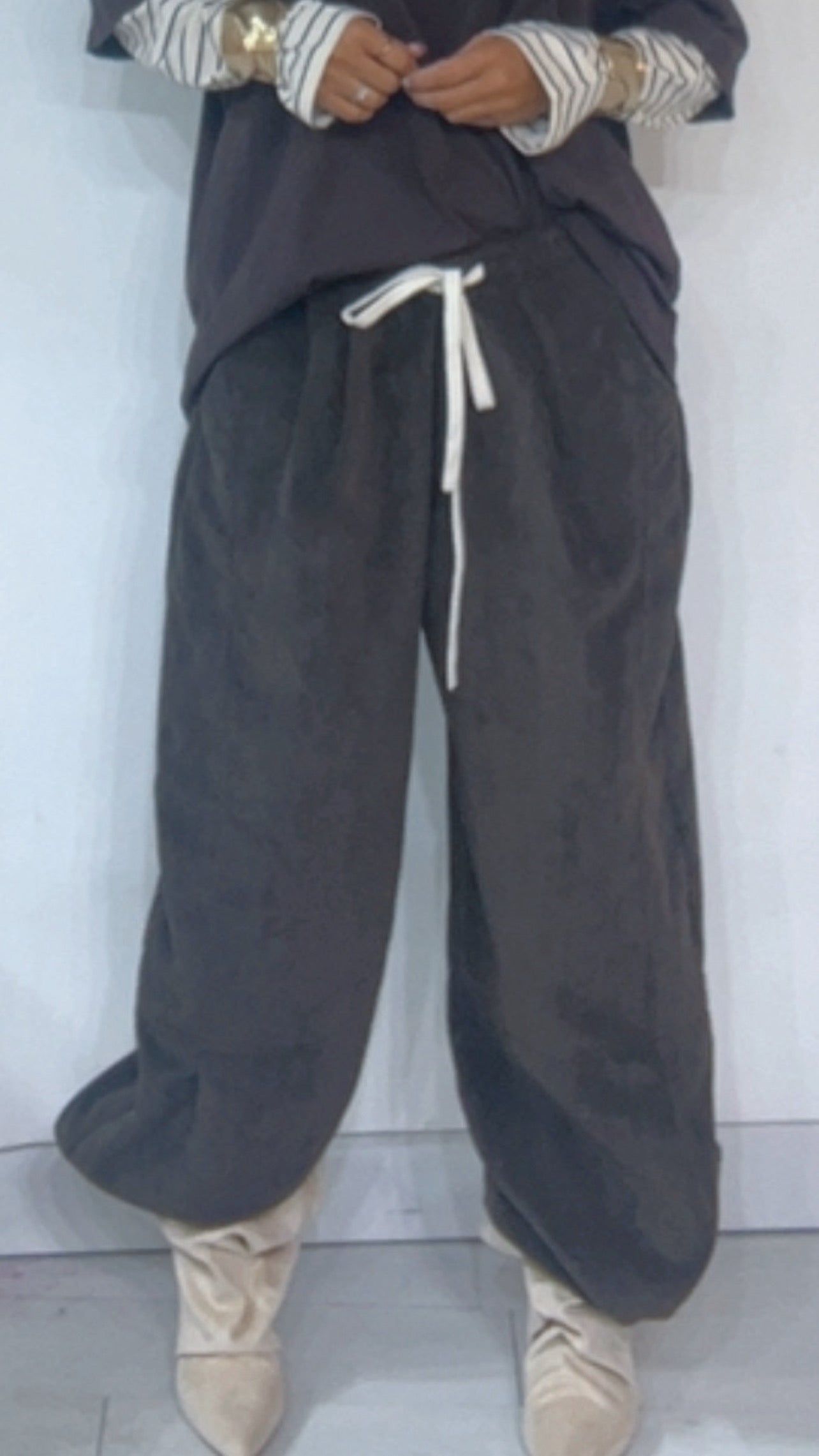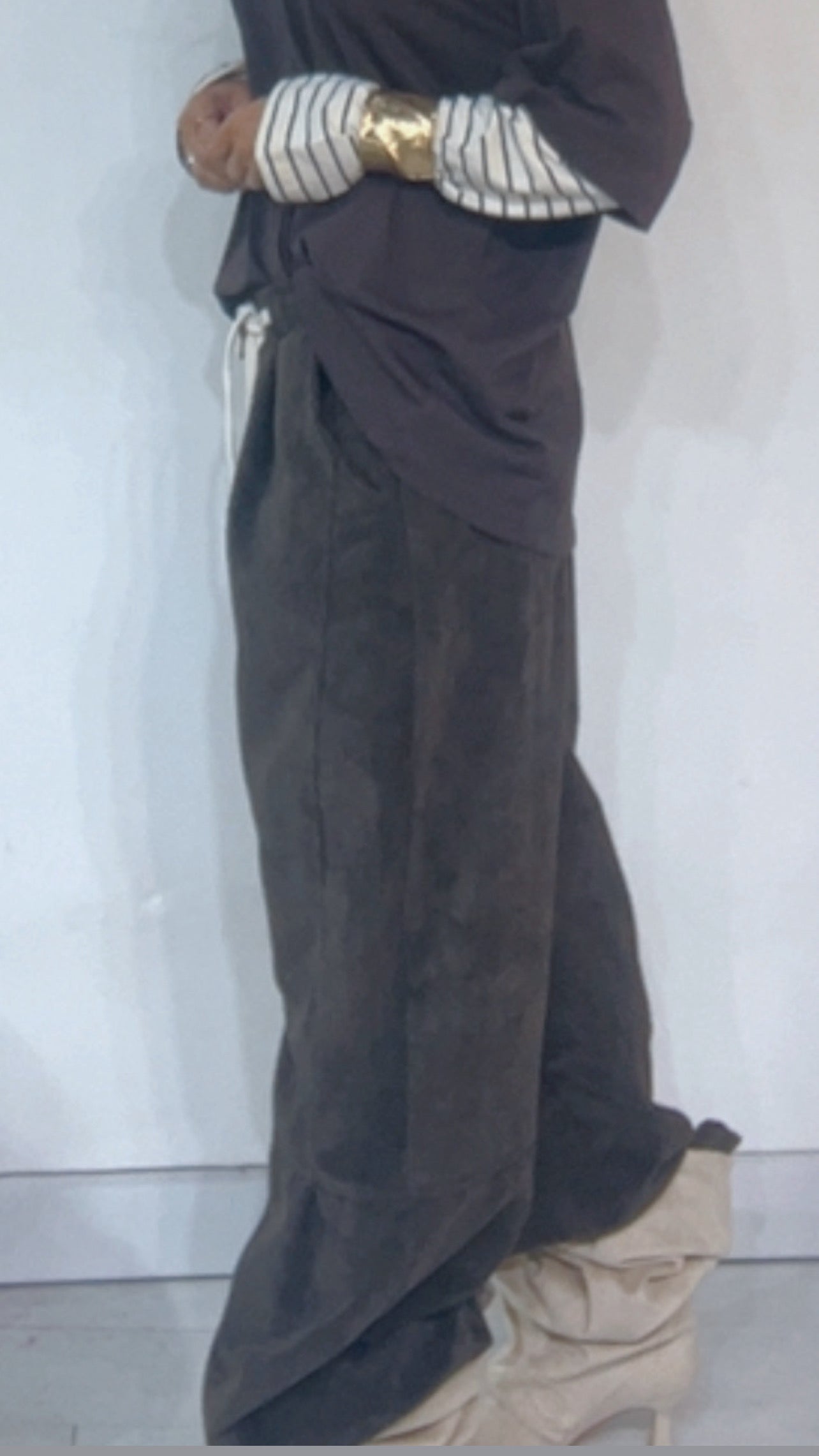 Pantalone con ‘Elastico e Laccetti’. In ‘Velluto’, ‘MilleRighe’. Modello ‘Baggy’, Over’.