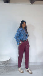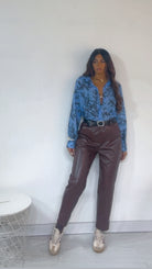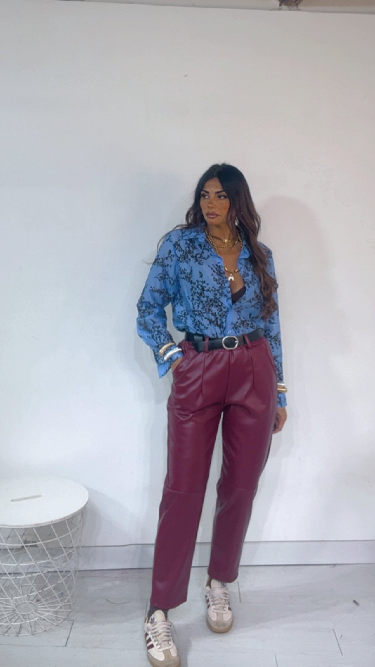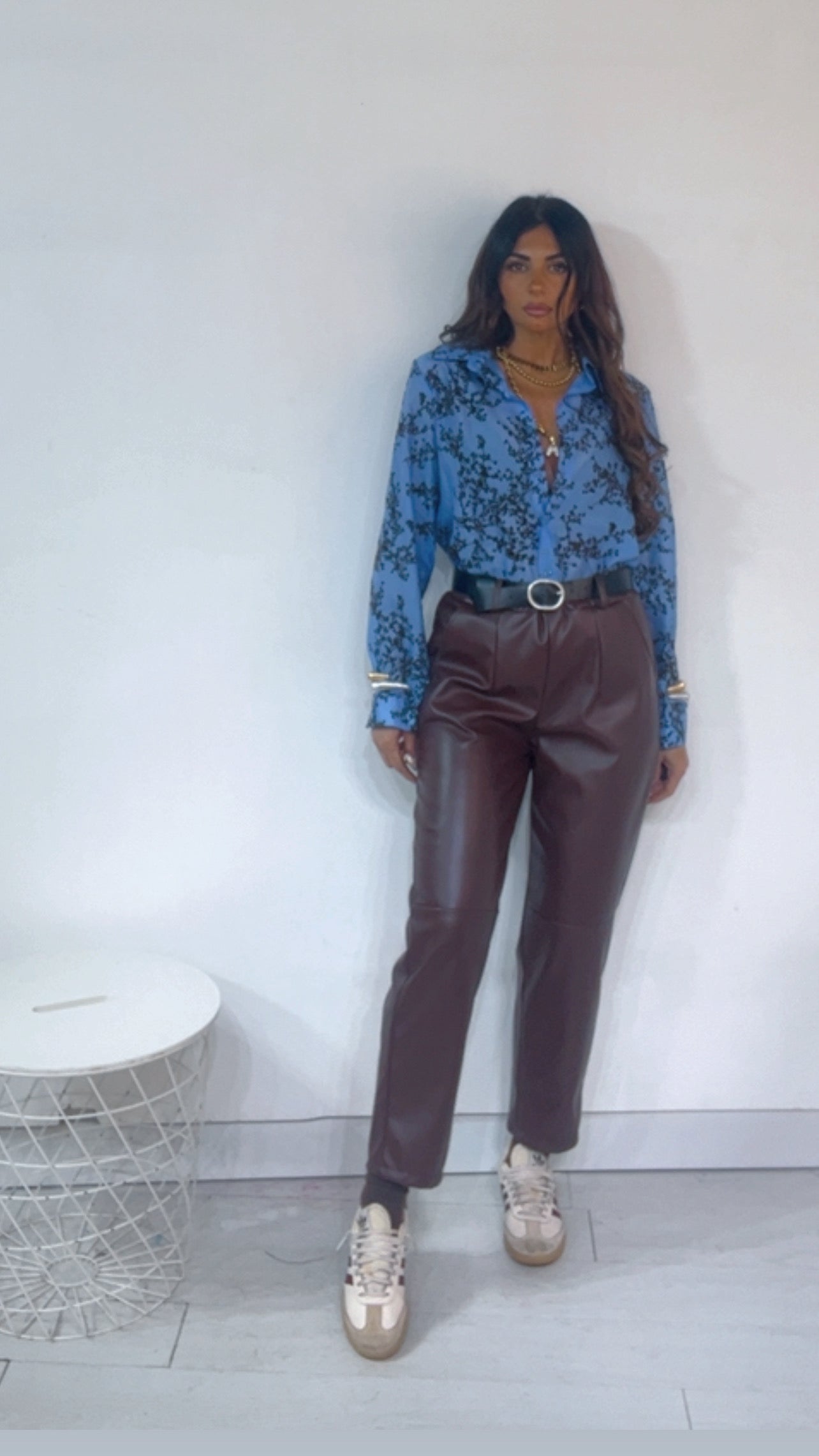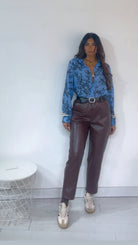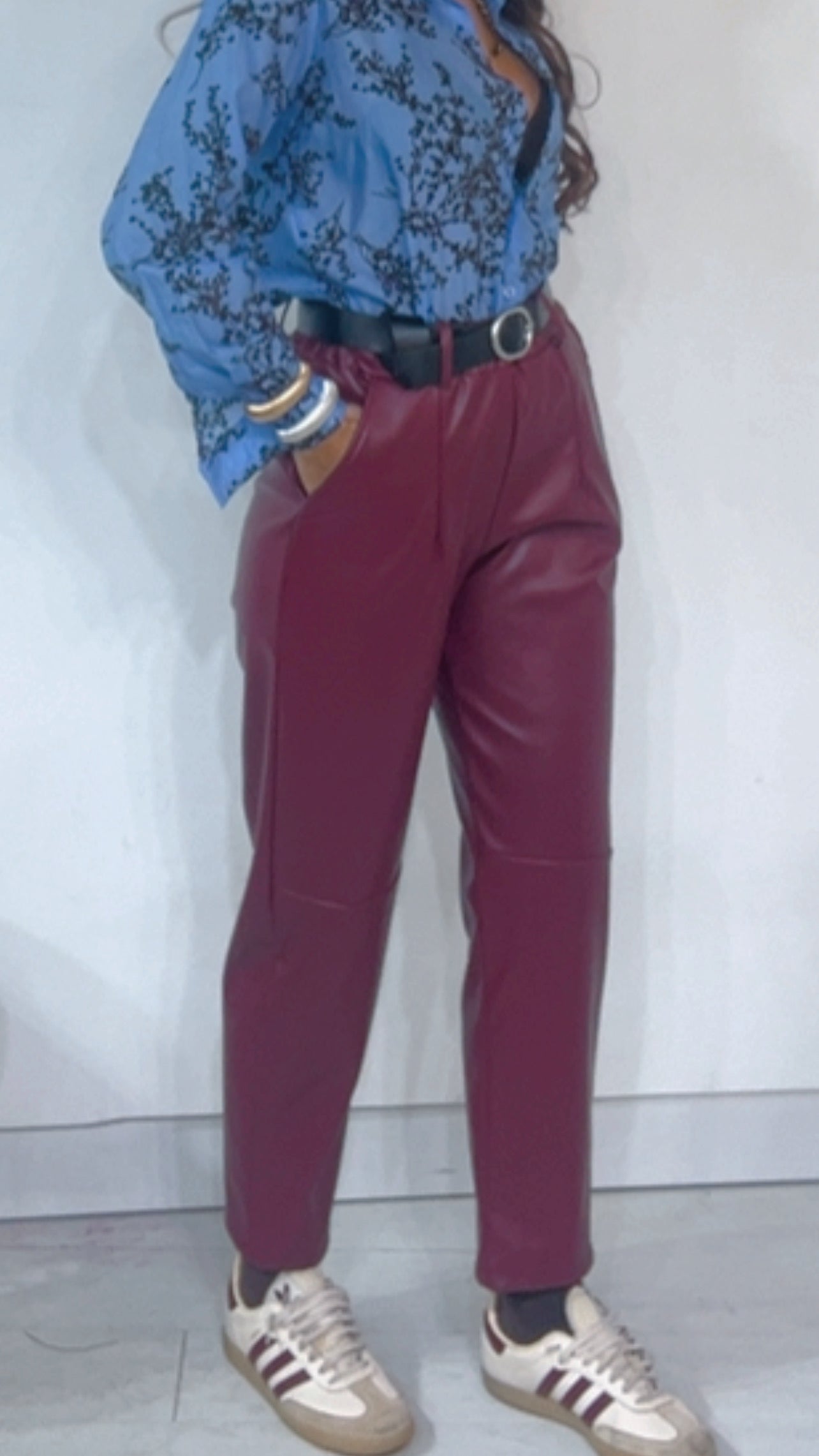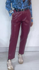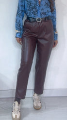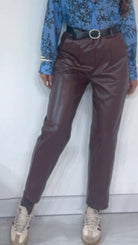 Pantalone vita alta con ‘Elastico’, ‘Cintura’ compresa. Modello a ‘Sigaretta’ alla ‘Caviglia’. In ‘EcoPelle’.