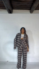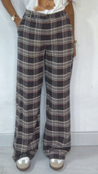 Pantalone fantasia ‘Scozia’, con ‘Elastico’ sul retro. In Tessuto ‘Flanella’. Modello a ‘Palazzo’.