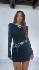 Abitino scollo leggermente a ‘Barca’, con ‘Spalline’. In ‘Pizzo Crep’.