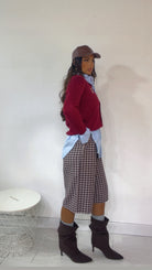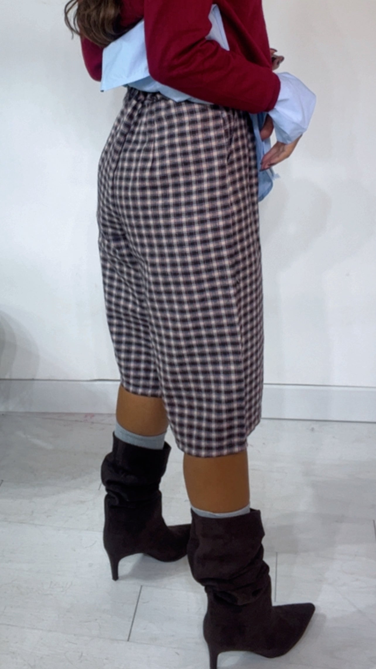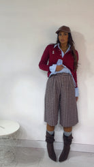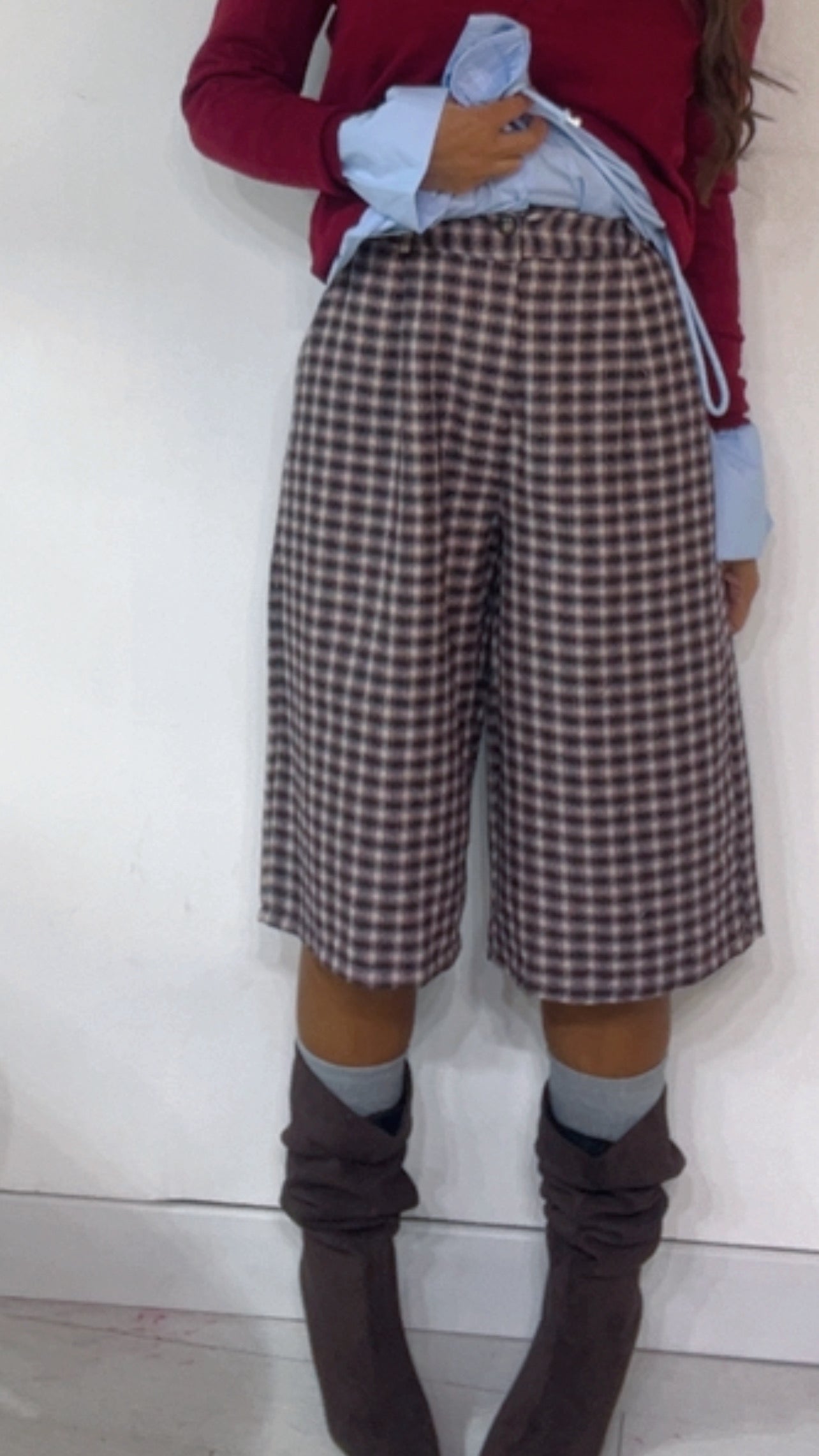 Bermuda fantasia ‘Quadri’, vita alta, elastico sul retro. In Tessuto ‘Flanella’.