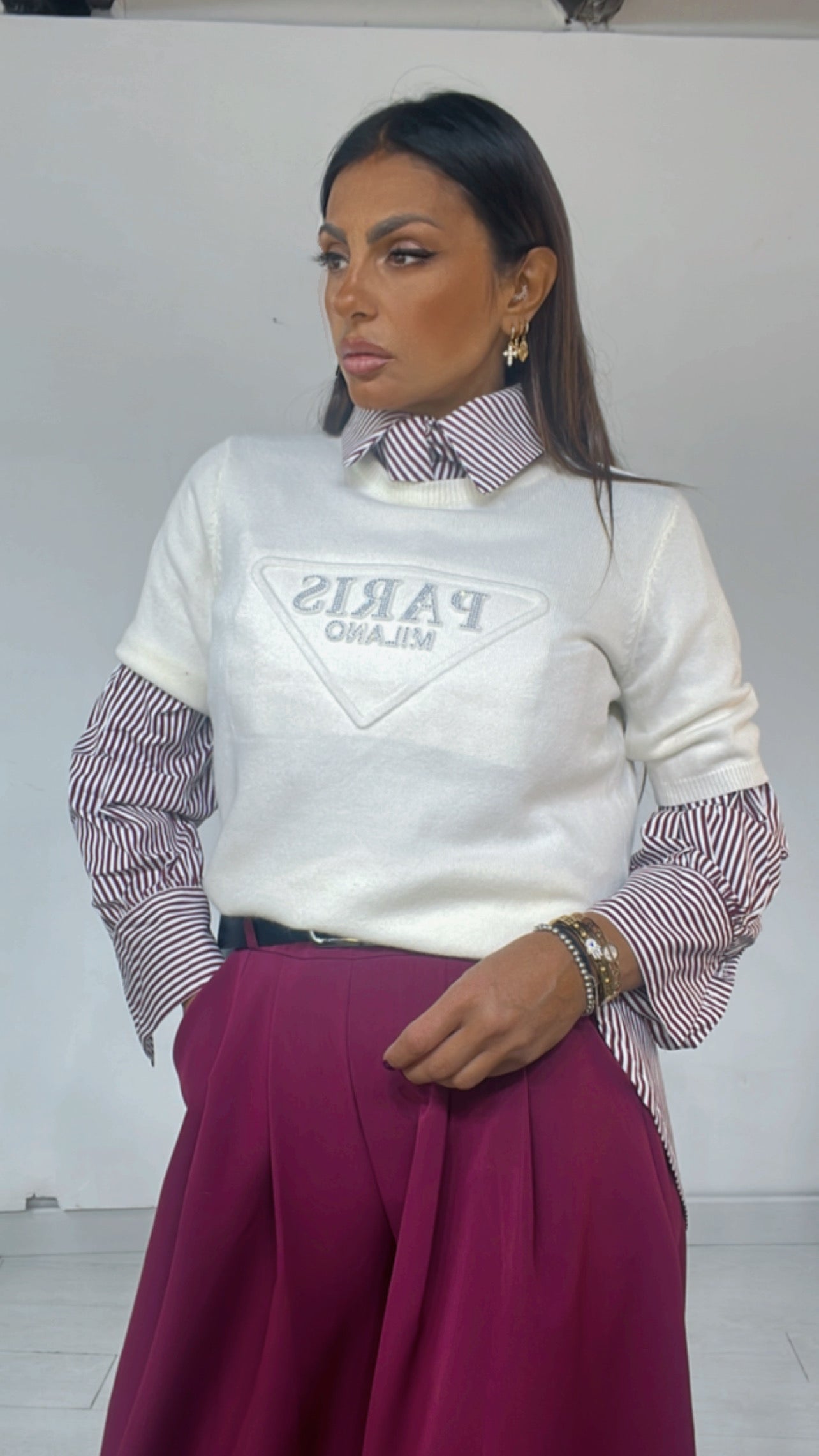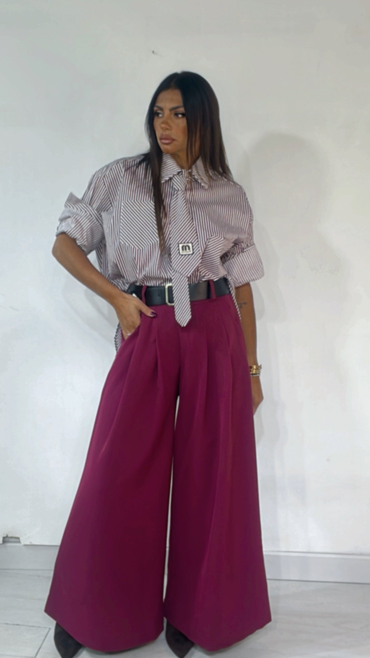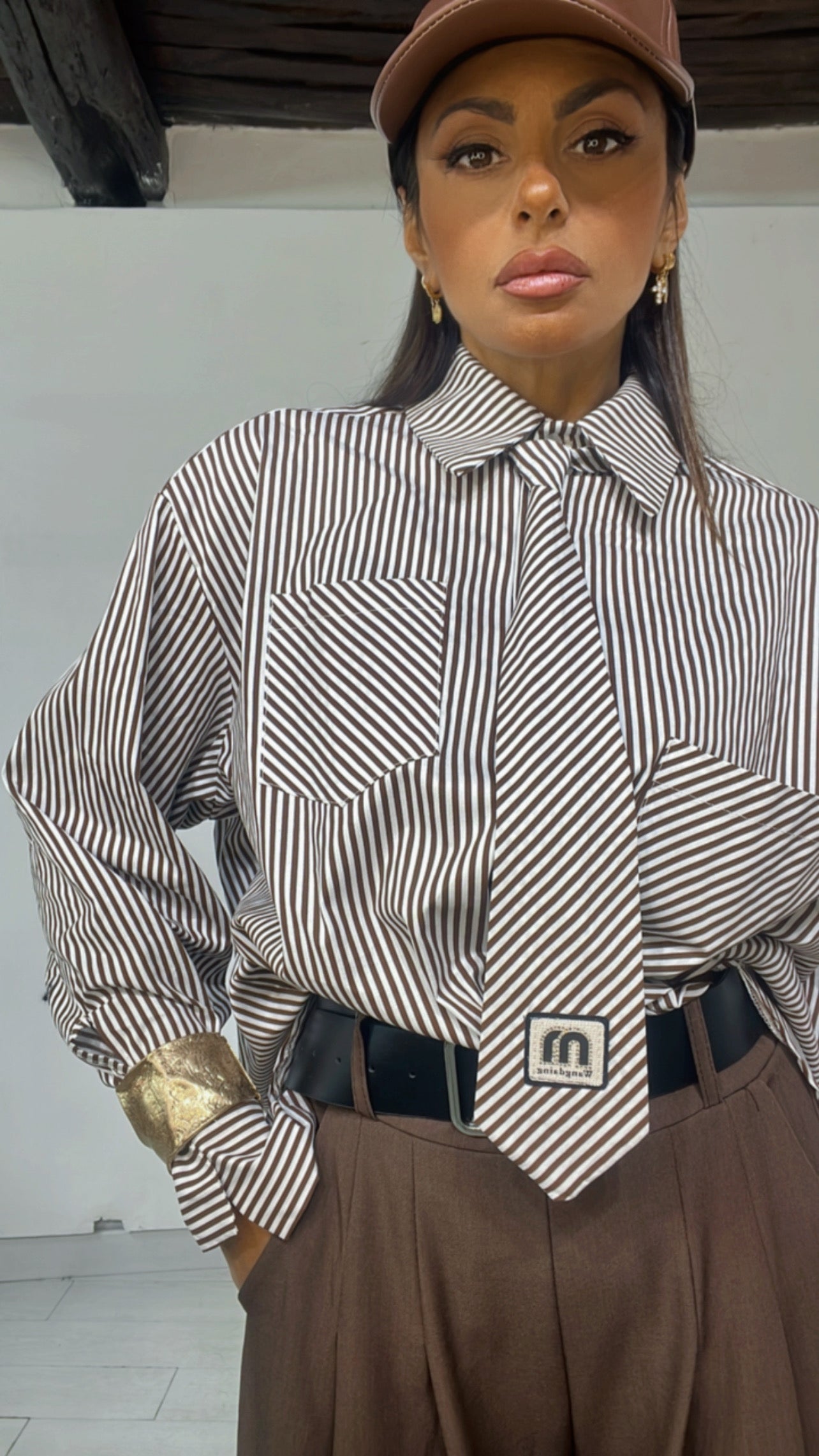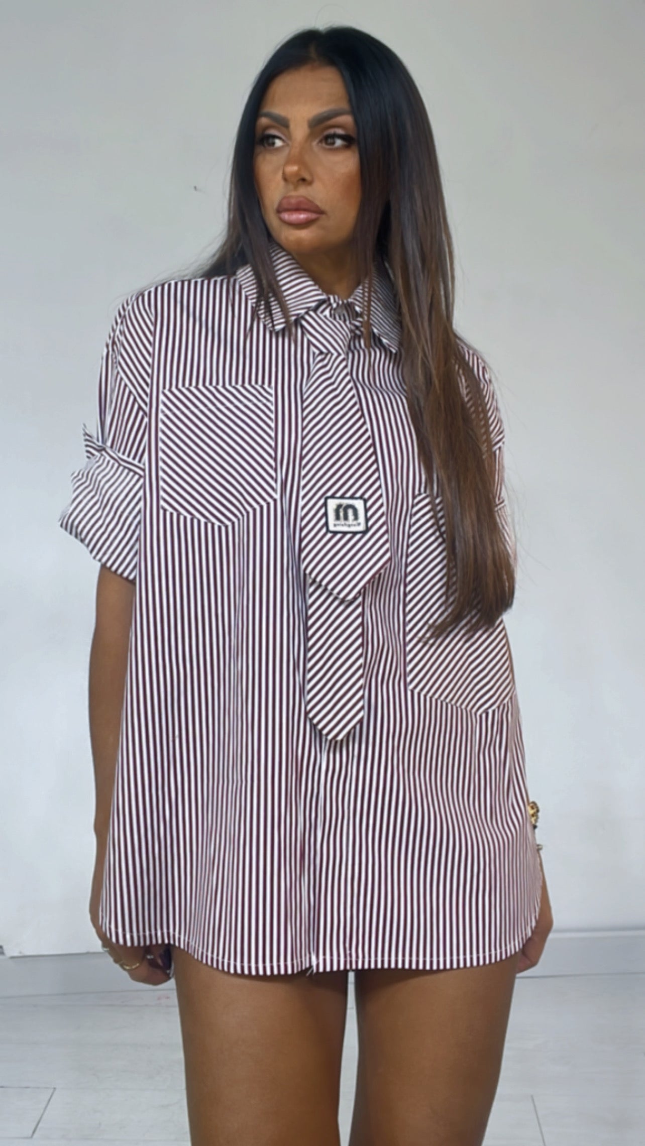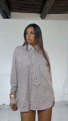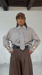 Camicia fantasia ‘Rows’, con ‘Cravatta’ applicata, ‘Tasconi’ davanti. Modello ‘Over’.