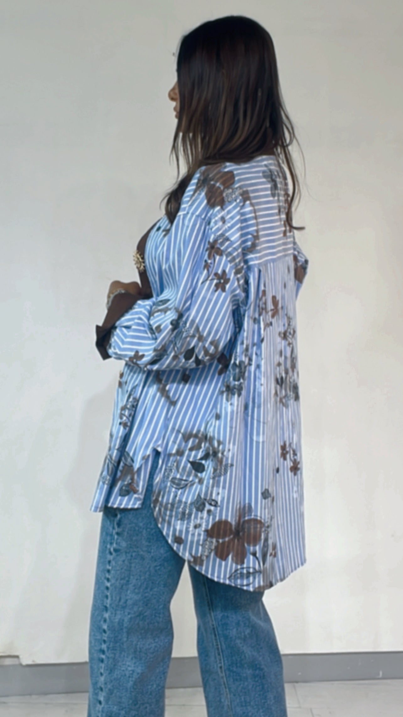 Camicia fantasia a ‘Righe’, Stampa a ‘Fiori’, chiusura bottoni ‘Sole’. In ‘Cotone’. Modello ‘Over’.