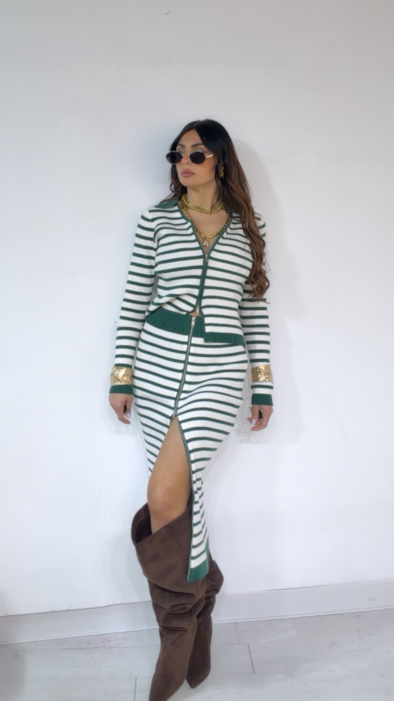 Coord Set ‘LUMINA’, fantasia ‘Righe’ composto da: Maglia con ‘Zip’ regolabile ‘Doppio Cursore’. Gonna vita alta con ‘Elastico’, ‘Zio’ regolabile ‘Doppio Cursore’.