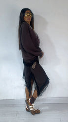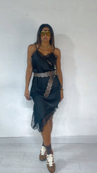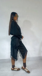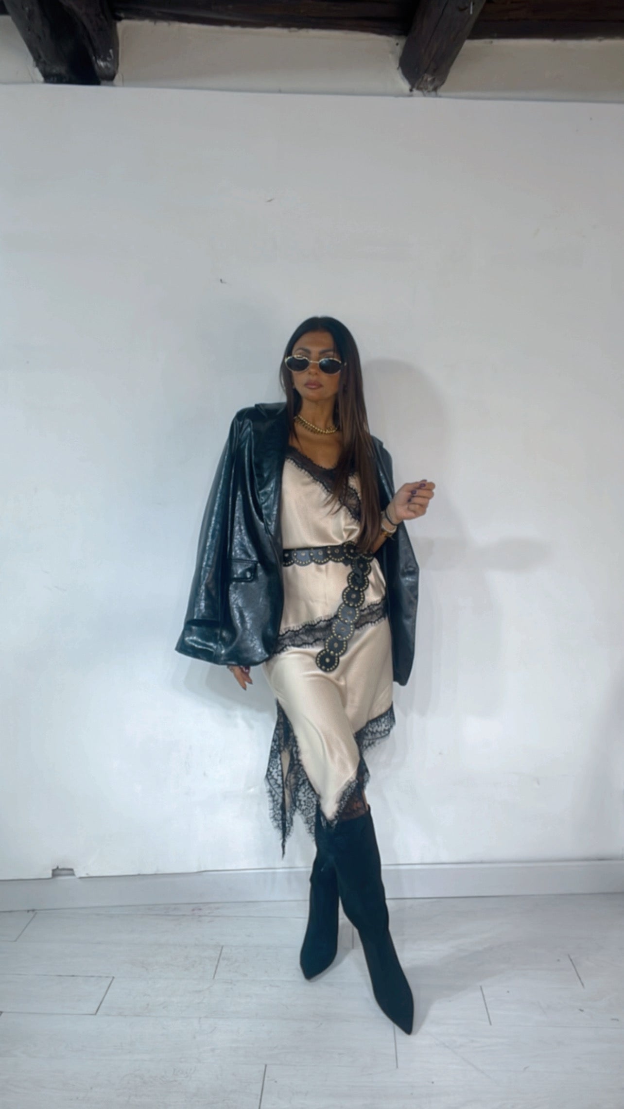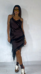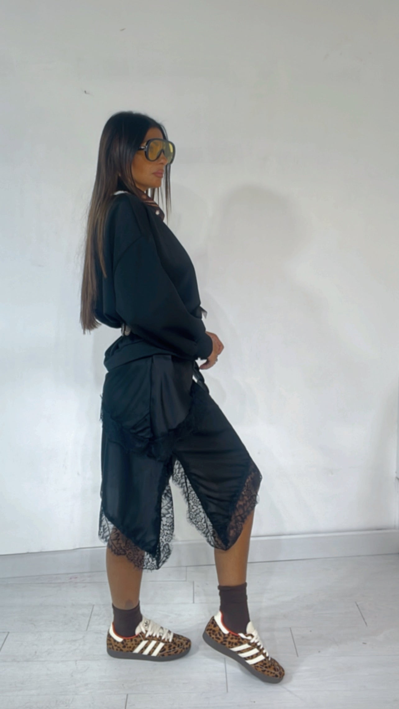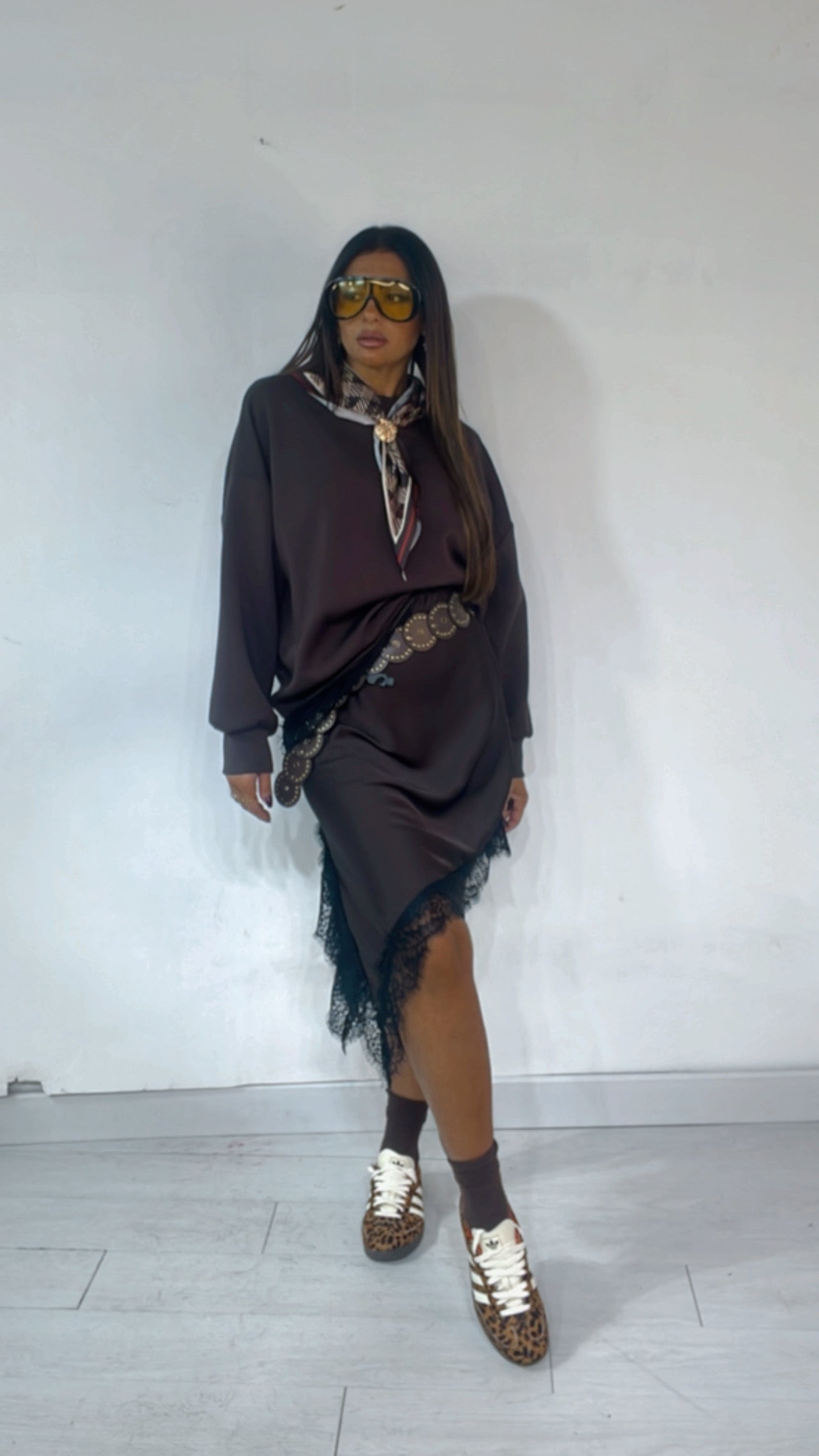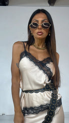 Coord Set ‘In ‘Raso’ con ‘Inserti’ in ‘Pizzo’ composto da: Top con bretelle ‘Elastiche’. Gonna con ‘Elastico’ in vita, ‘Spacco Laterale’, fondo ‘Asimmetrico’.