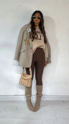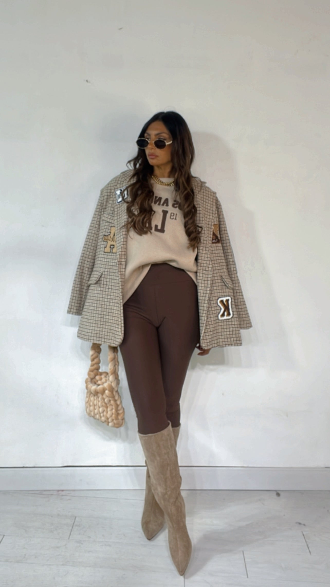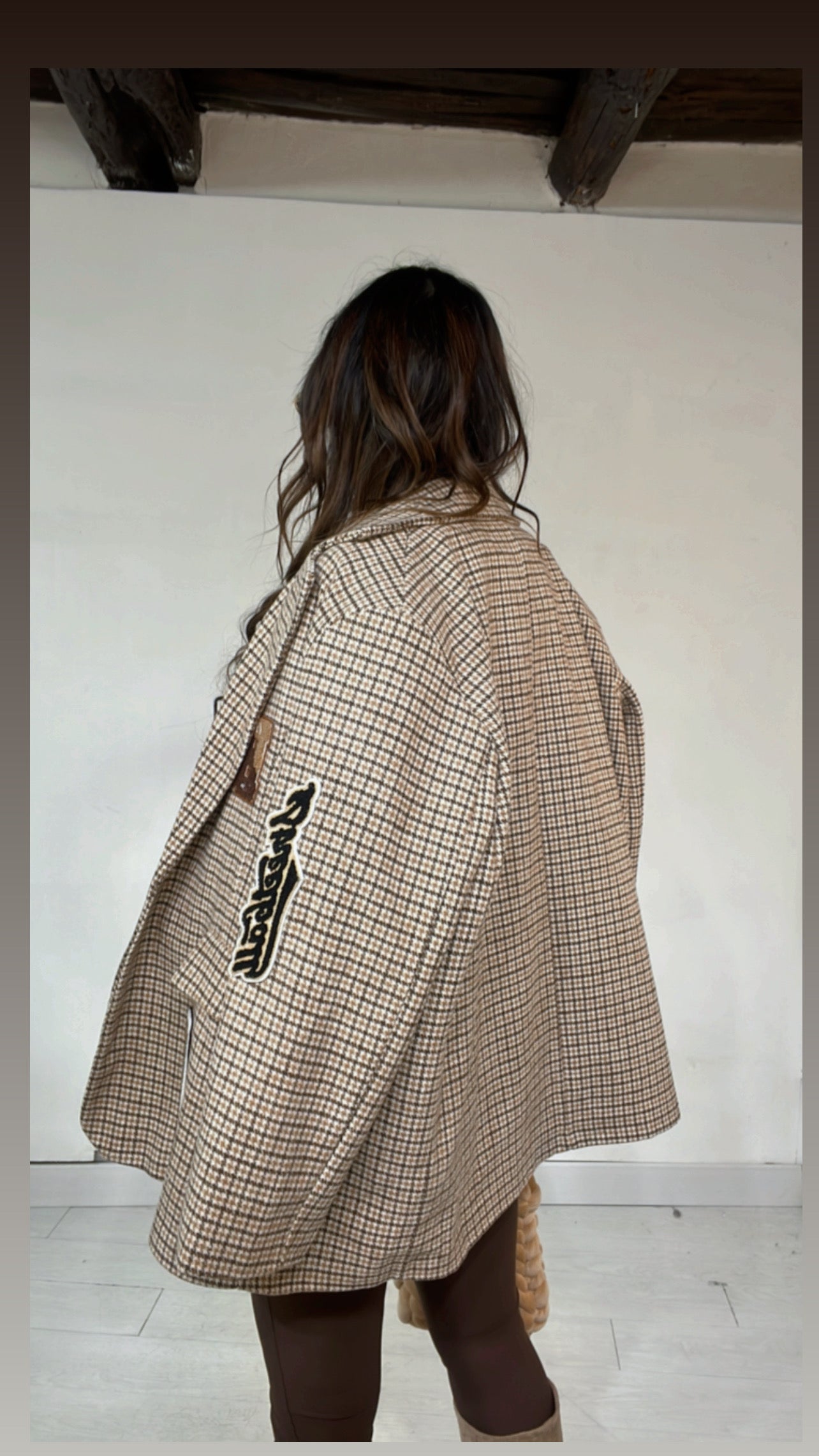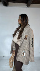 Blazer fantasia ‘Pied de Poule’, con applicazione di ‘Patch’, con ‘Spalline e Pettine’. Tessuto ‘Cappottino’.
