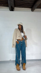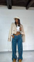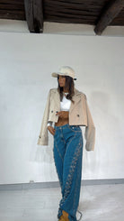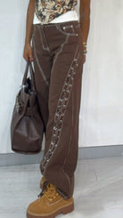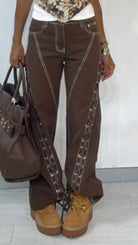 Jeans con ‘Stringhe’ davanti, ‘Bacchettature’ a ‘Contrasto’. Trama non ‘Elastica’.