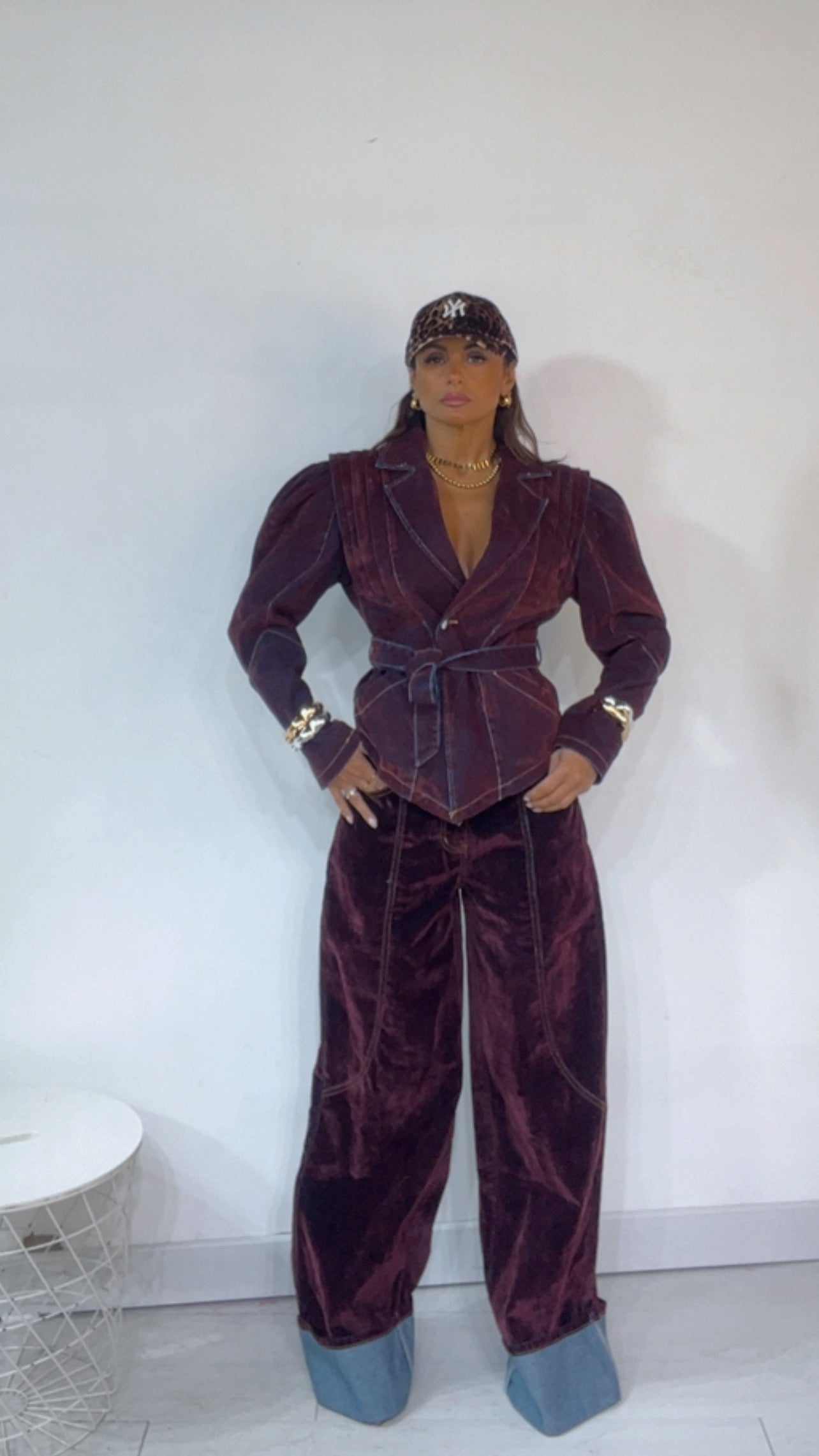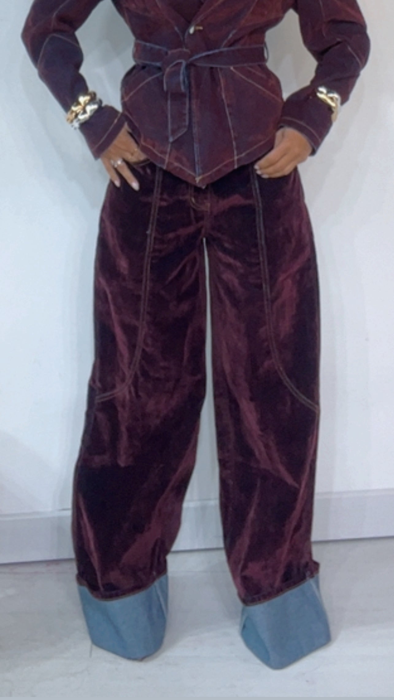 Jeans, tasche particolari sul retro, con ‘Piegone’ sul fondo. Modello ‘Wide Leg’ leggermente ‘Balloon’. In ‘Denim’ ricoperto di ‘Velluto’.