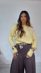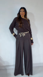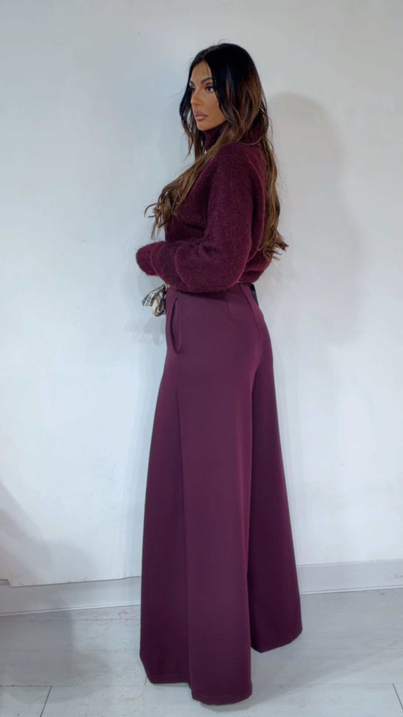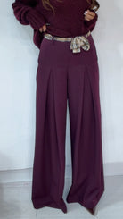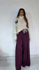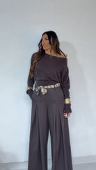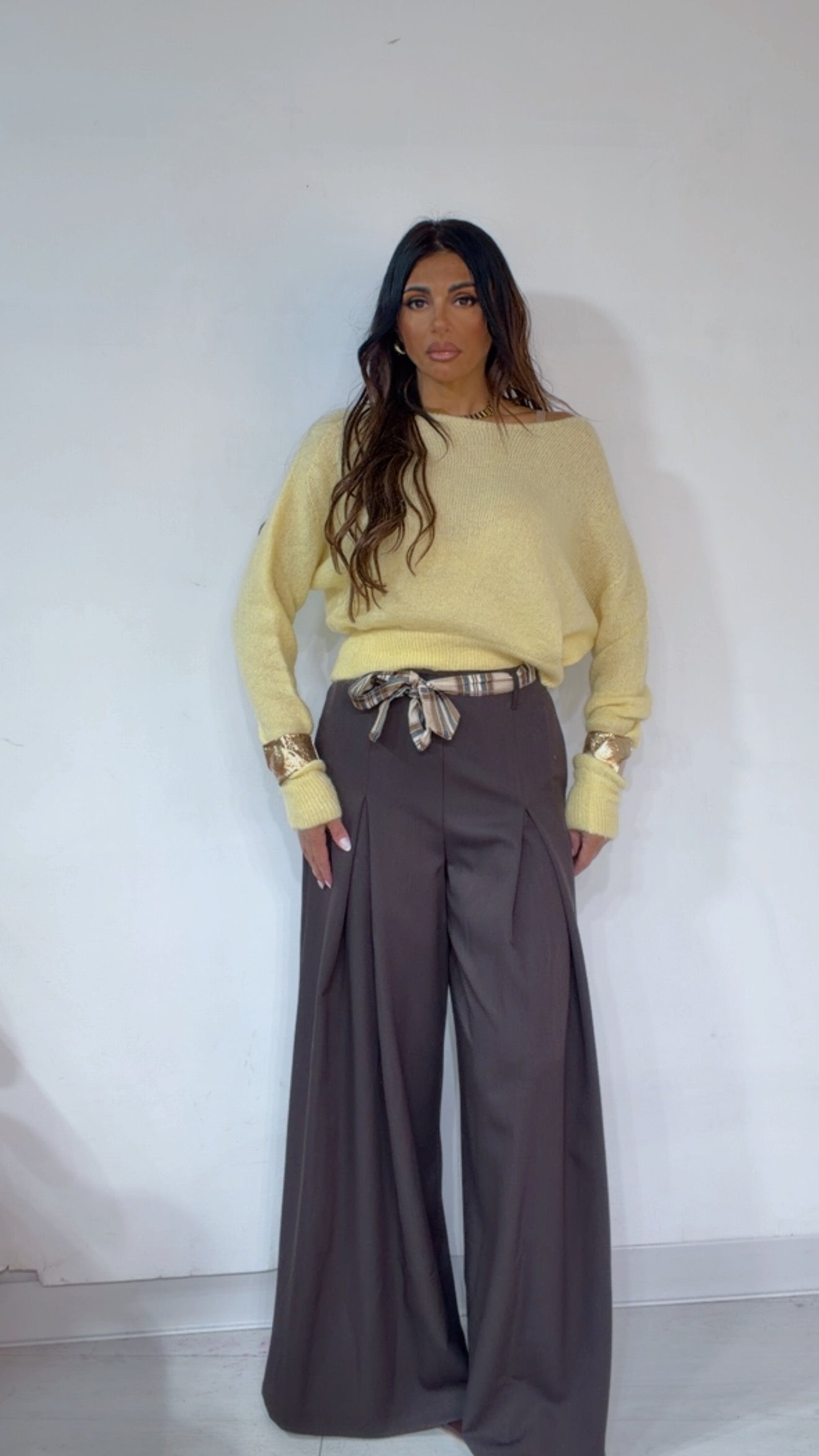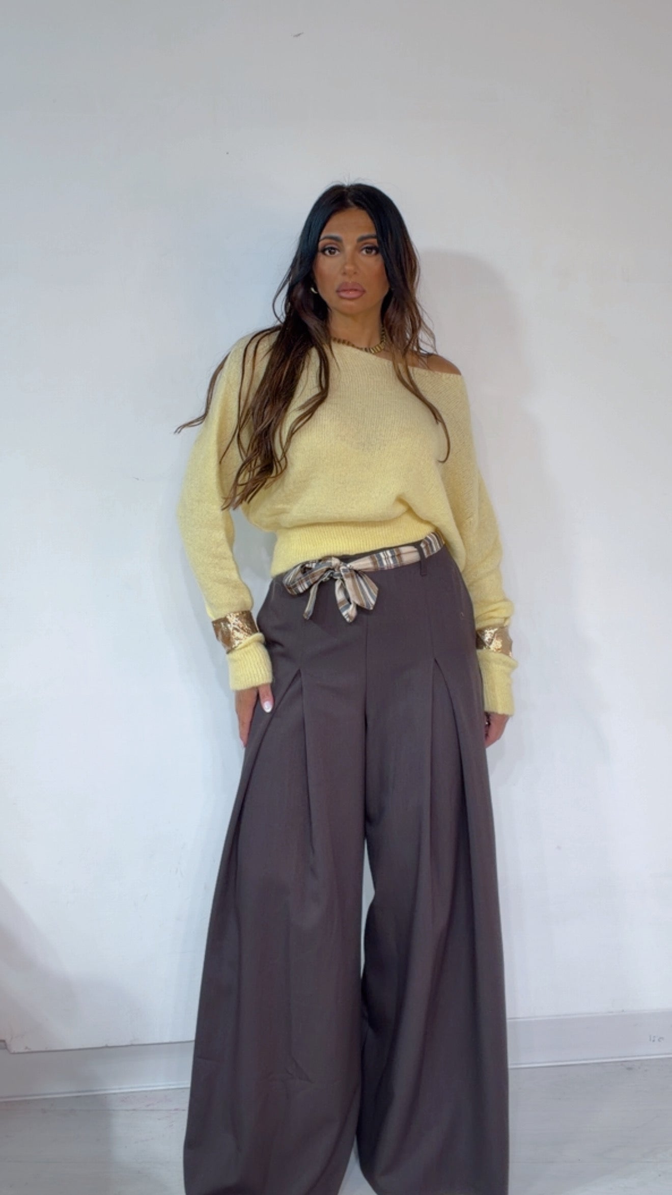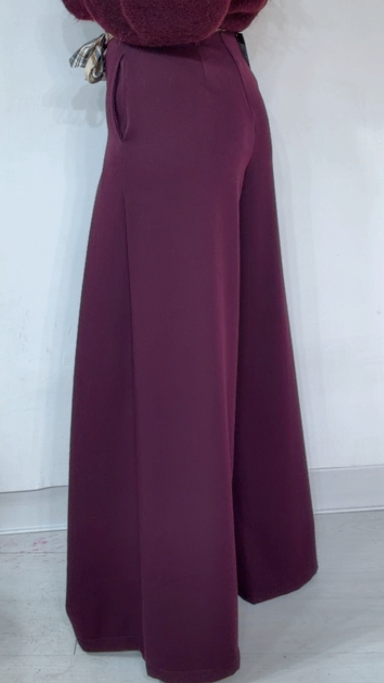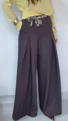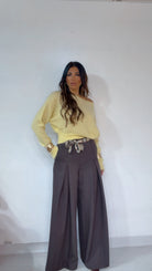 Pantalone ‘Simona G’ leggermente vita bassa, ‘Pence’ davanti, ‘Foulard’ compreso, ‘Elastico’ sul retro. Modello a ‘Palazzo’.