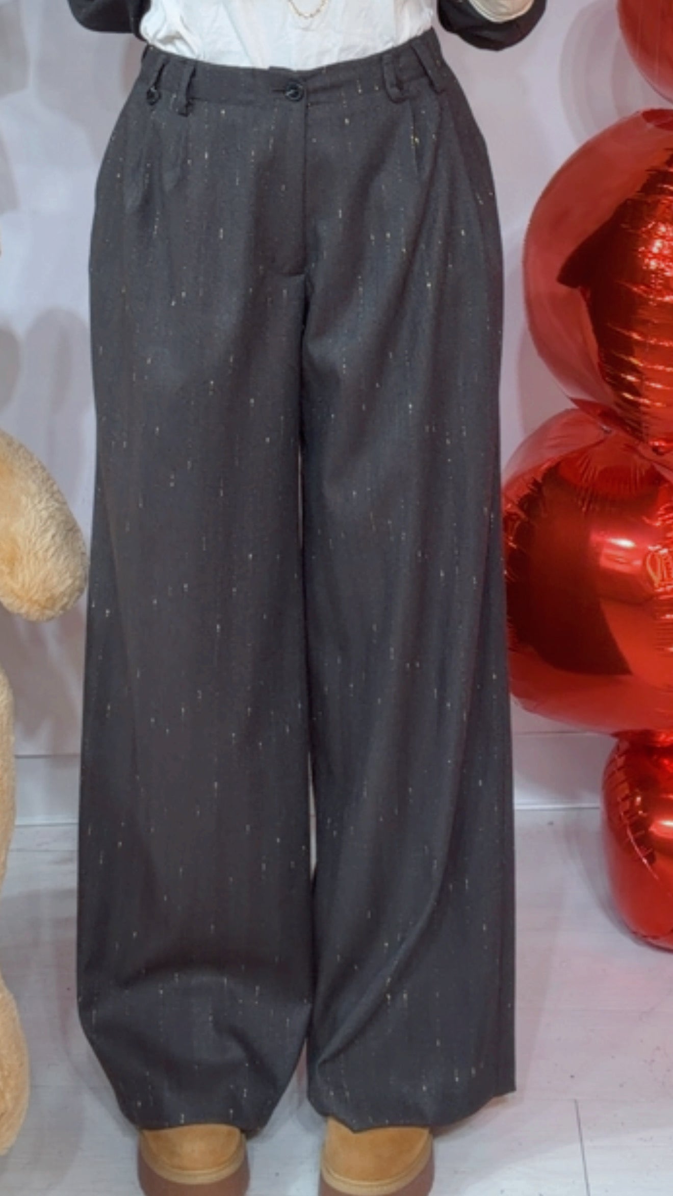 Pantalone vita alta, ‘Pence’ davanti, con ‘Tasche’, Elastico’ sul retro. Modello a ‘Palazzo’. In ‘Lanettina Pettinata’.