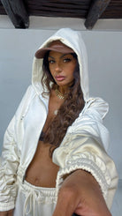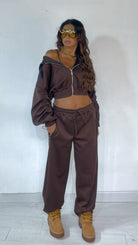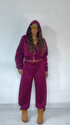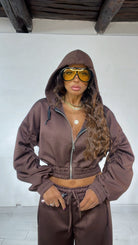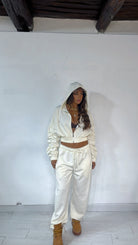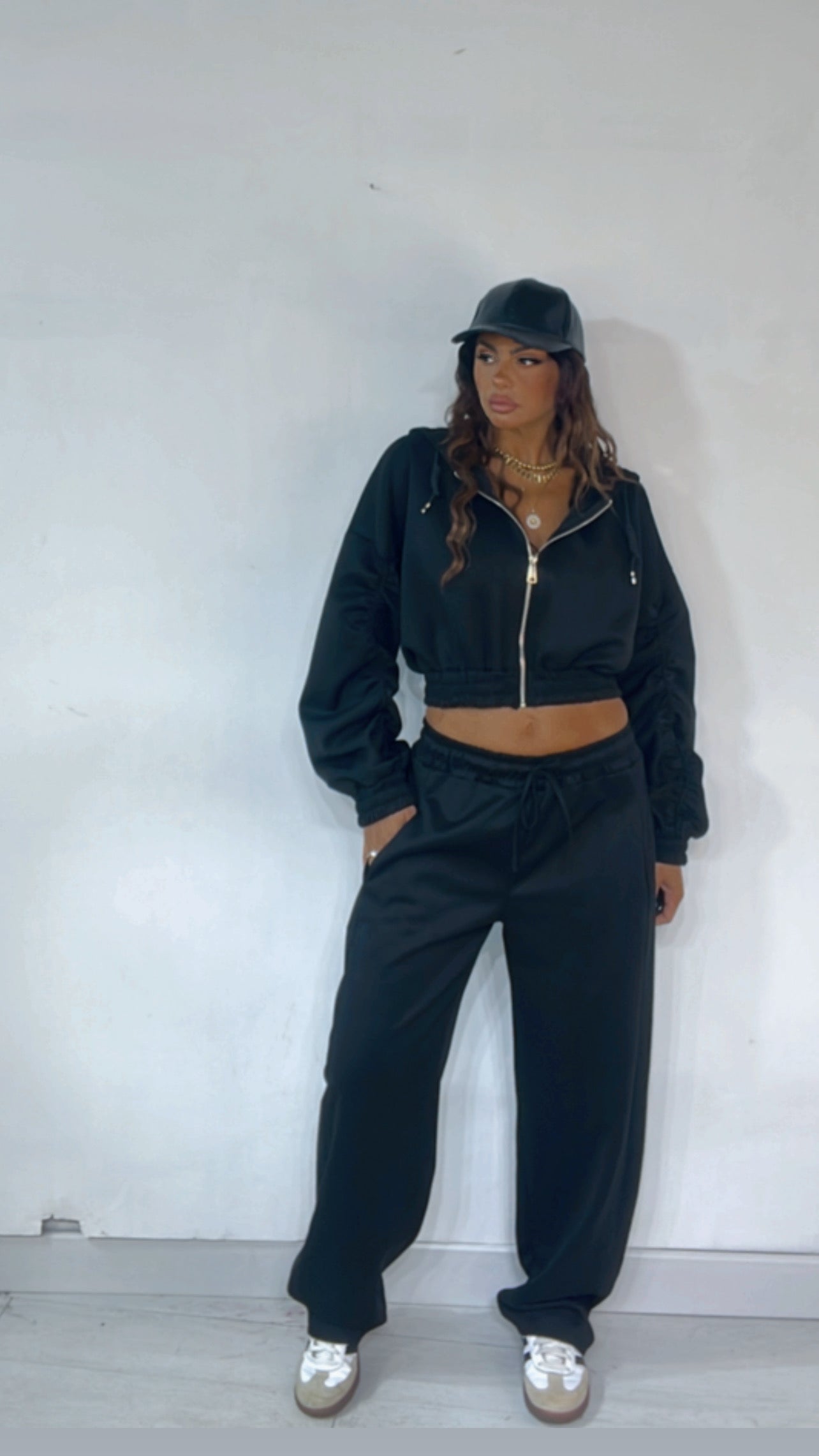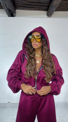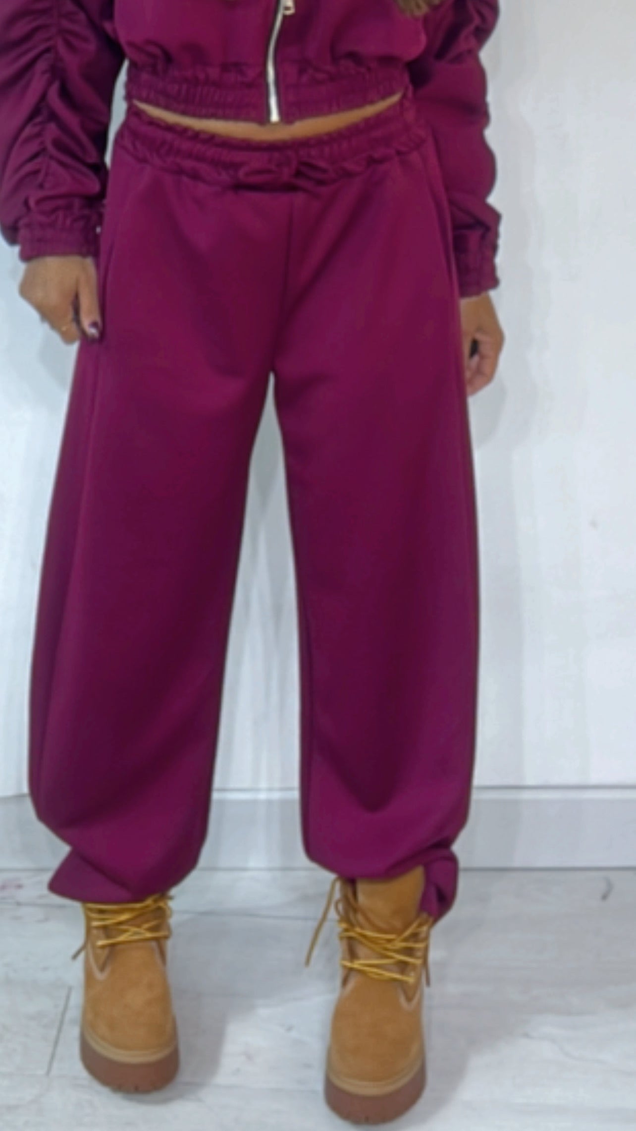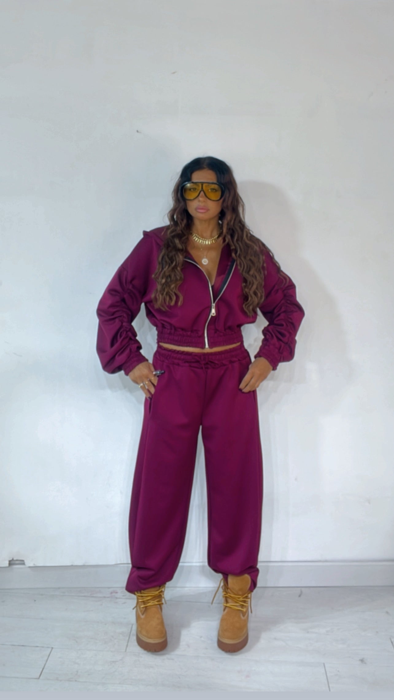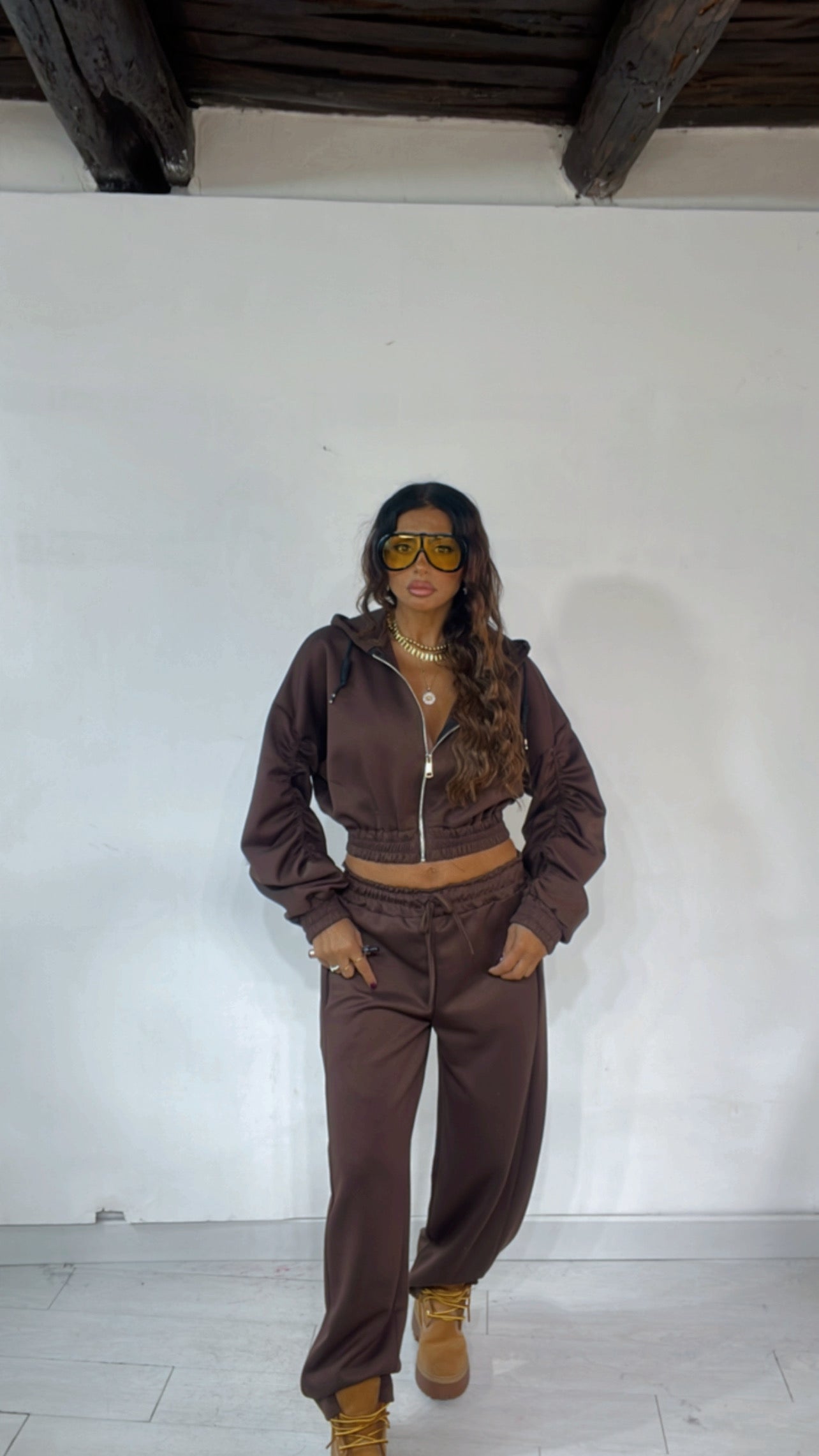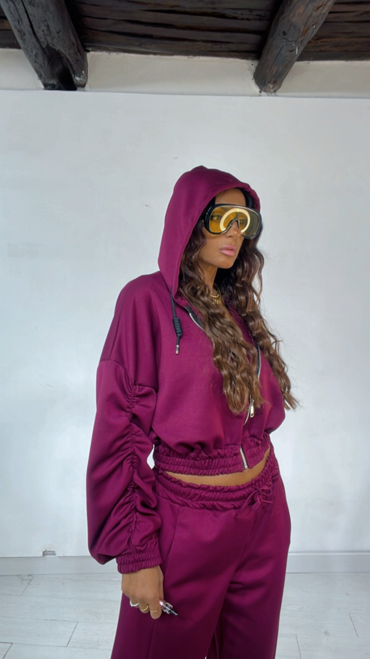 Tuta in ‘Viscosa’, interno non ‘Felpato’ composta da: Felpa Crop con ‘Cappuccio e Laccetti’, manica ‘Arricciata/Drappeggiata’, chiusura ‘Zip’. Pantalone da indossare sia vita alta/vita bassa con ‘Elastico e Laccetti’. Modello Balloon.
