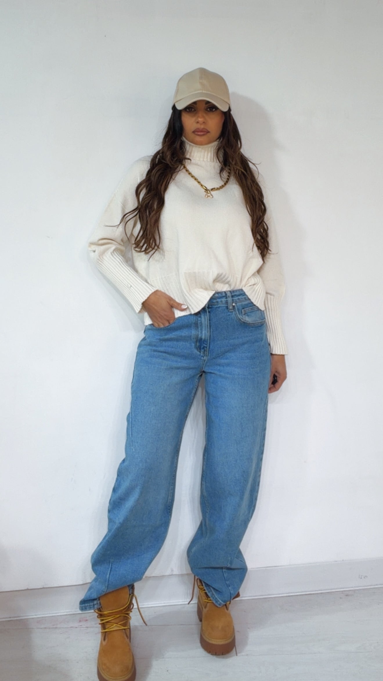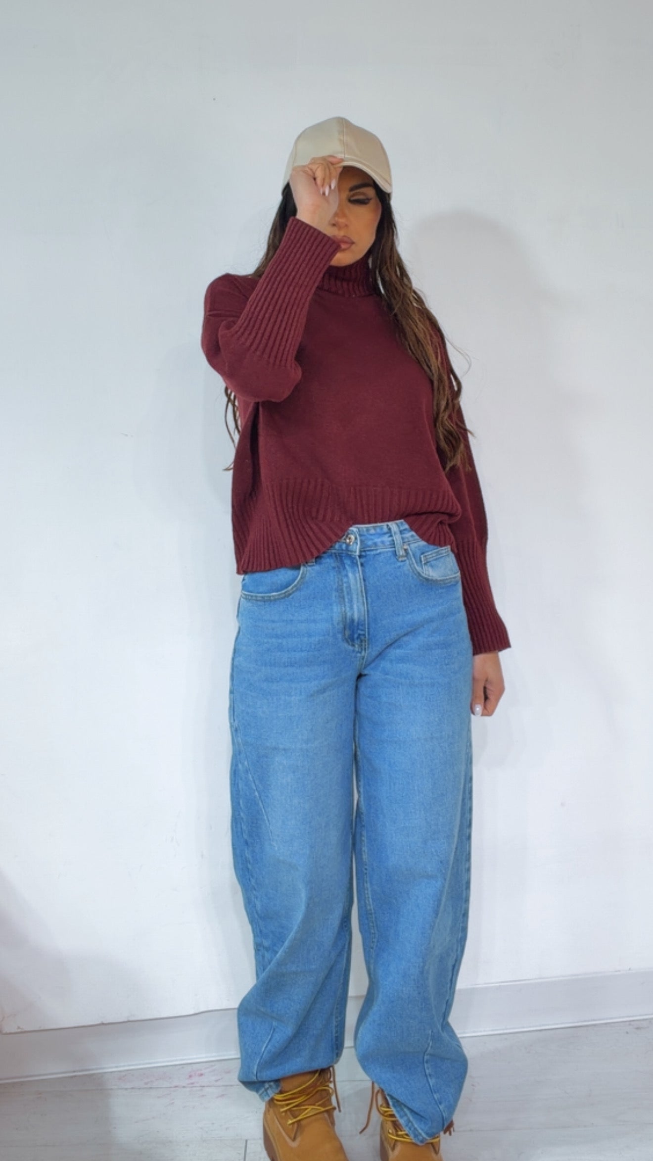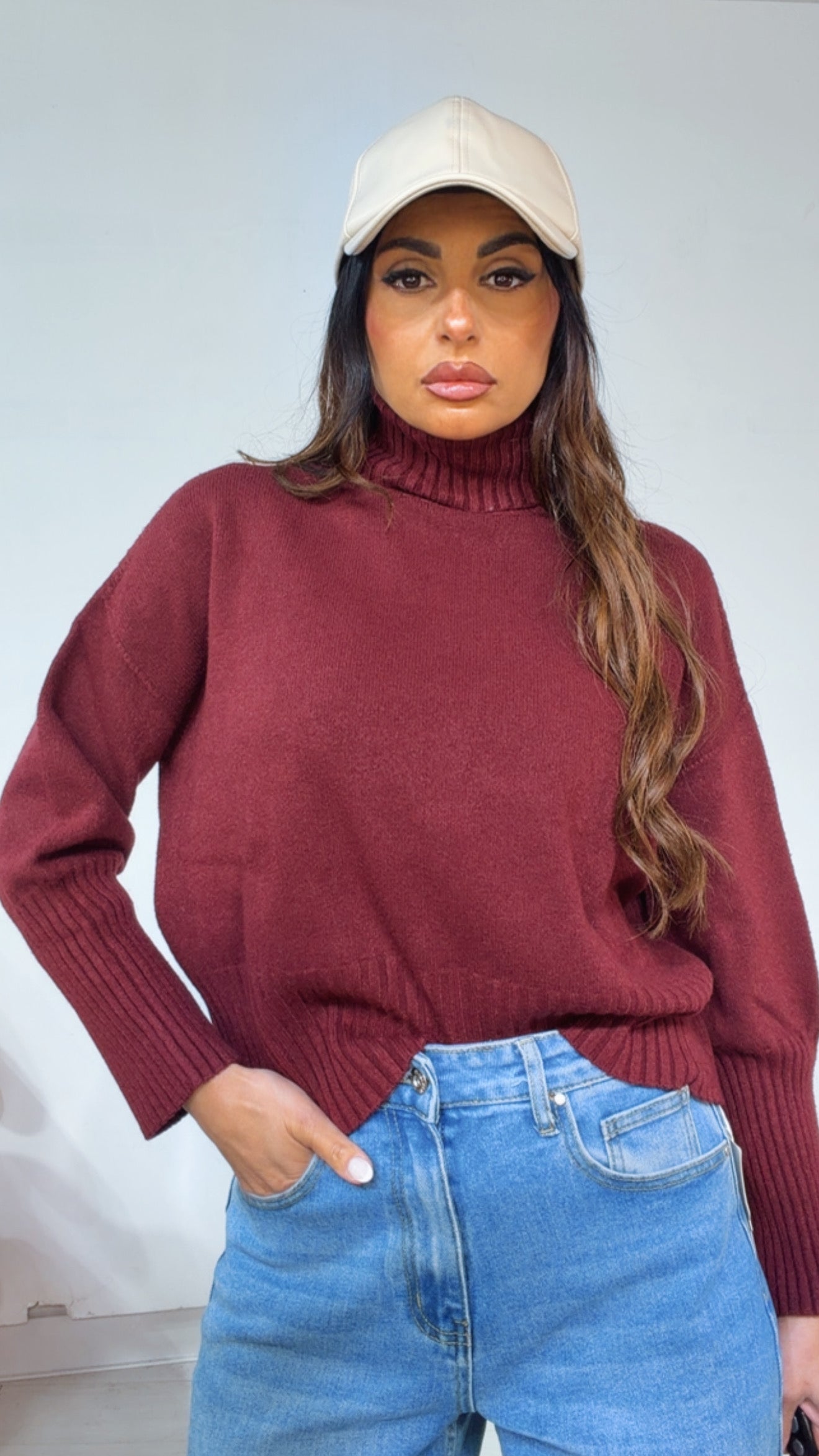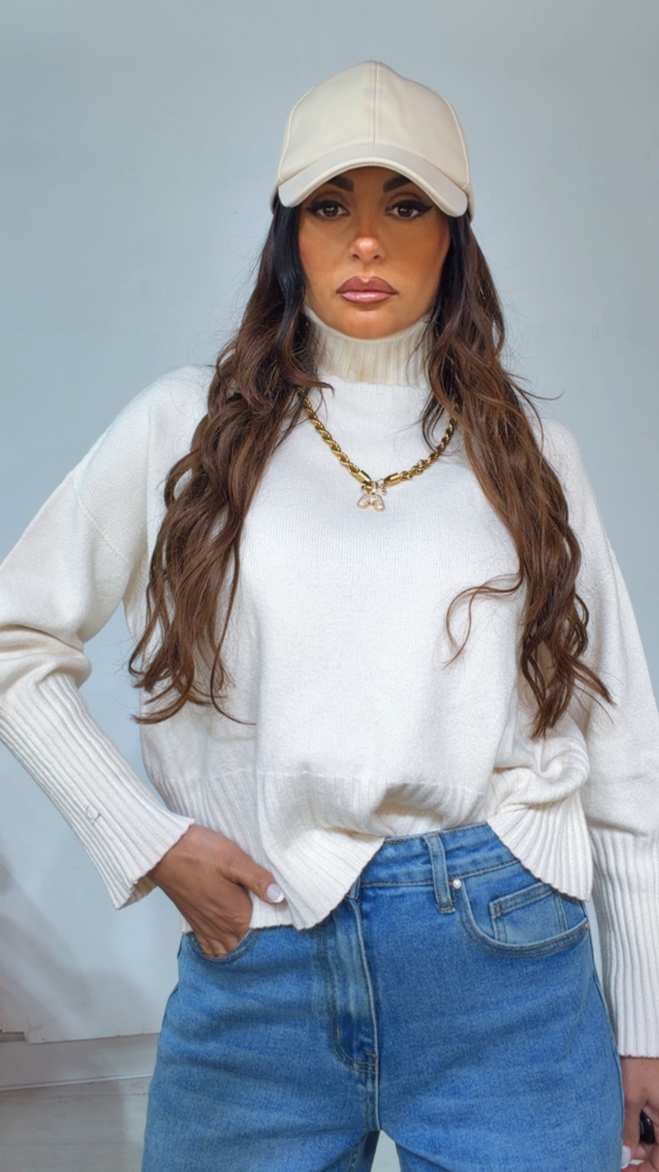 Pull ‘Simona G’ ‘Collo Alto’. Modello ‘Ampio’ con ‘Elastico’ in fondo e ai ‘Polsi’.