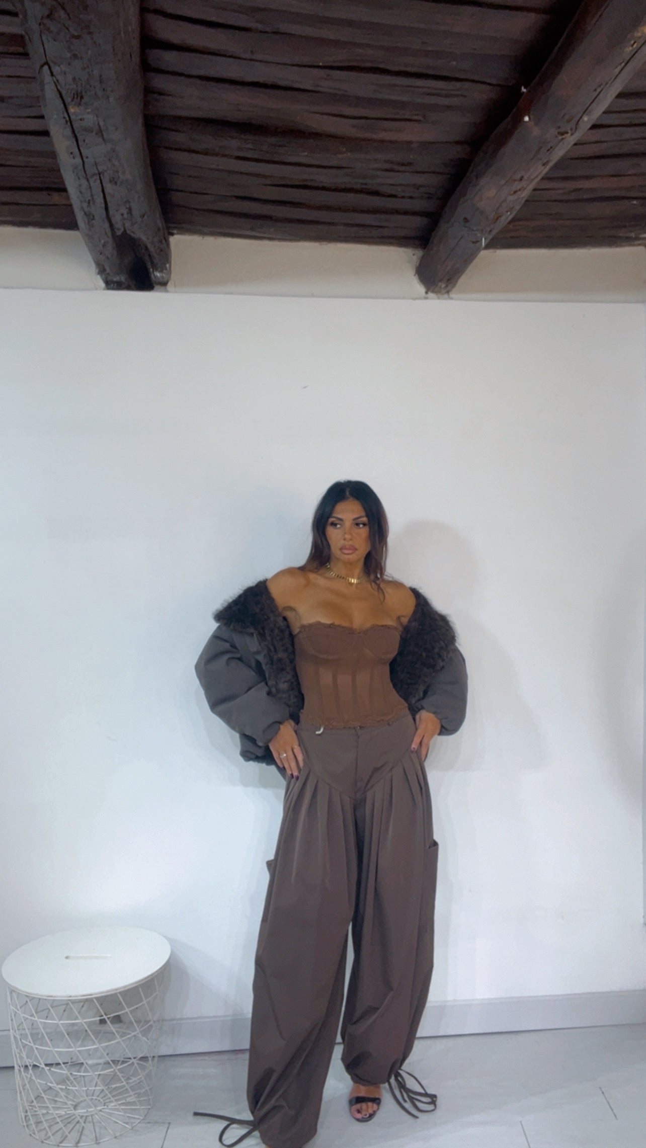 Bustino bordo con ‘Rouches’, ‘Laccetti’ sul retro regolabile. ‘Steccato’. In ‘Raso’.