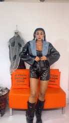 Bustino in ecopelle con presenza di coppe,fibie sul petto e chiusura con ciappe.
