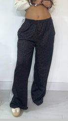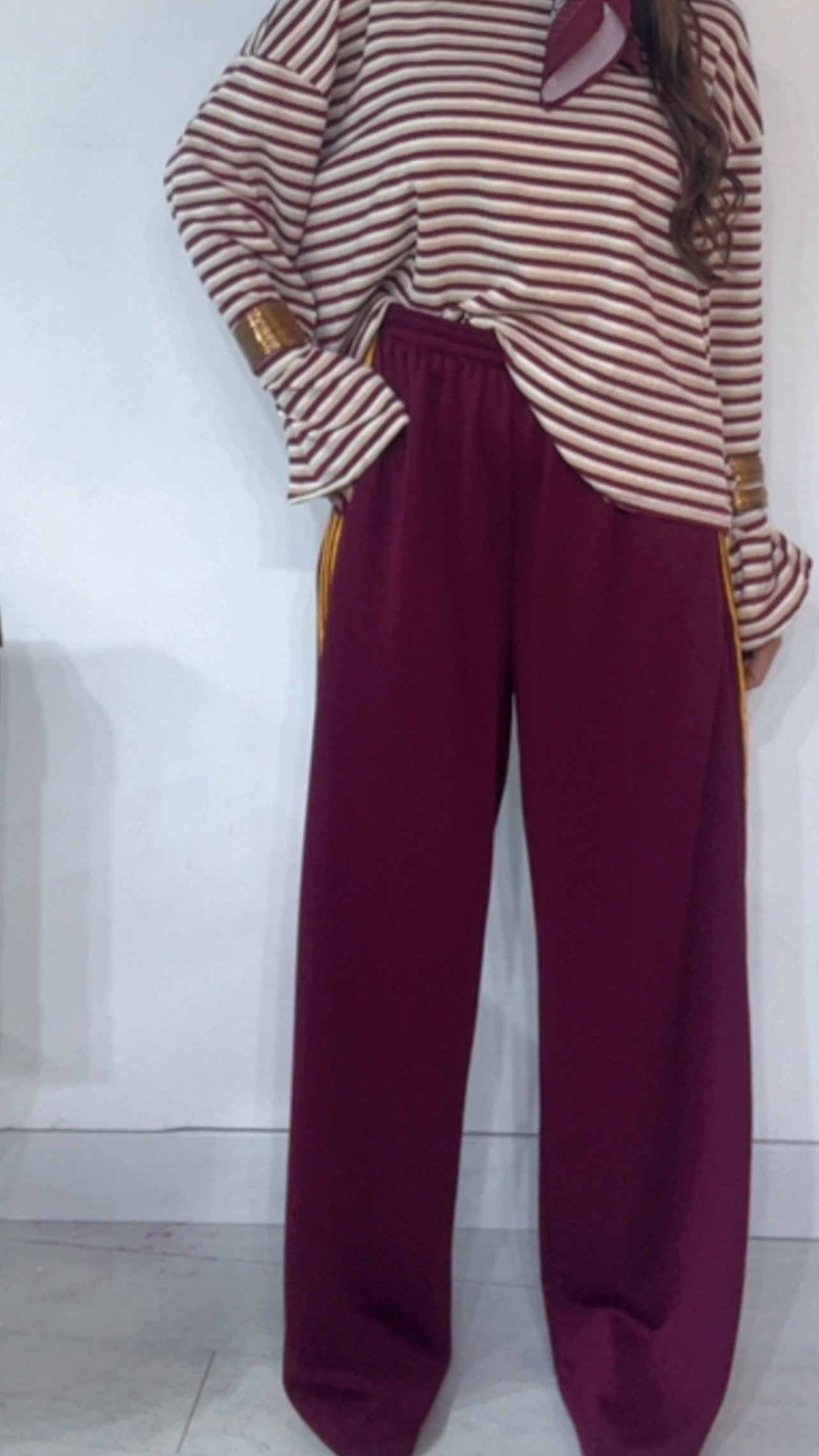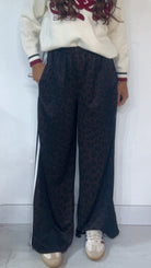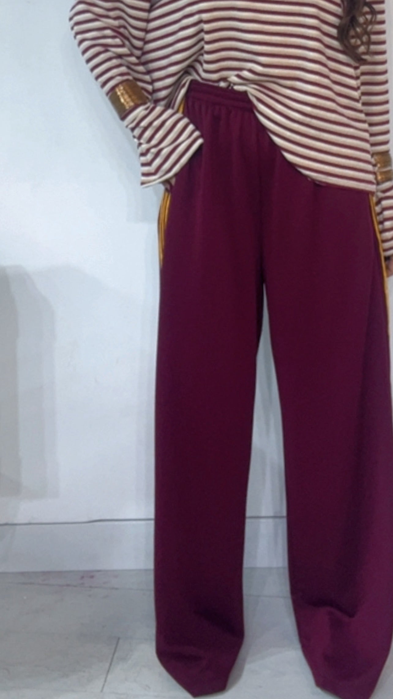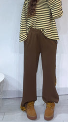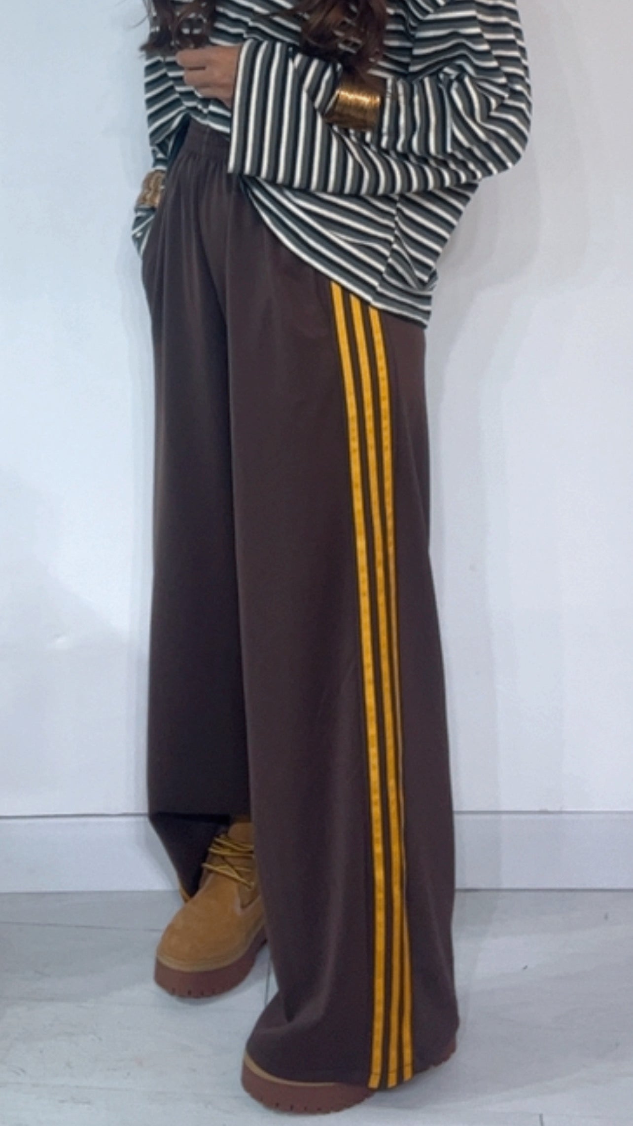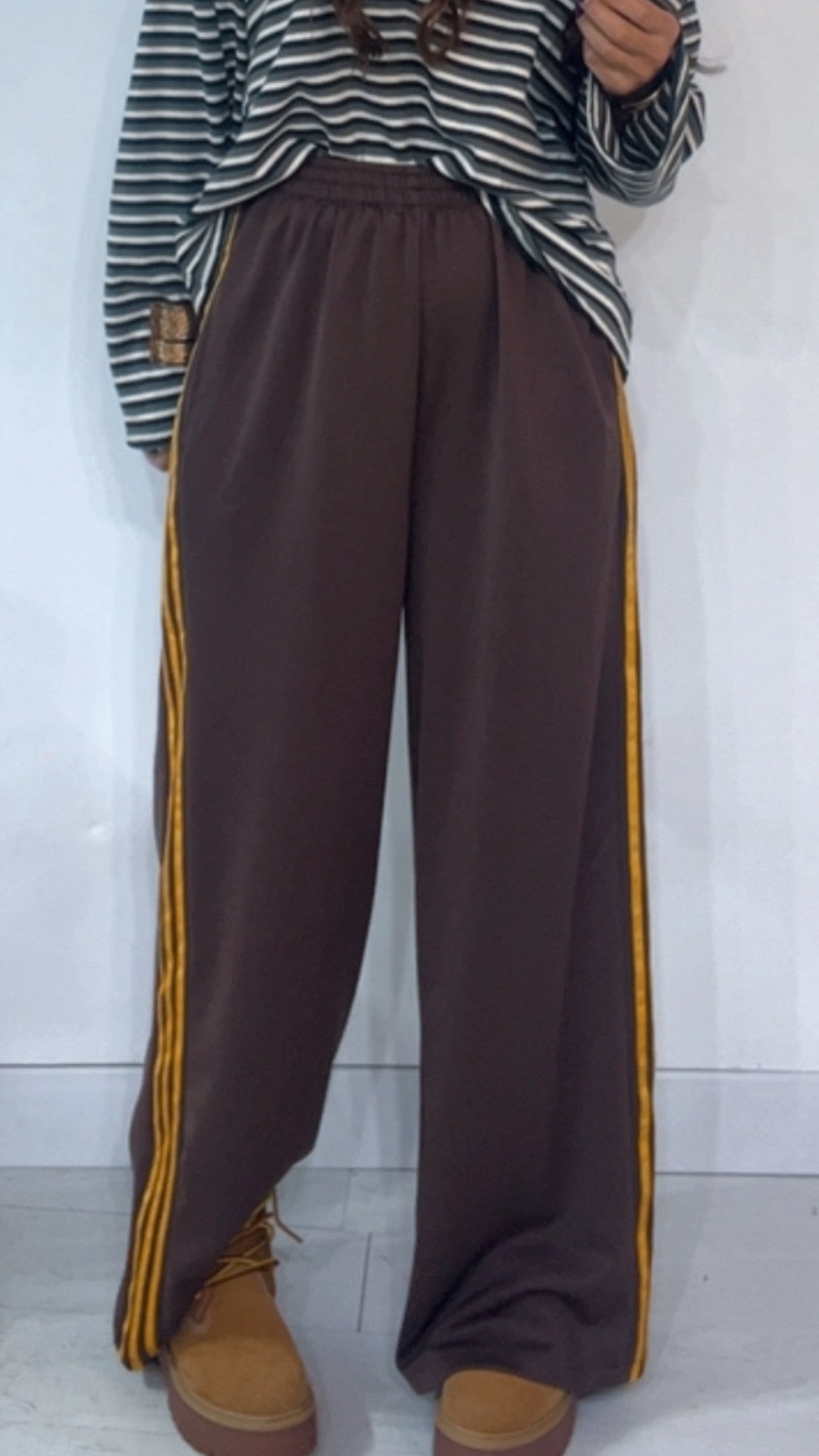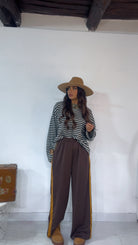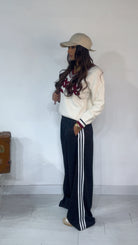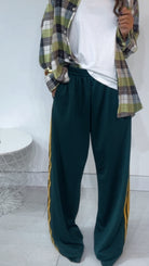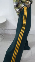 Pantalone da indossare sia vita alta/vita bassa con ‘Elastico’, ‘Banda Laterale’ a contrasto, con ‘Tasche’. Modello a Palazzo.
