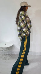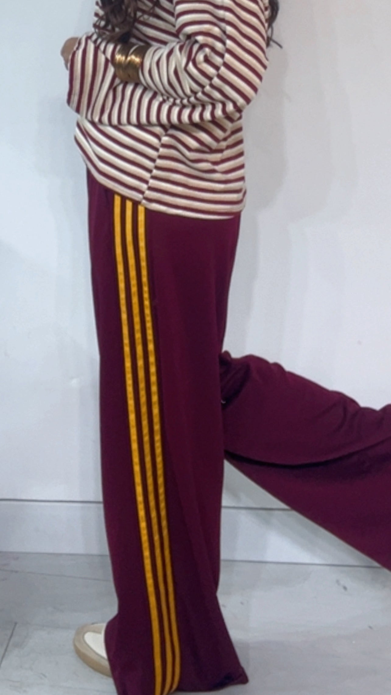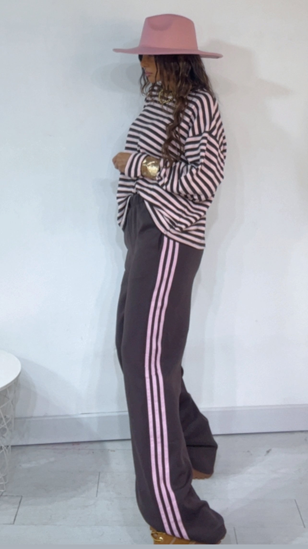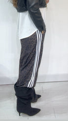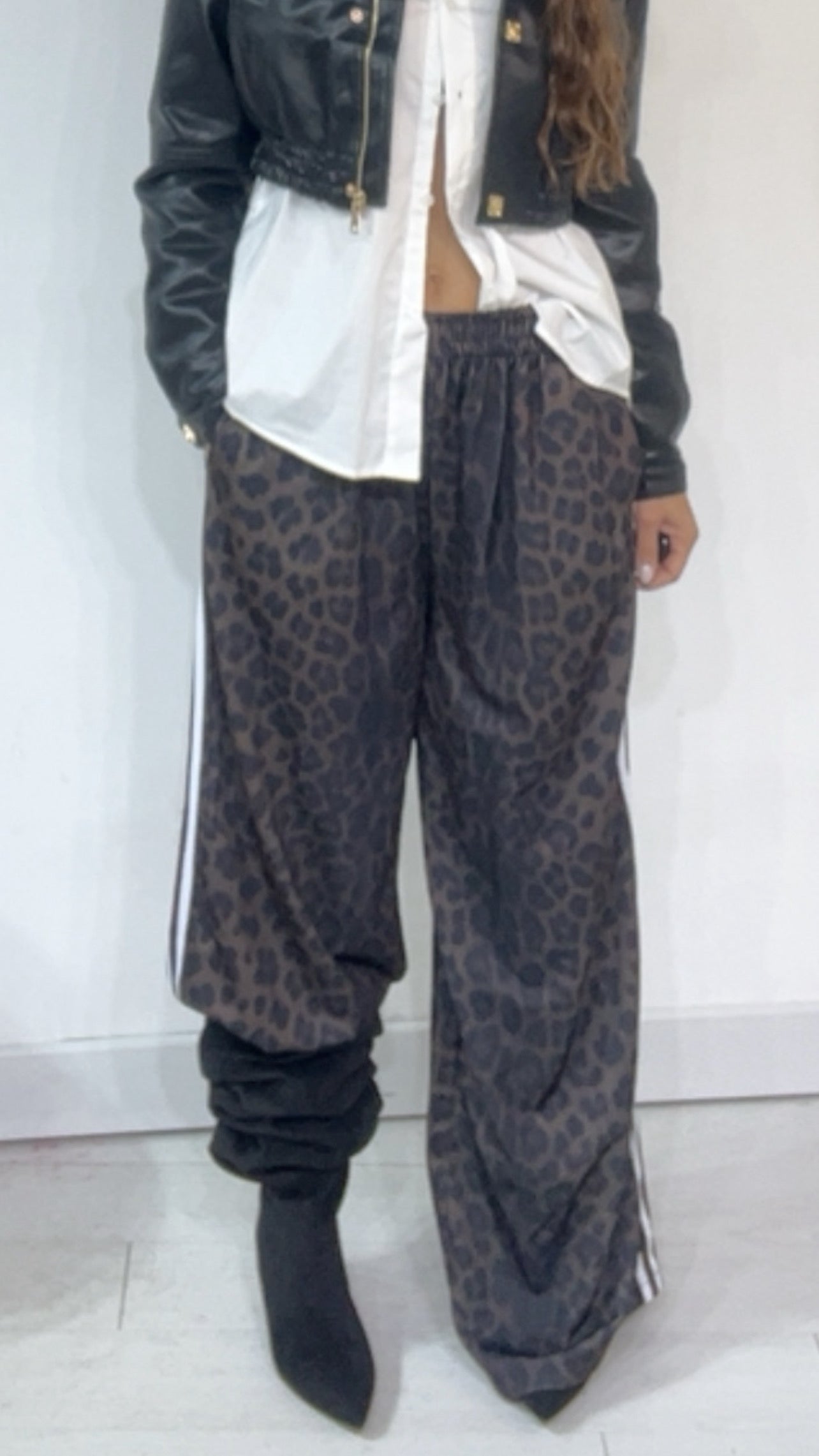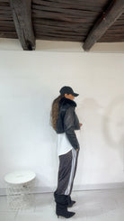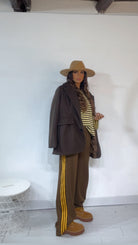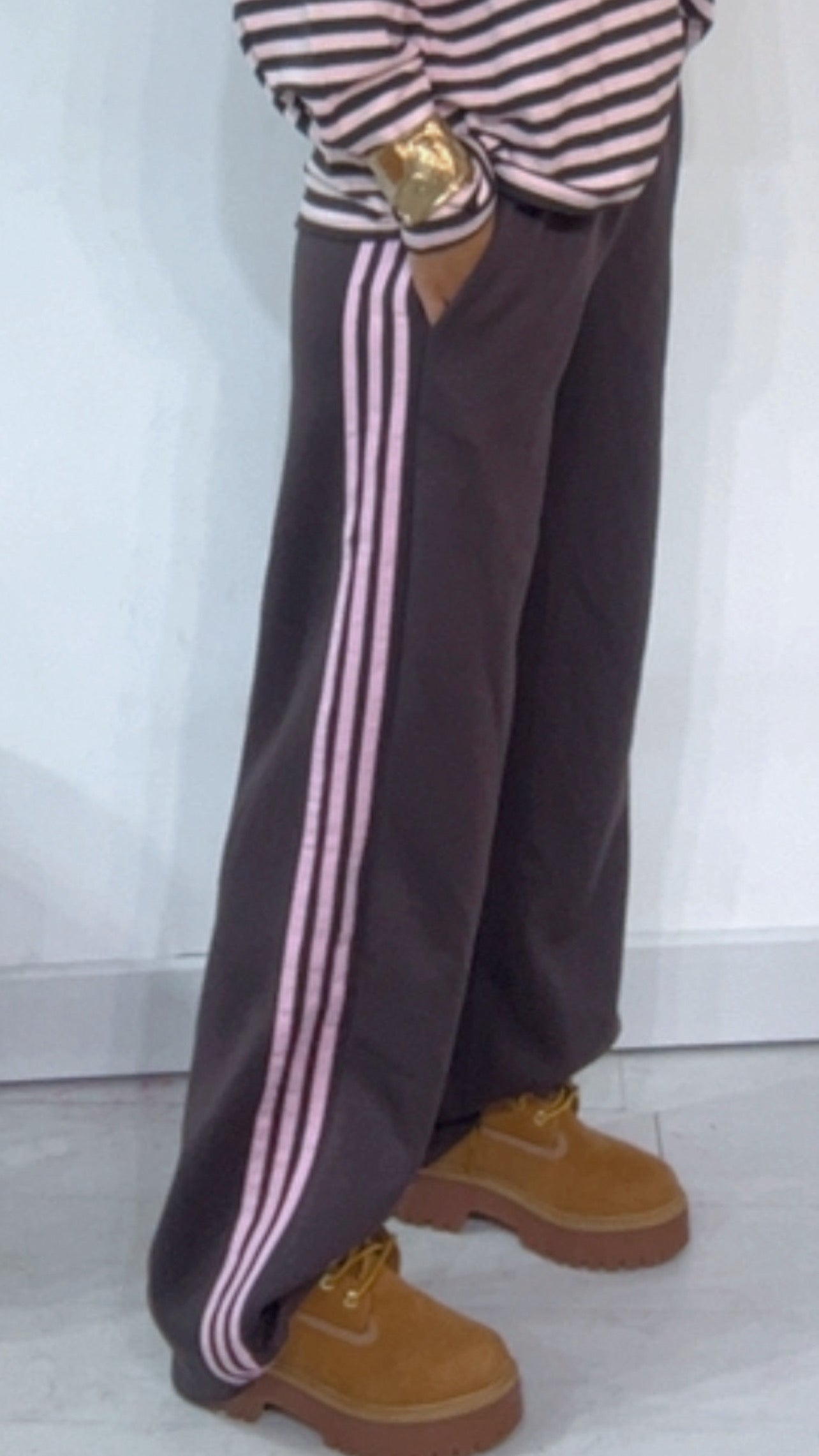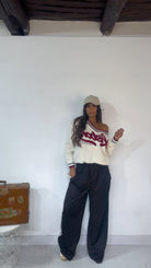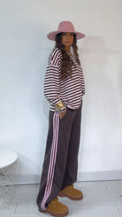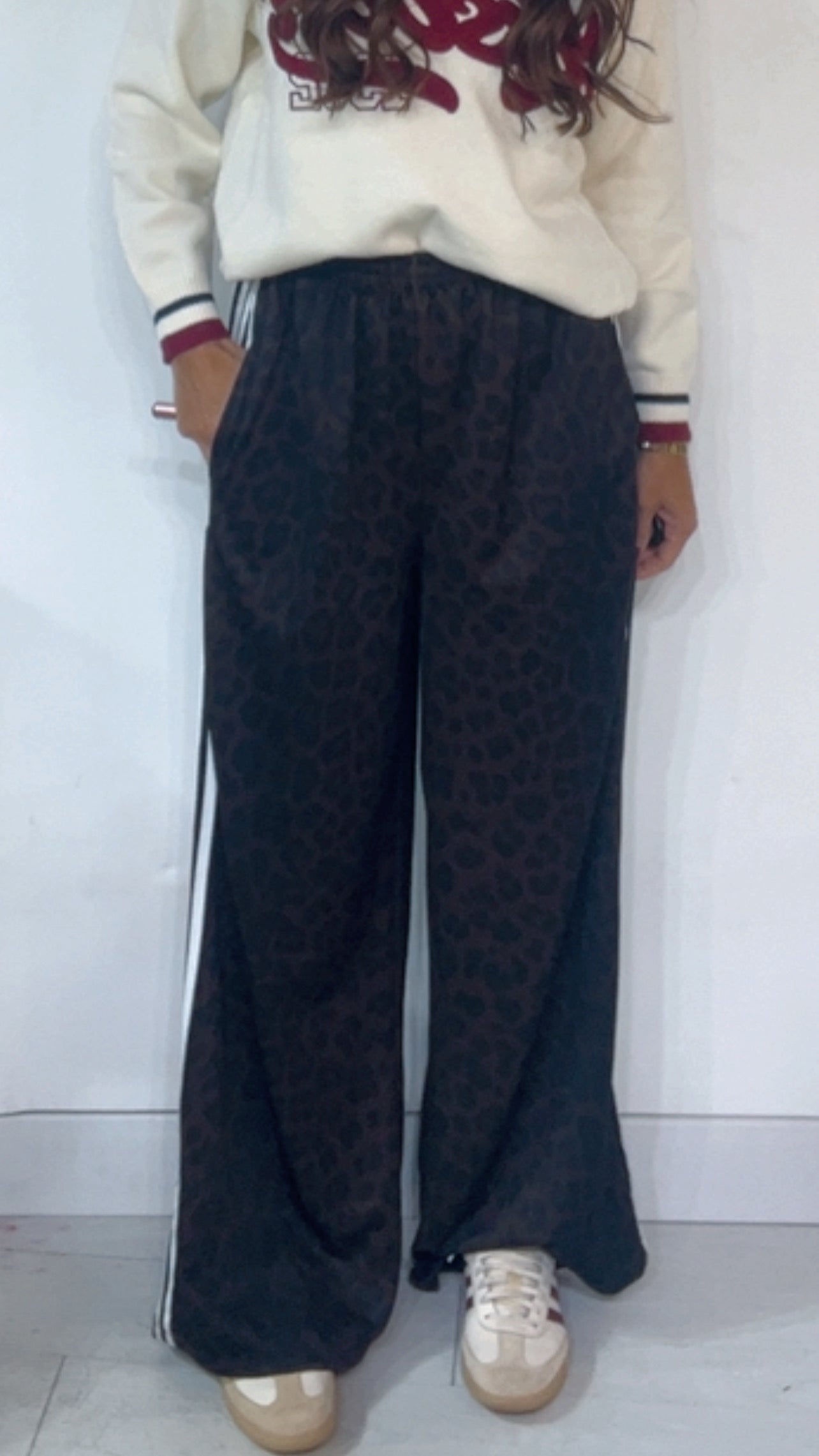 Pantalone da indossare sia vita alta/vita bassa con ‘Elastico’, ‘Banda Laterale’ a contrasto, con ‘Tasche’. Modello a Palazzo.