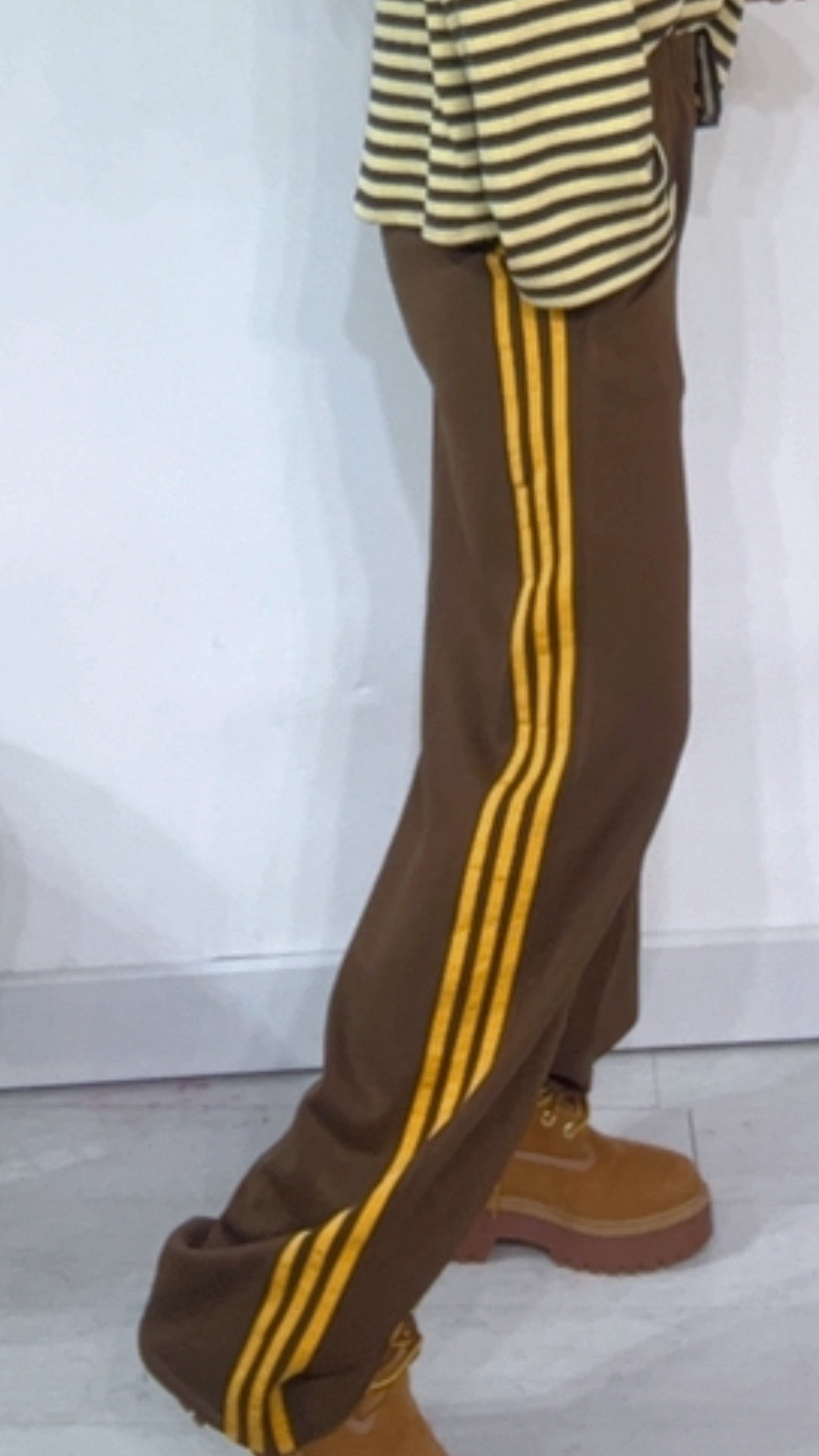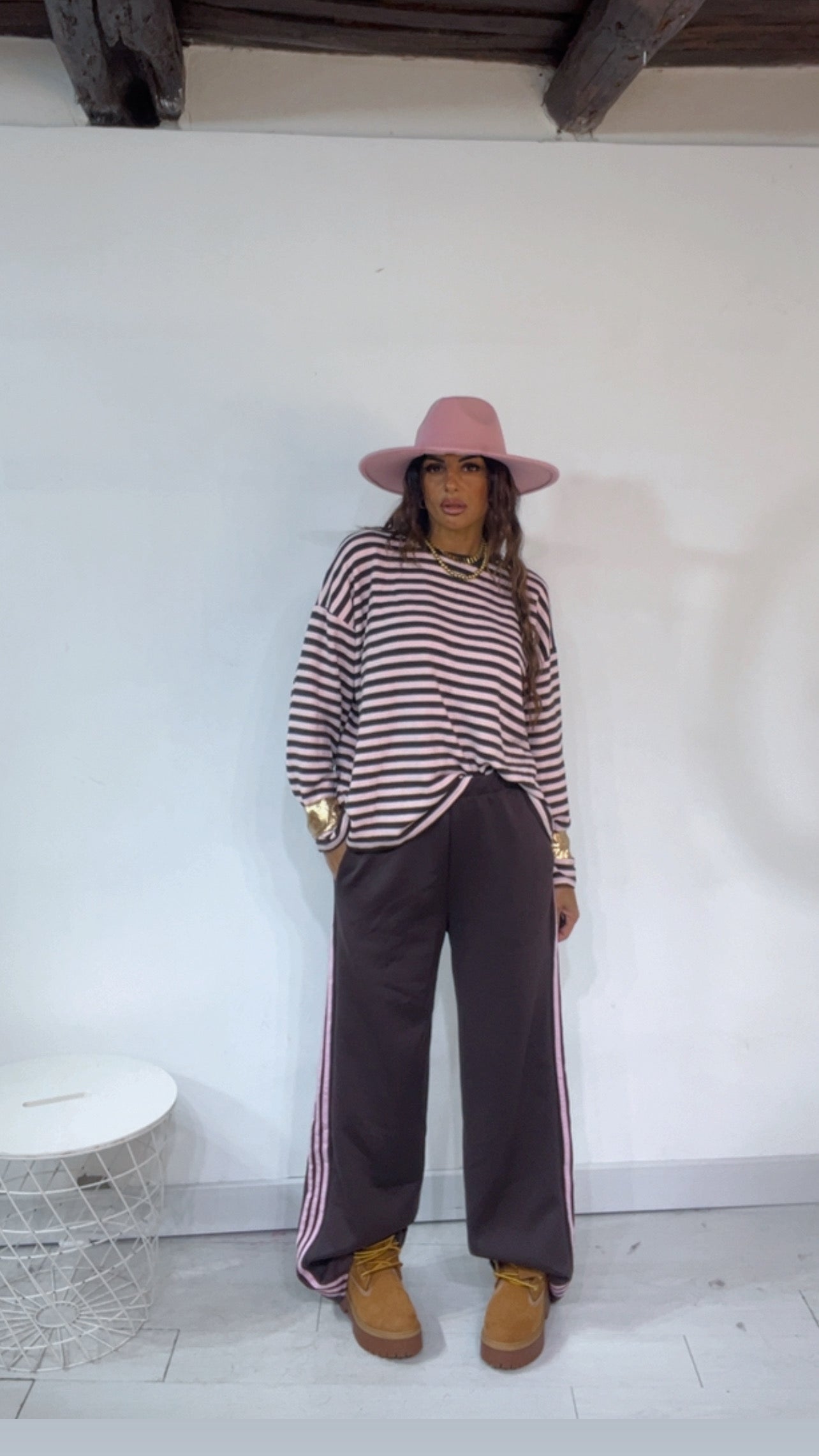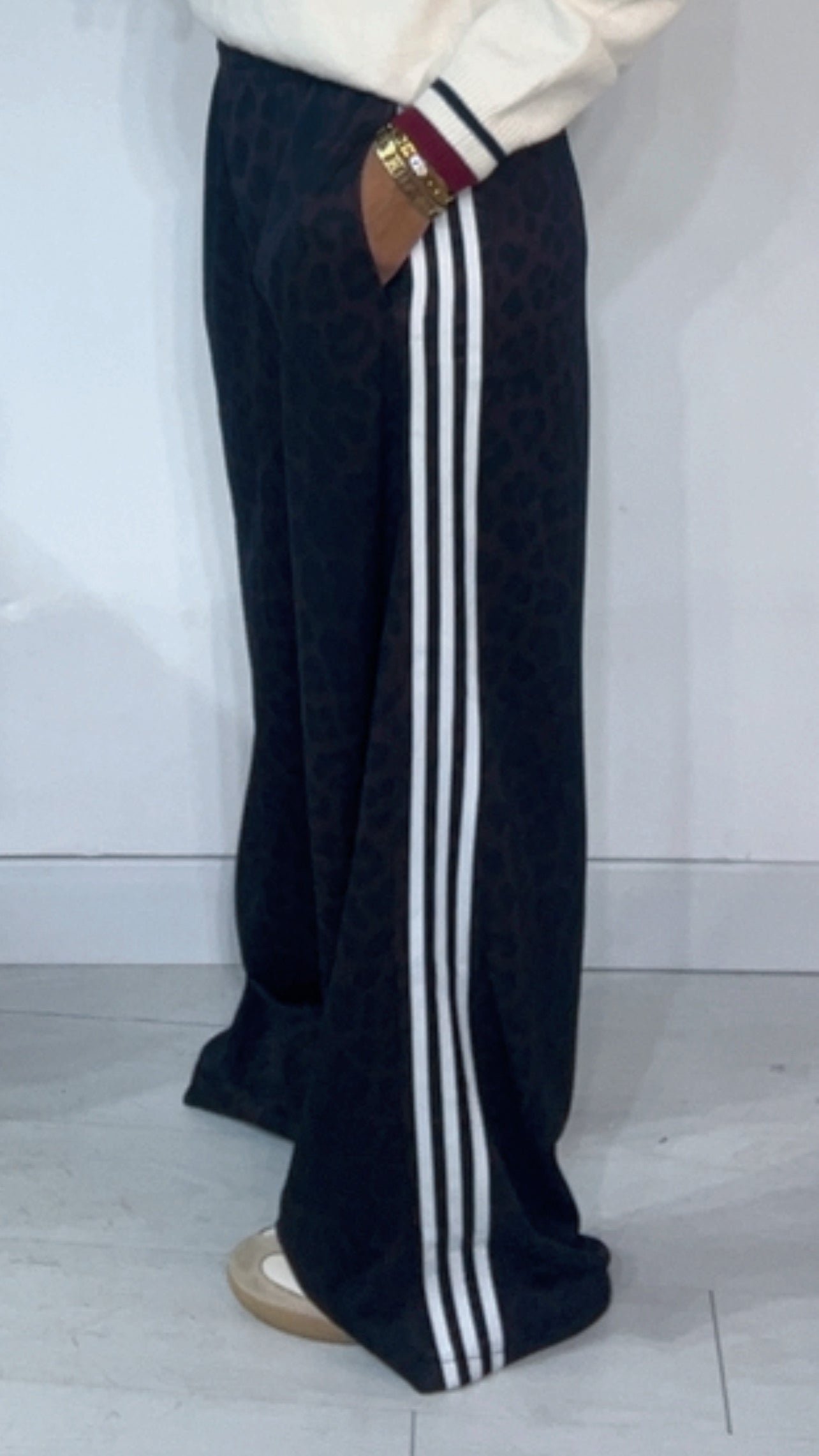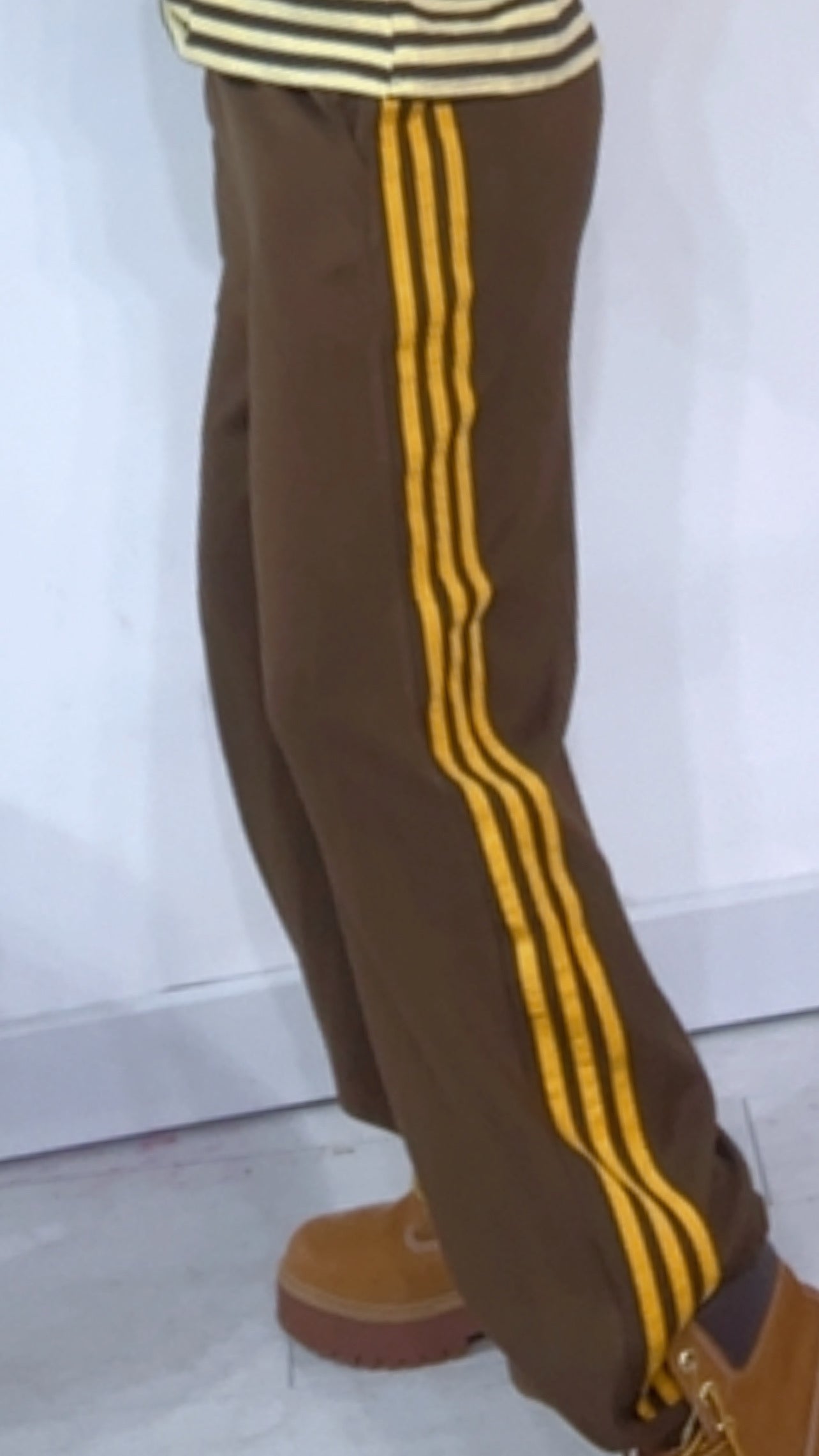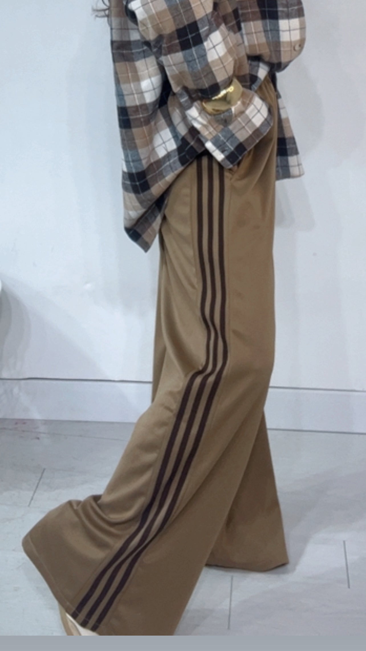 Pantalone da indossare sia vita alta/vita bassa con ‘Elastico’, ‘Banda Laterale’ a contrasto, con ‘Tasche’. Modello a Palazzo.