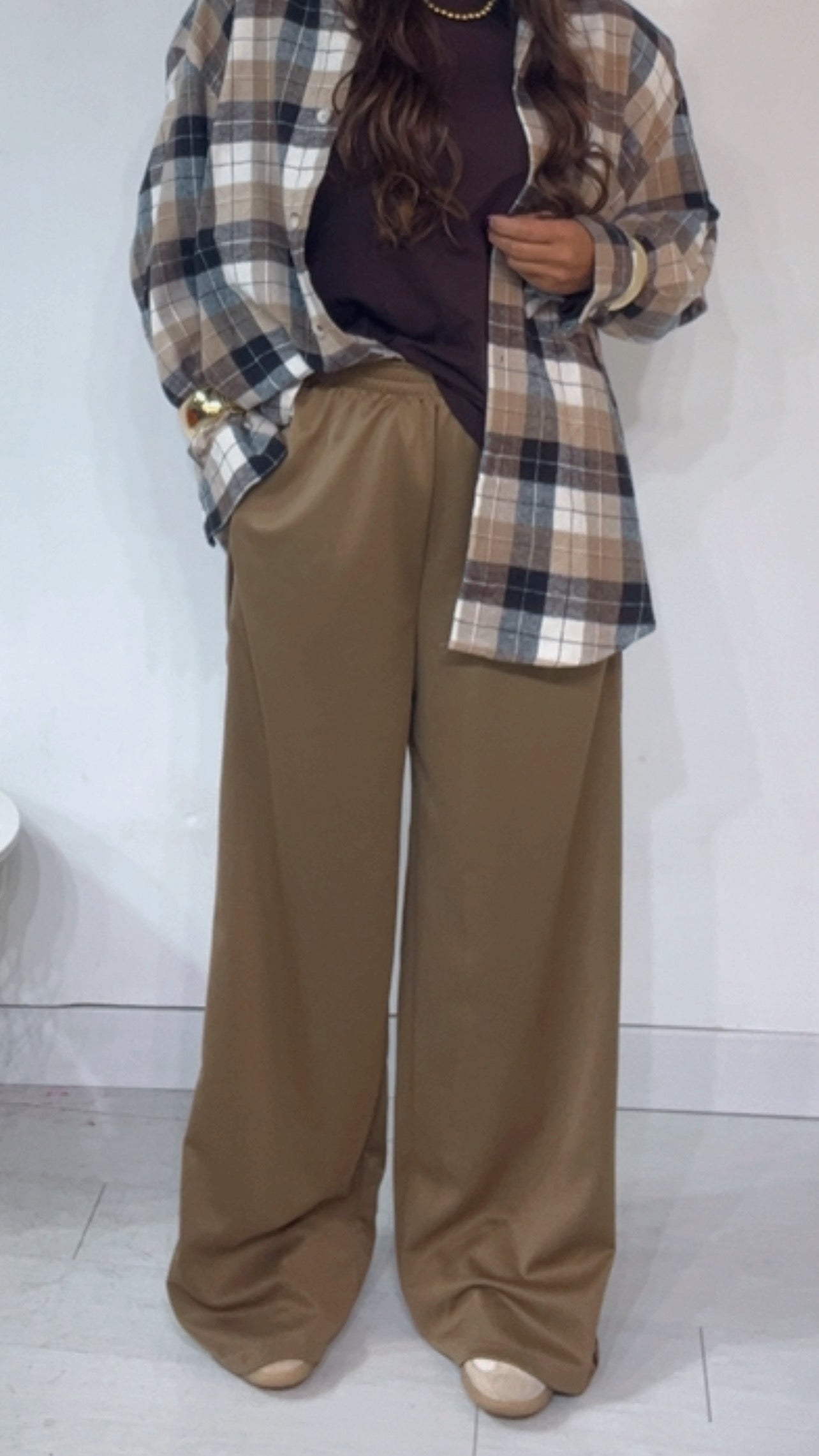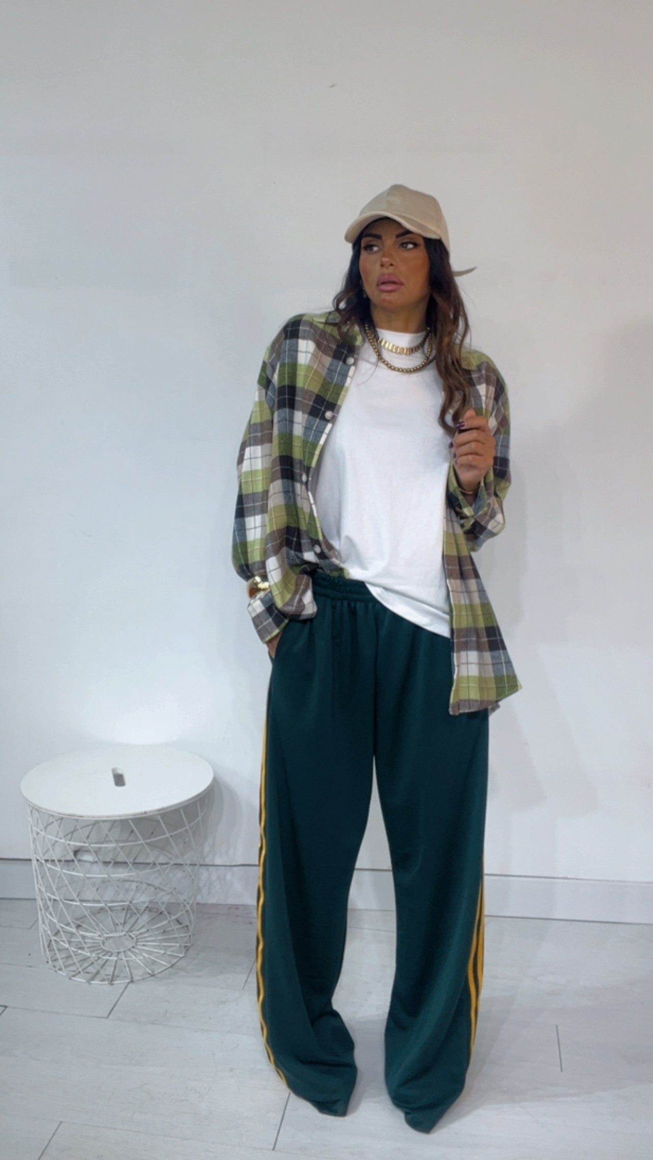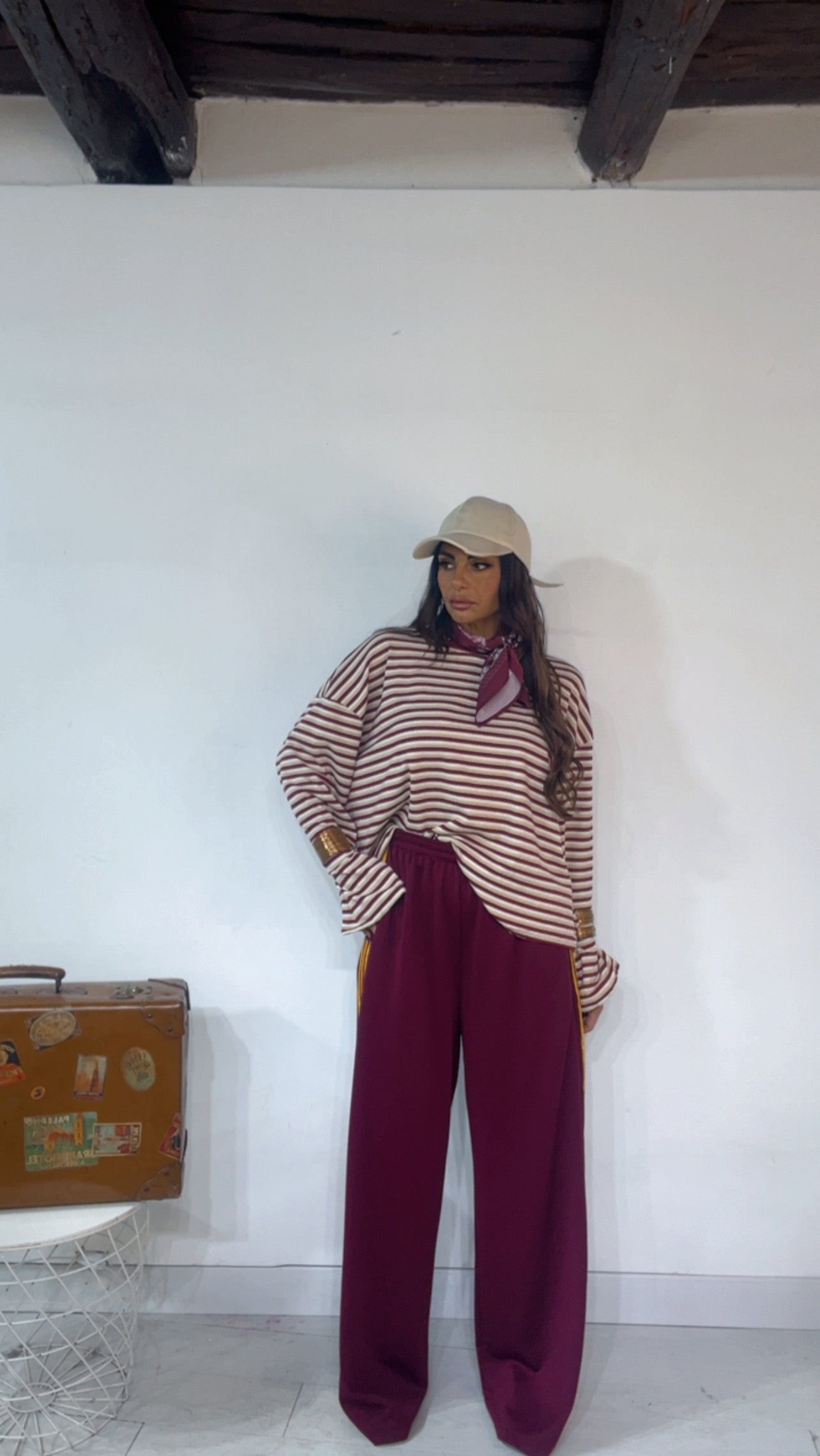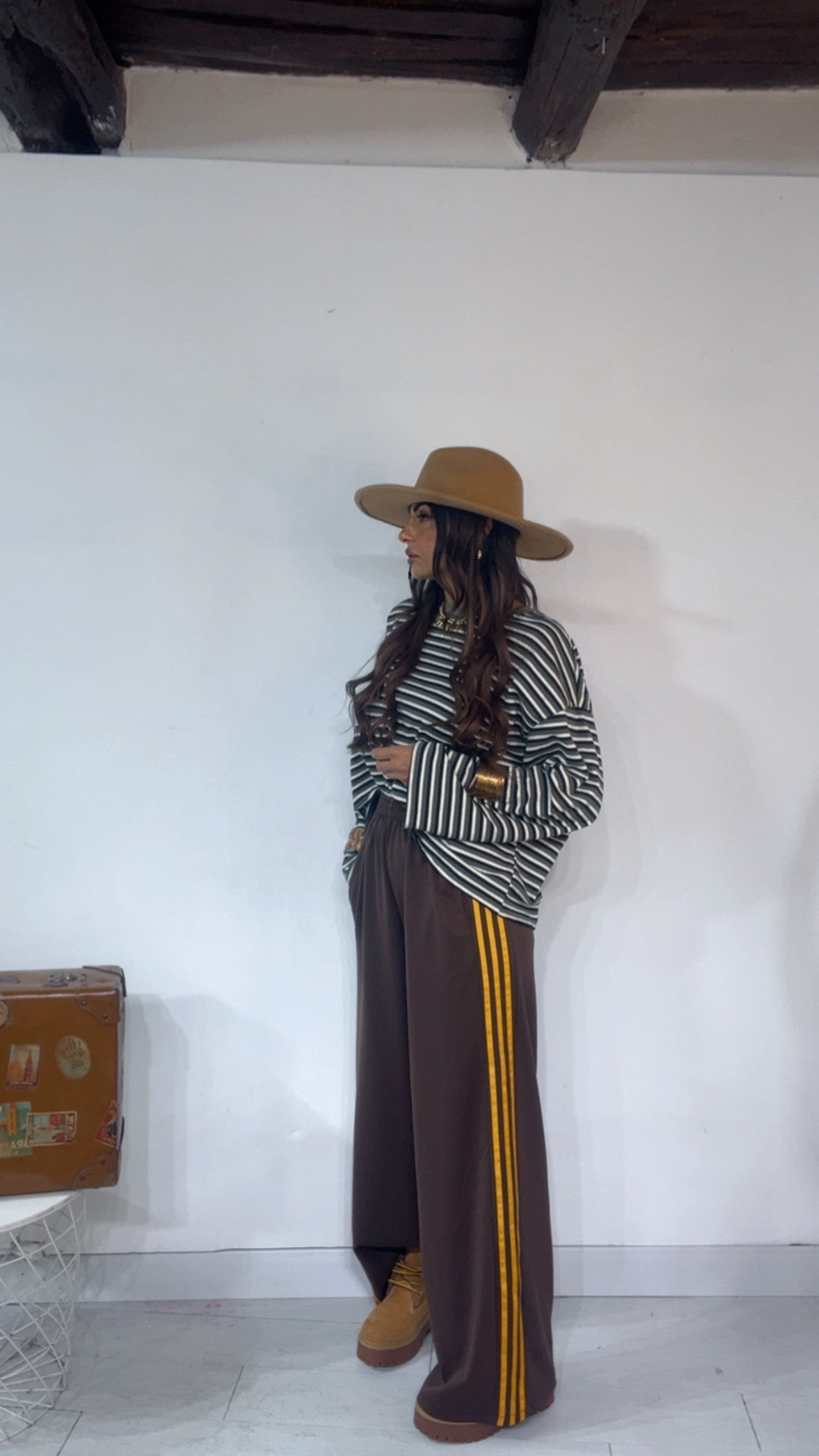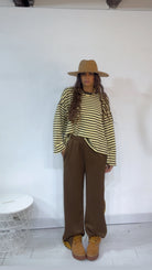 Pantalone da indossare sia vita alta/vita bassa con ‘Elastico’, ‘Banda Laterale’ a contrasto, con ‘Tasche’. Modello a Palazzo.