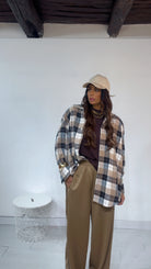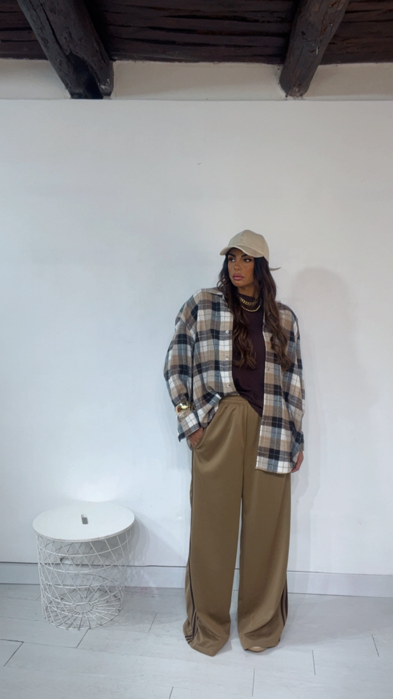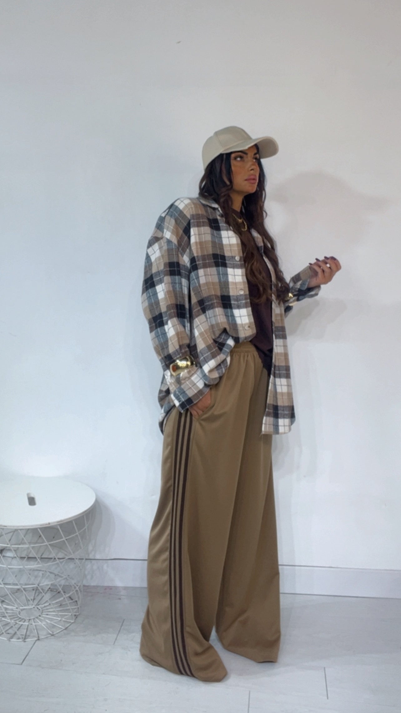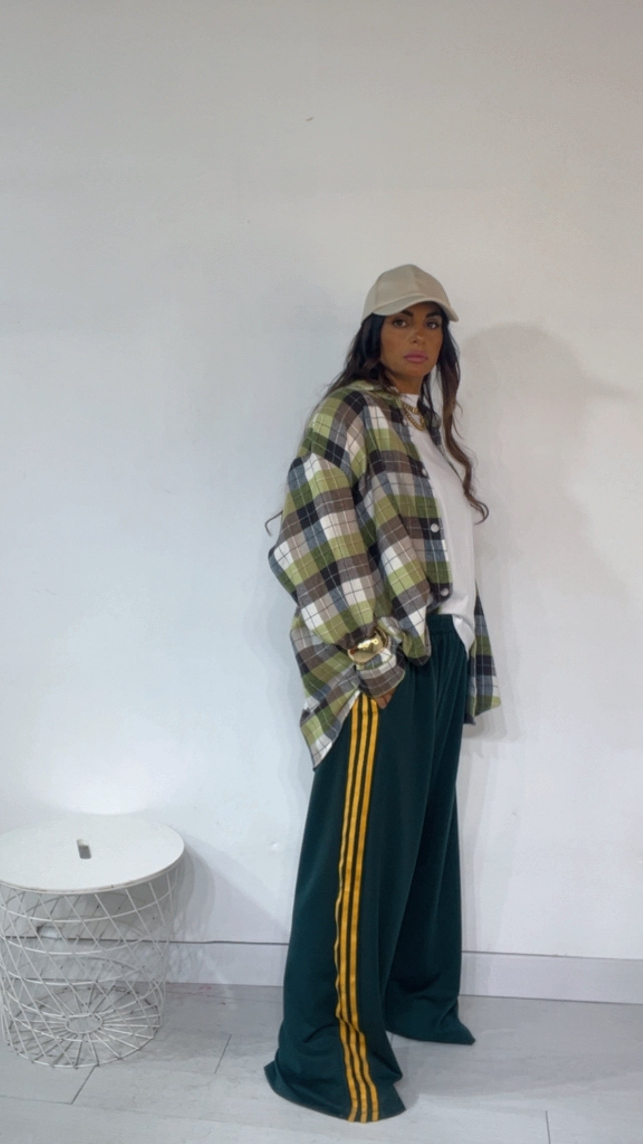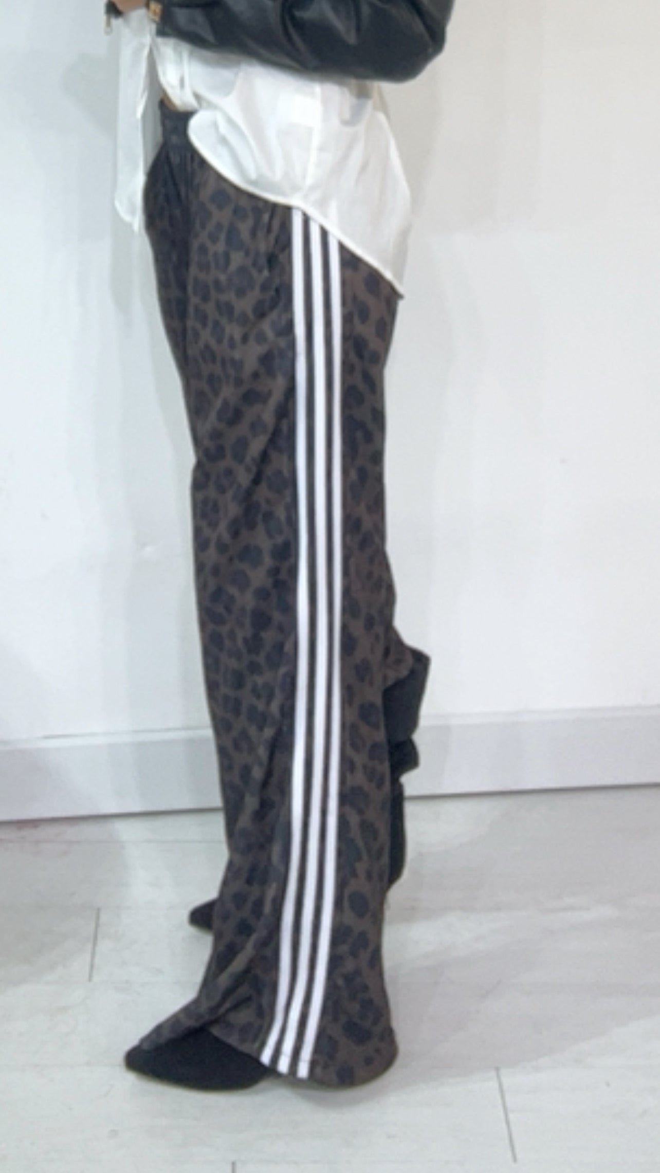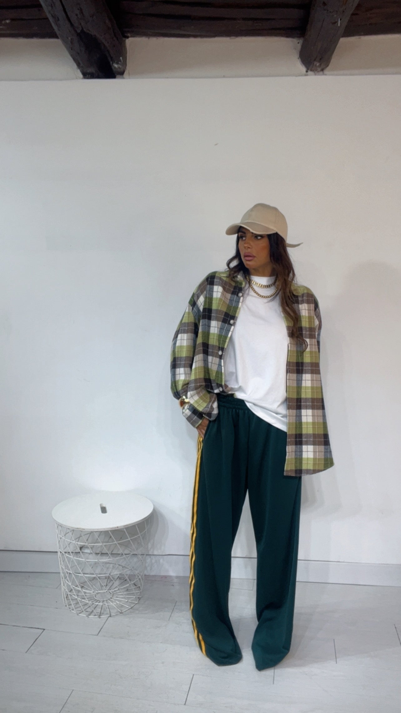 Pantalone da indossare sia vita alta/vita bassa con ‘Elastico’, ‘Banda Laterale’ a contrasto, con ‘Tasche’. Modello a Palazzo.